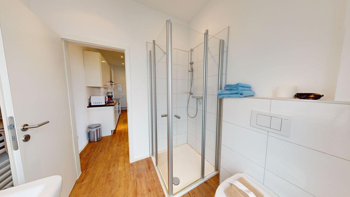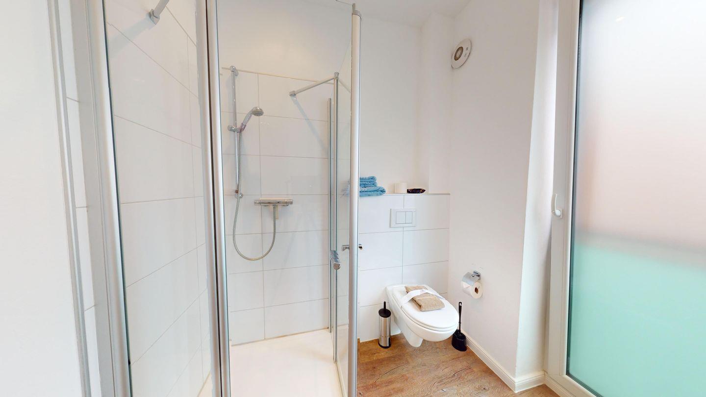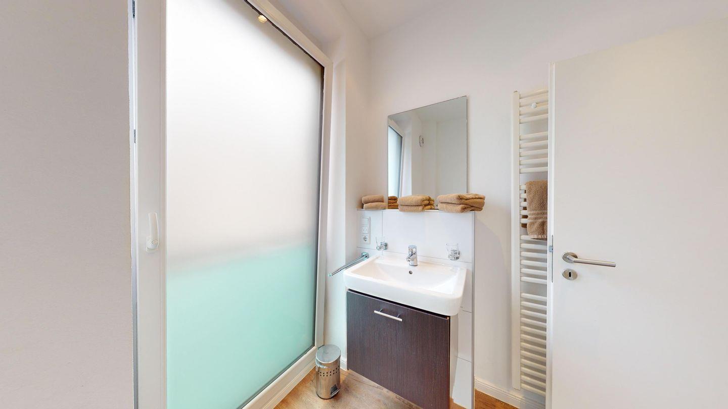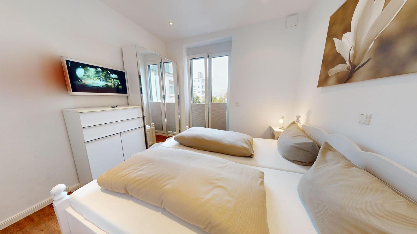 Bei der Innenausstattung wurde Wert auf helle und natürliche Farben gelegt. Das Schlafzimmer ist mit einem Doppelbett ausgestattet. Das Wohnzimmer bietet mit einer Schlafcouch eine weitere Schlafmöglichkeit für bis zu zwei Personen. Das Badezimmer ist mit einer Dusche und einem Handtuchtrockner eingerichtet. Die Wohnung verfügt über einen Balkon. Eine Waschmaschine und ein Wäschetrockner stehen im Haus (zur gemeinschaftlichen Nutzung ggf. gegen Gebühr) zur Verfügung. Hier darf auch der vierbeinige Freund mitkommen, denn die Ferienwohnung heißt auch Hunde herzlich willkommen. Erlaubt ist maximal 1 Hund (Höhe maximal kniehoch). Die Hundewiese befindet sich in der Nähe des Fährhafens (kein Leinenzwang).