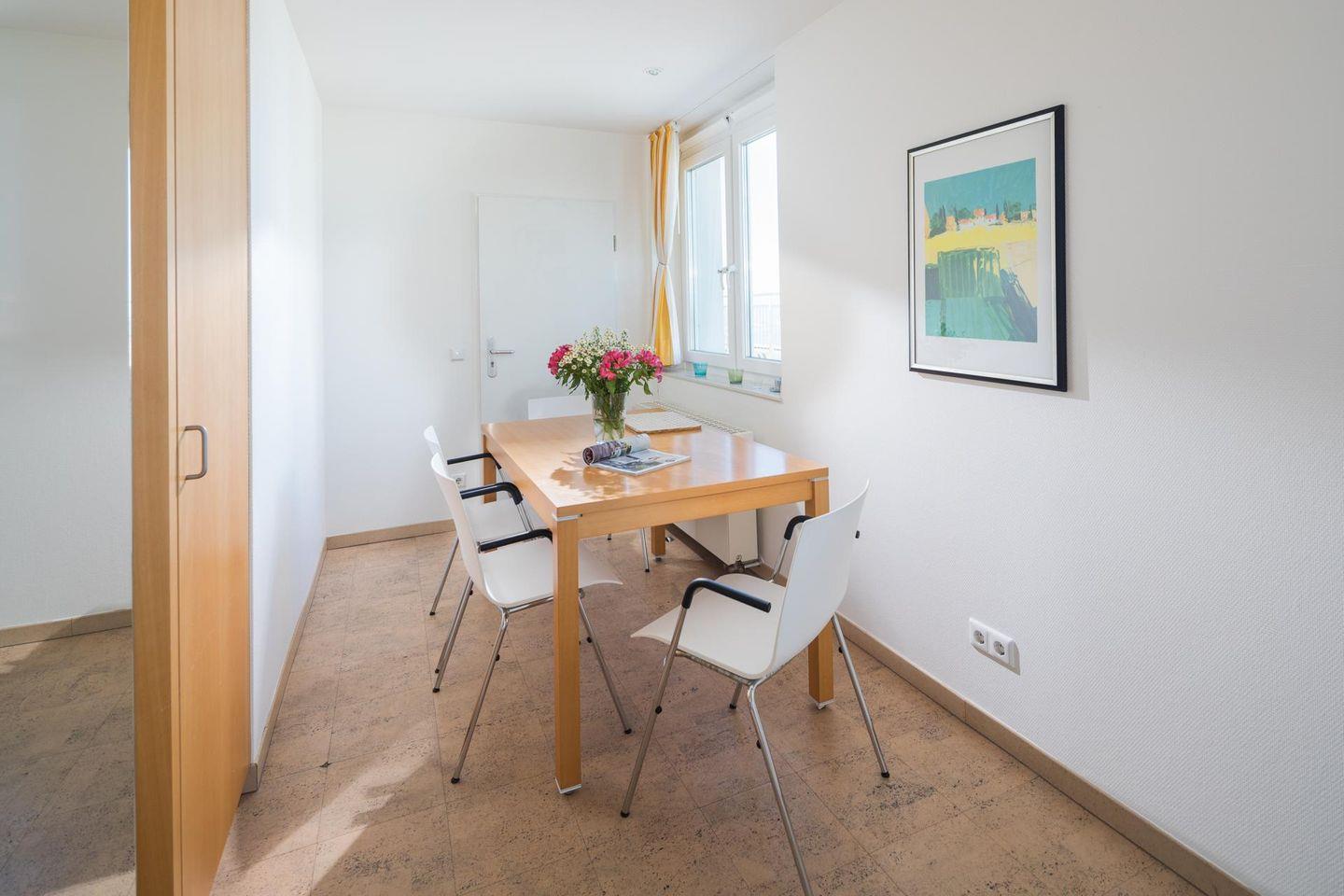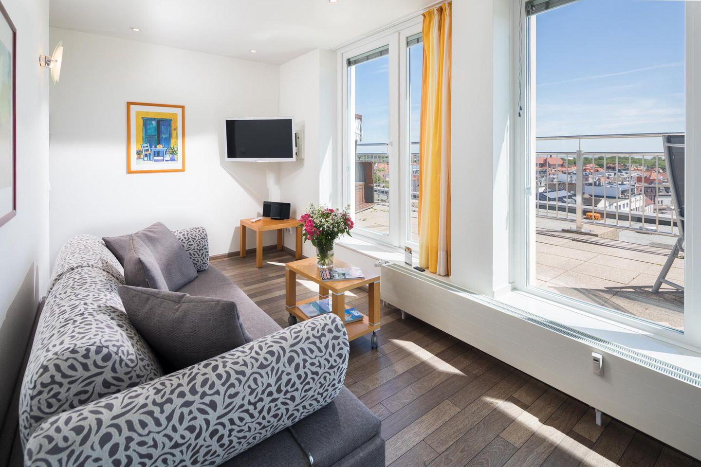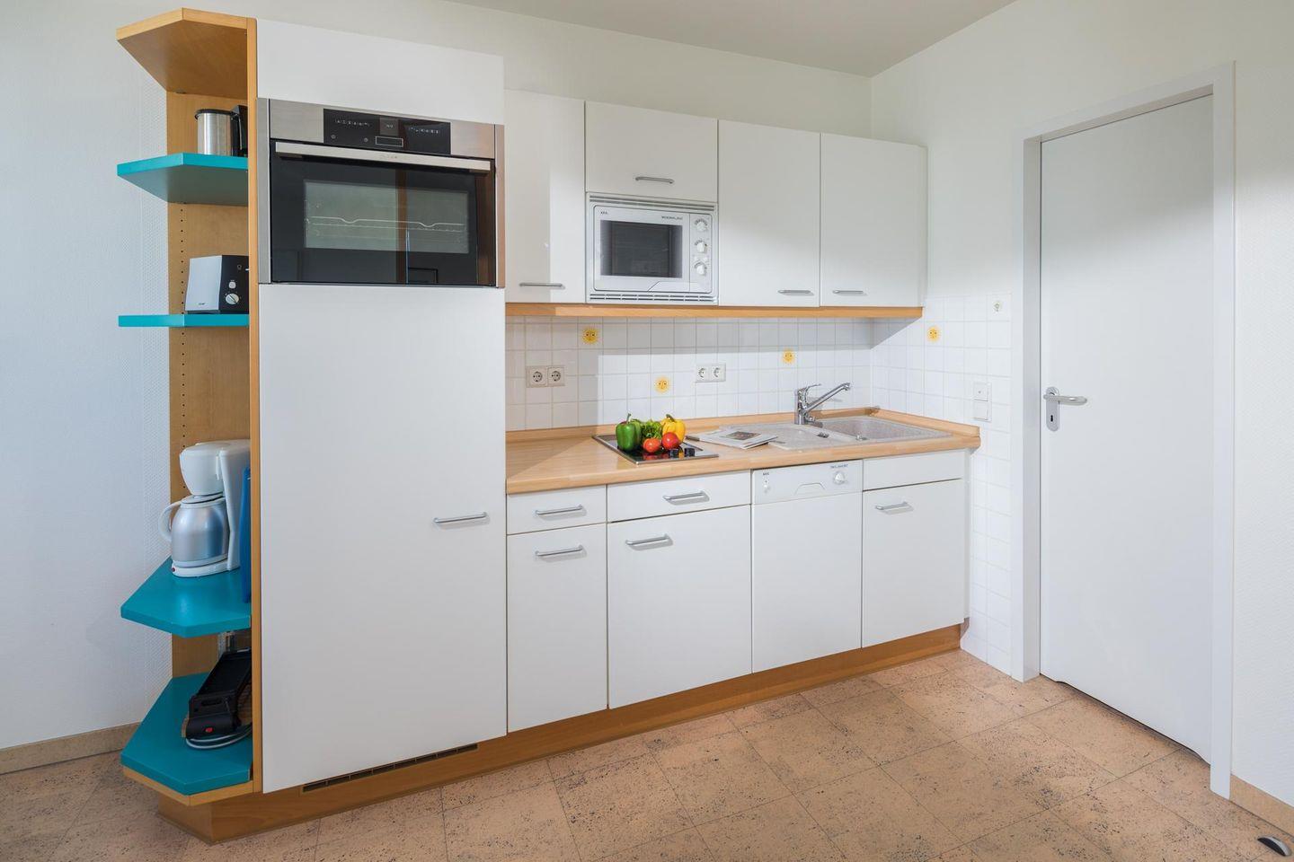 Die Wohnung ist mit einem modernen Küchen-/Essbereich ausgestattet und verfügt über ein Wohn-/Schlafzimmer mit einem Doppelbett und einer Schlafcouch. Das Badezimmer ist mit einer Dusche und einem WC ausgestattet. Ein Highlight ist die Südterrasse (Dachterrasse). Im Apartmenthaus "Kaiserhof" stehen den Bewohnern eine Waschmaschine und ein Wäschetrockner (beide mit Münzeinwurf) zur Verfügung. Zusätzlich steht eine Sauna bereit, die ebenfalls gegen Münzeinwurf nutzbar ist. Es ist zu beachten, dass das Schwimmbad aufgrund eines technischen Defektes geschlossen ist. Fahrräder können vor dem Haus (Nordseite) oder im Fahrradraum abgestellt werden. Hier darf auch der vierbeinige Freund mitkommen, denn die Ferienwohnung heißt auch Hunde herzlich willkommen. Erlaubt ist maximal 1 Hund (Höhe maximal kniehoch). Die Hundewiese befindet sich in der Nähe des Fährhafens (kein Leinenzwang).