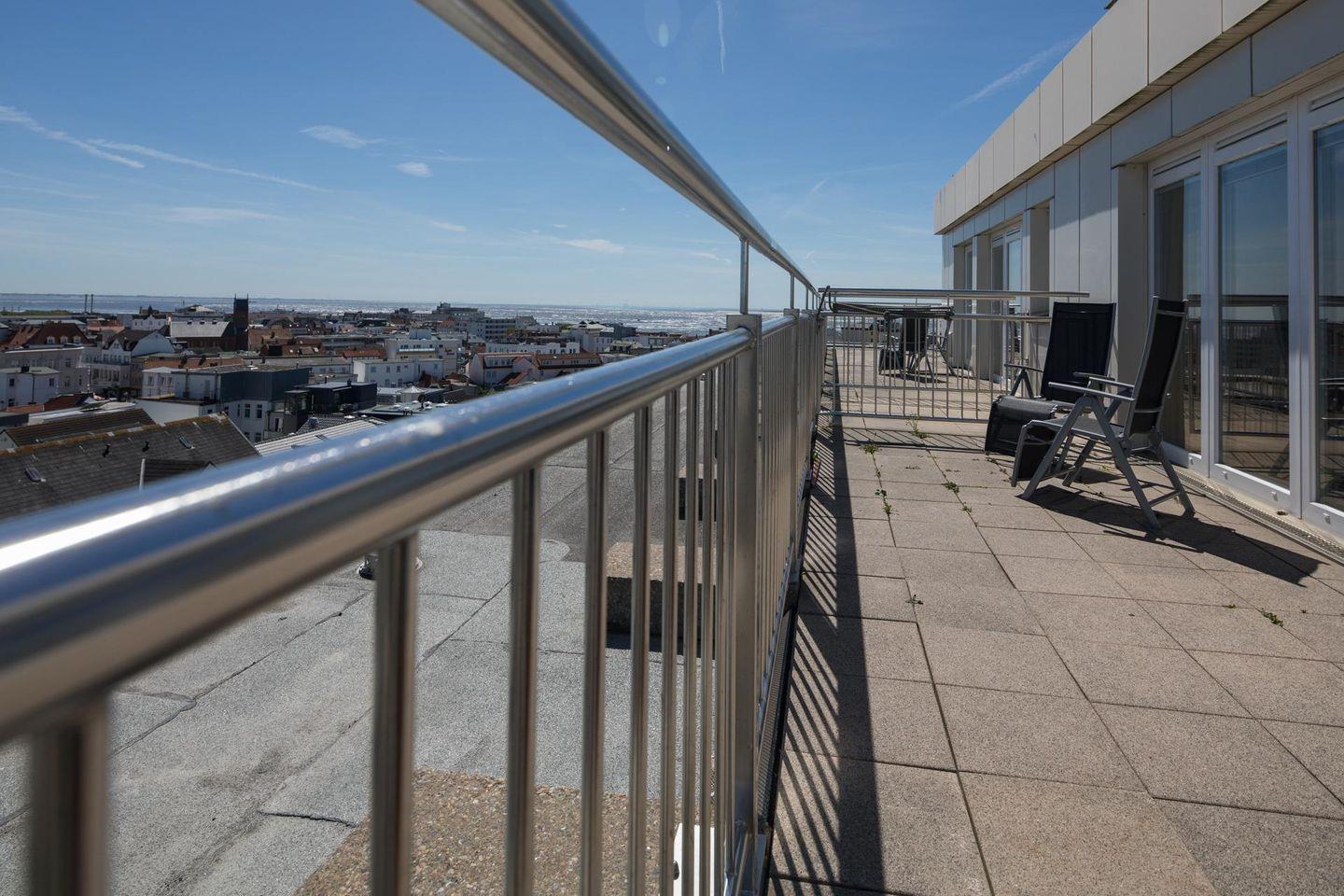 Die Ferienwohnung "Kaiserhof 93 (Penthouse)" befindet sich im Apartmenthaus "Kaiserhof", das an der Ecke Bismarckstraße und Kaiserstraße liegt. Das Haus liegt direkt am Meer, nur wenige Schritte vom Strand entfernt. Die Wohnung befindet sich im achten Stock und bietet Platz für bis zu 2 Personen. Im Haus gibt es einen Fahrstuhl.