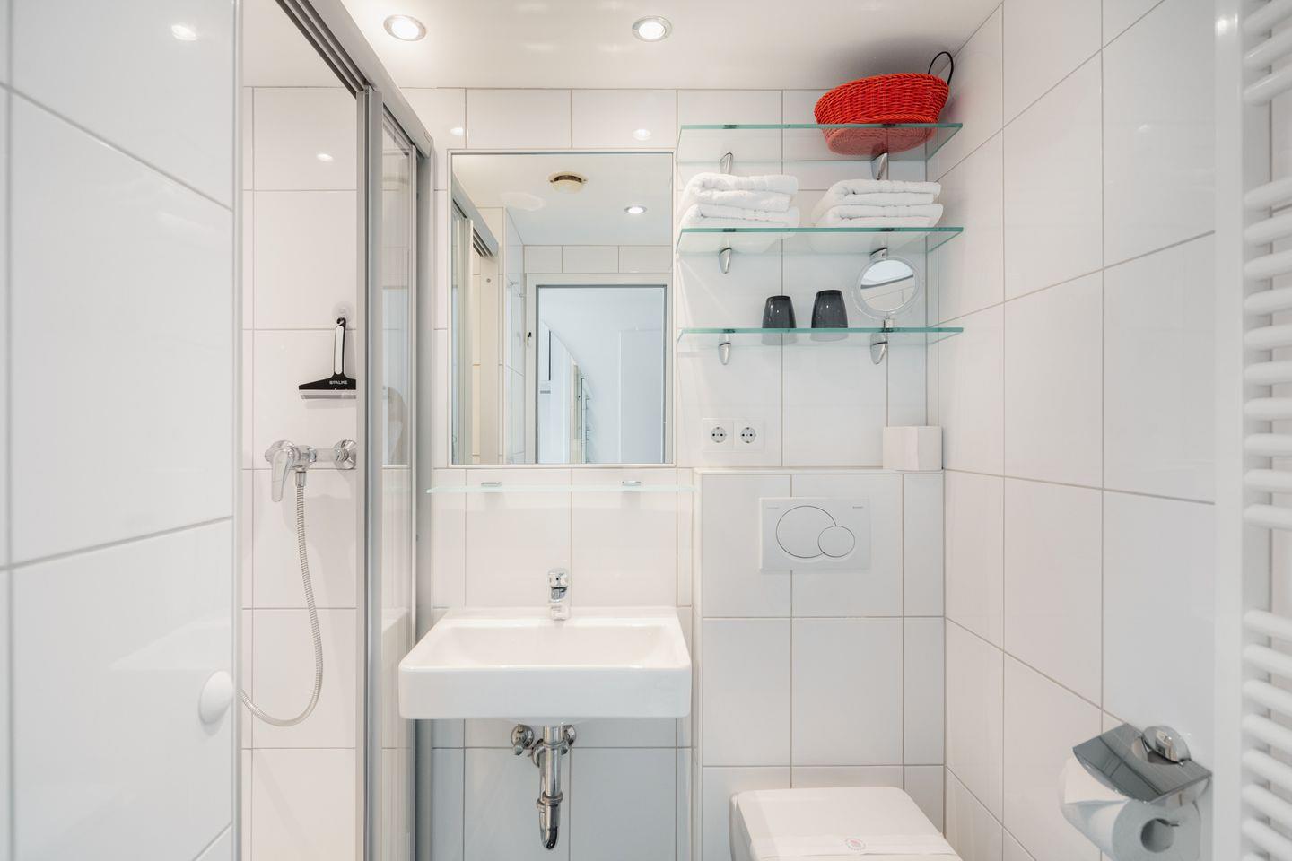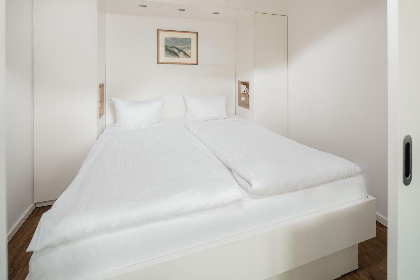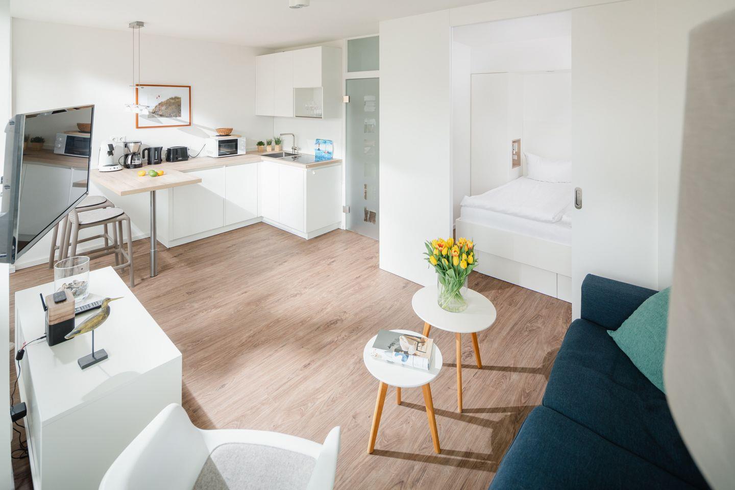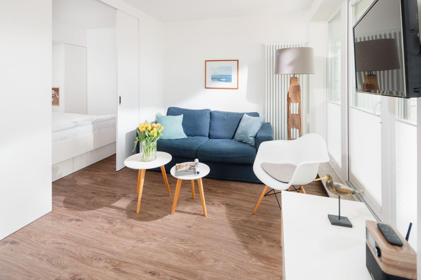 Die Wohnung bietet einen Schlafbereich, welcher mit einem Boxspringbett (1,80m x 2,00m) ausgestattet ist. Der Wohnbereich ist mit einer kleinen Couch und einem schwenkbaren Flachbild-TV eingerichtet. Die moderne (offene) Küche bietet neben einer klassischen Kaffeemaschine auch eine Senseo-Kaffeemaschine sowie einen Toaster und eine Spülmaschine. Der Balkon liegt nach Westen und bietet einen seitlichen Meerblick. Im Apartmenthaus "Kaiserhof" stehen den Bewohnern eine Waschmaschine und ein Wäschetrockner (beide mit Münzeinwurf) zur Verfügung. Zusätzlich steht eine Sauna bereit, die ebenfalls gegen Münzeinwurf nutzbar ist. Es ist zu beachten, dass das Schwimmbad aufgrund eines technischen Defektes geschlossen ist. Fahrräder können vor dem Haus (Nordseite) oder im Fahrradraum abgestellt werden. Hunde sind in dieser Wohnung nicht erlaubt.