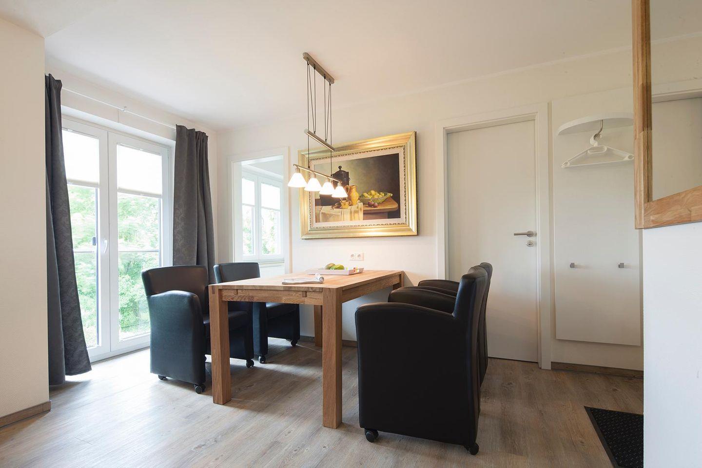 Die Wohnung Anna 3 verfügt über zwei Schlafzimmer, die jeweils mit einem Doppelbett ausgestattet sind. Weiter verfügt die Wohnung Anna 3 über 2 Badezimmer, was besonders für Familien oder Gruppen von Vorteil ist. Im 1. Stock befindet sich das Wohnzimmer mit integriertem Küchenbereich und im Dachgeschoss liegen die beiden Schlafzimmer. Ein Babybett (ist buchbar) ist vorhanden. Dieses kann, wenn gewünscht, im Schlafzimmer aufgestellt werden. Die Wohnung verfügt über WLAN, TV und einen Haartrockner. Zudem sind Waschmaschine und Trockner (gemeinschaftlich gegen Bezahlung nutzbar) in dem Haus (im Keller) vorhanden, was besonders für längere Aufenthalte und Familien mit Kindern von Vorteil ist. Fahrräder können hinter dem Haus (Treppe Keller runter) abgestellt werden. Direkt vor dem Haus befindet sich ein Spielplatz. Hunde sind in dieser Wohnung nicht erlaubt.