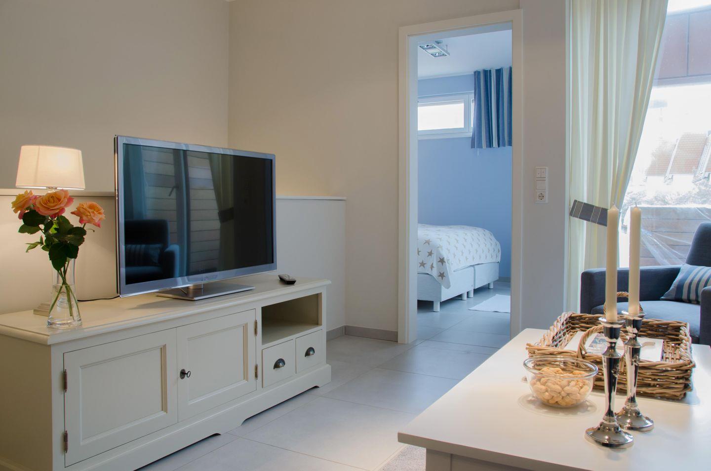 Im Hochparterre der Wohnung befindet sich das Wohnzimmer mit einer integrierten Küchenzeile. Vom Wohnzimmer aus gelangt man auf den Balkon. Weiterhin gibt es dort ein Schlafzimmer (mit einem Doppelbett) sowie ein Badezimmer mit Dusche und WC. Die Wohnung erstreckt sich auch über das Untergeschoss, in dem ein weiteres Schlafzimmer (mit einem Doppelbett) mit angeschlossenem Badezimmer (Dusche/WC) zur Verfügung steht. Fahrräder können im Keller abgestellt werden. Eine Waschmaschine und ein Wäschetrockner stehen (für die gemeinschaftliche Nutzung) gegen Münzeinwurf zur Verfügung. Hunde sind in dieser Ferienwohnung nicht erlaubt.