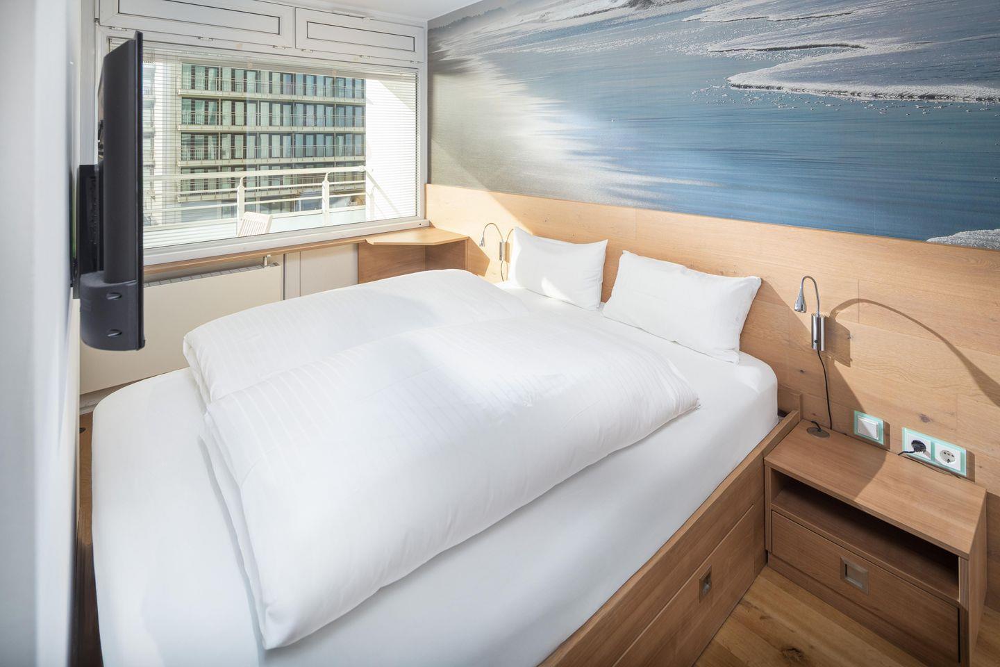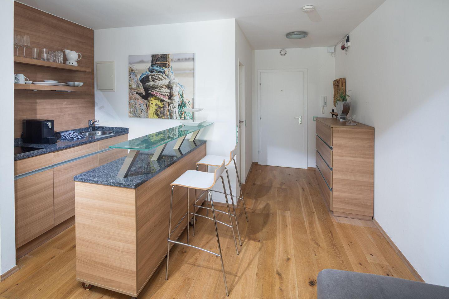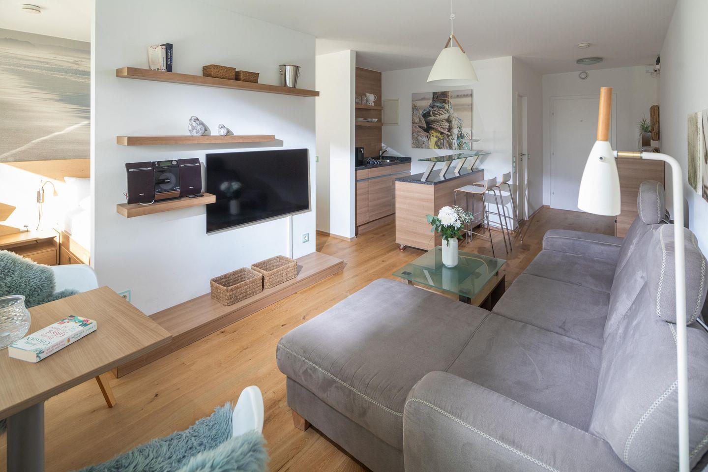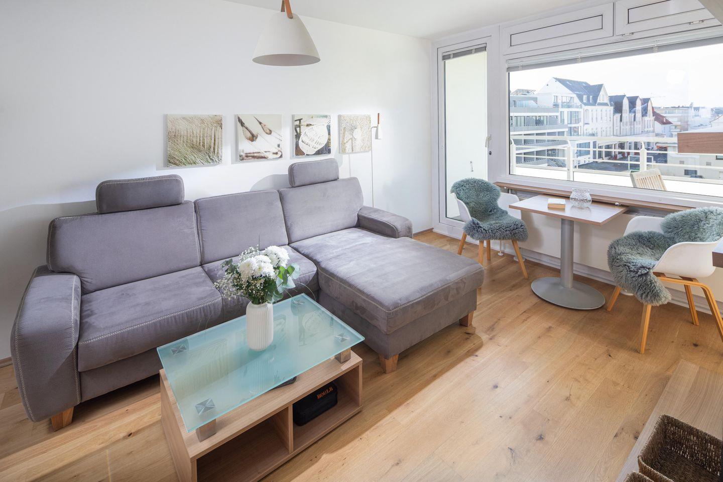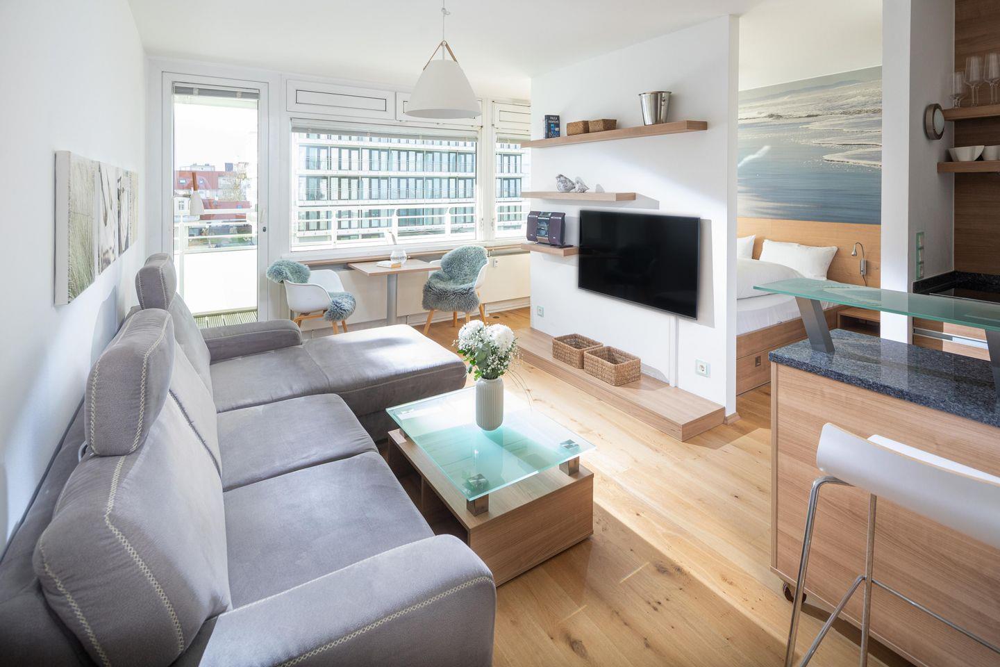 Bei der Innenausstattung der Wohnung wurde Wert auf eine moderne Einrichtung gelegt. Die Wohnung verfügt über einen Wohn-Schlaf-Bereich und ist mit einem Doppelbett ausgestattet. Die Küchenzeile ist voll eingerichtet. Der Balkon ist mit einem Holzbelag und vier Terrassenstühlen ausgestattet. Waschmaschine und Wäschetrockner befinden sich im Haus und stehen (für die gemeinschaftliche Nutzung gegen Münzeinwurf) zur Verfügung, was besonders für längere Aufenthalte von Vorteil ist. Hier darf auch der vierbeinige Freund mitkommen, denn die Ferienwohnung heißt auch Hunde herzlich willkommen. Erlaubt ist maximal 1 Hund (Höhe maximal kniehoch). Die Hundewiese befindet sich in der Nähe des Fährhafens (kein Leinenzwang).