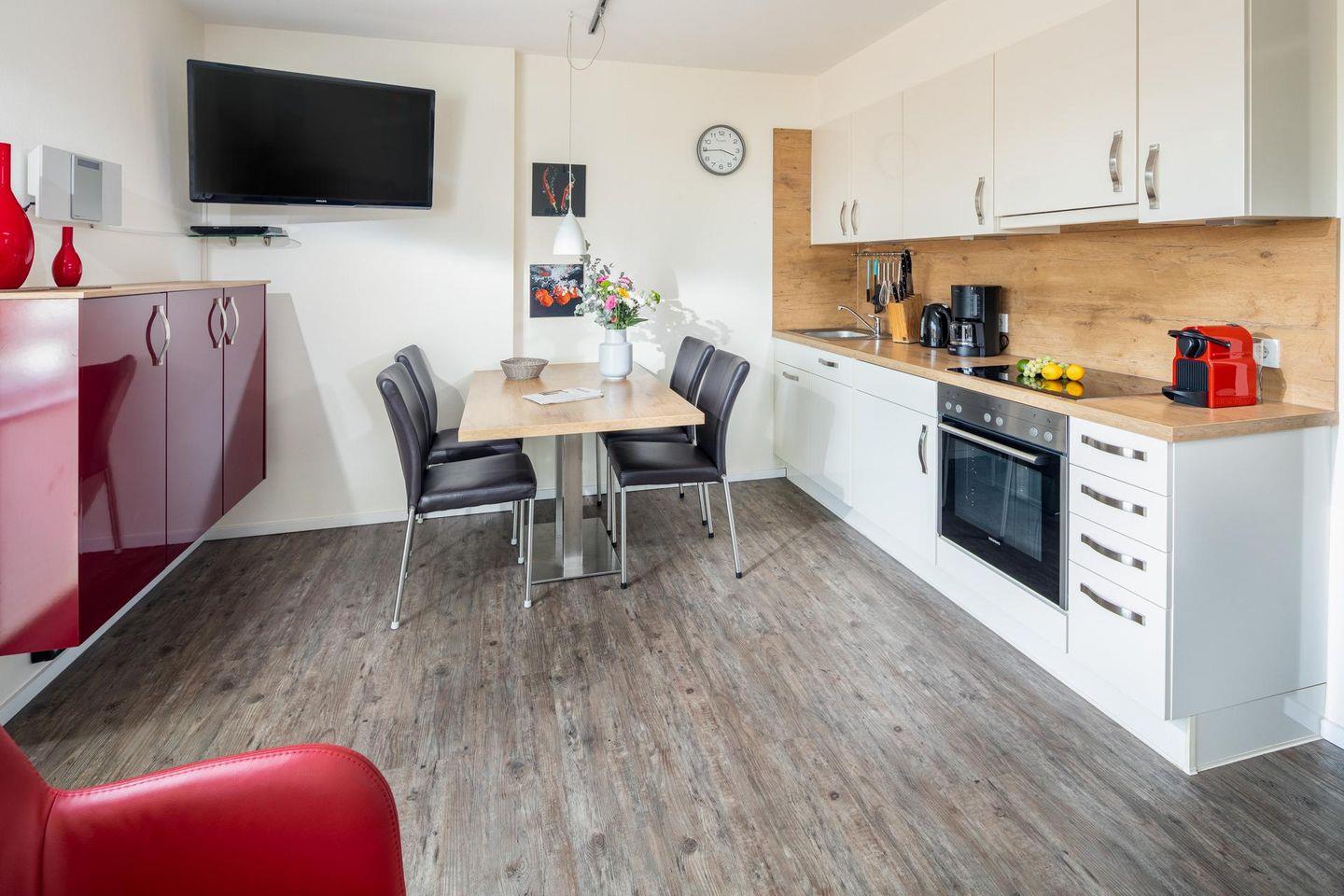 Die Ferienunterkunft eignet sich aufgrund des Raumkonzeptes auch für Gruppen von bis zu 4 Personen. Sie verfügt über zwei Schlafzimmer, die jeweils mit Doppelbetten (1,80 x 2,00m) eingerichtet sind. Jedes Schlafzimmer ist außerdem mit einem Fernsehgerät ausgestattet. Insgesamt stehen drei Fernsehgeräte zur Verfügung, darunter auch ein Fernseher mit smart -TV im Wohnzimmer (zusätzlich stehen DVD/Blue-Ray-Player zur Verfügung sowie eine Wlan-Stereoanlage mit DAB+, Bluetooth und USB-Anschluss).