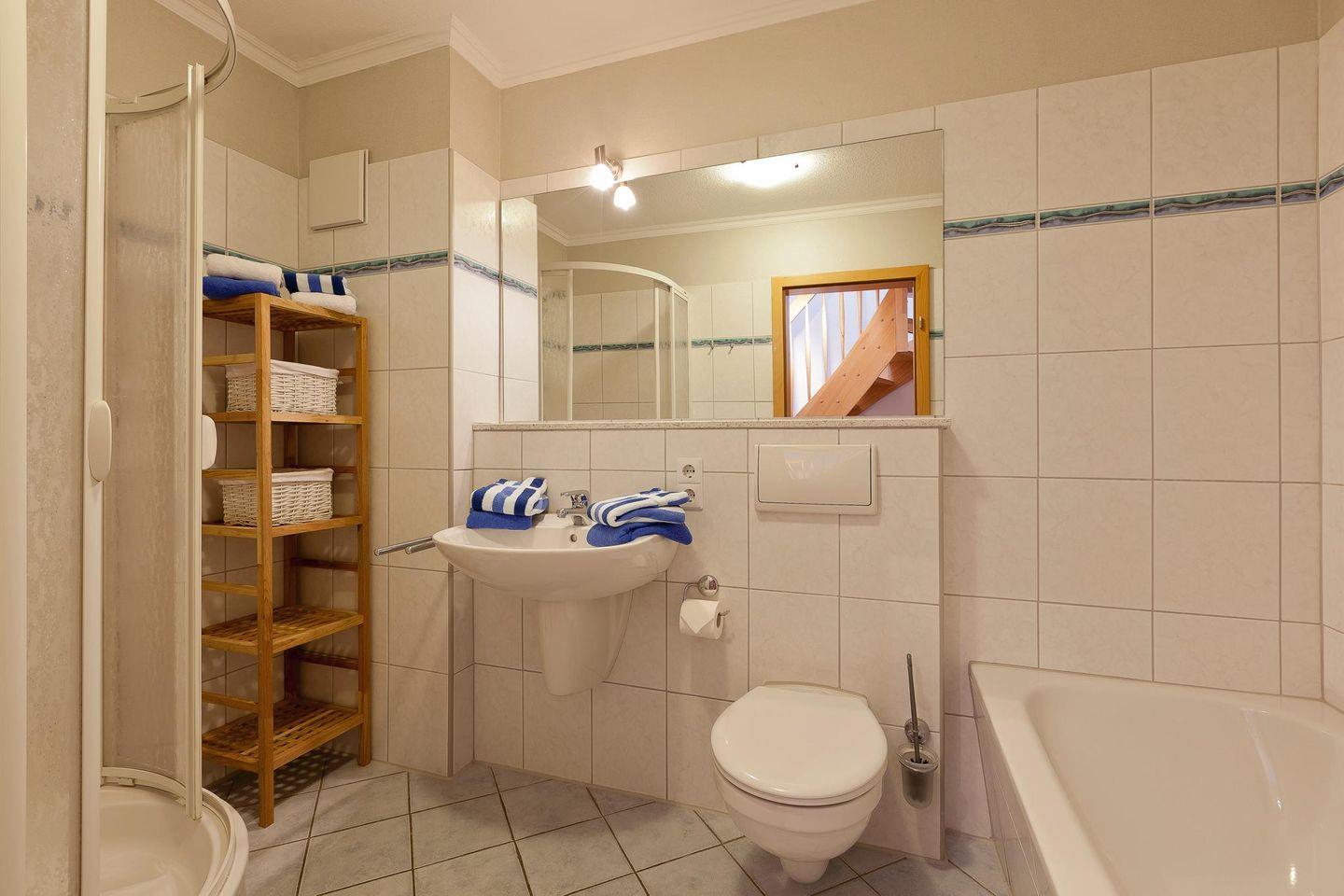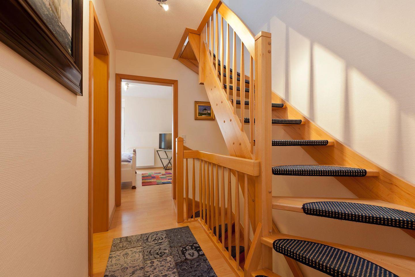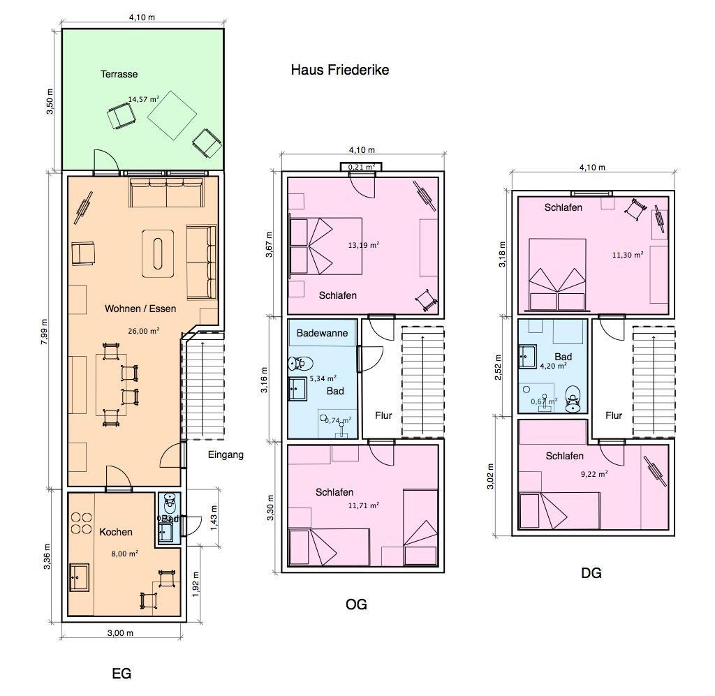 Das Haus verfügt über ingesamt 4 Schlafzimmer und zwei Badezimmer und ein separates WC. Ein Schlafzimmer ist mit einem Boxspringbett (1,80 m breit) ausgestattet, ein weiteres mit zwei Einzelbetten, ein drittes mit einem Boxspringbett (1,60 m breit) und das letzte Schlafzimmer mit einem Einzelbett. Beim Innendesign des Hauses wurde Wert auf natürliche Farben und Materialien gelegt. Das Haus hat zudem vier Fernseher. Die Terrasse des Ferienhauses "Friederike" liegt nach Süd-Westen ausgerichtet. Das Grillen ist hier nicht erlaubt. Es besteht die Möglichkeit, einen Hund mitzubringen (maximal ein Hund, kniehoch). Die Hundewiese befindet sich in der Nähe des Fährhafens (kein Leinenzwang). Die Ruhezeiten ab 22 Uhr sind hier einzuhalten.