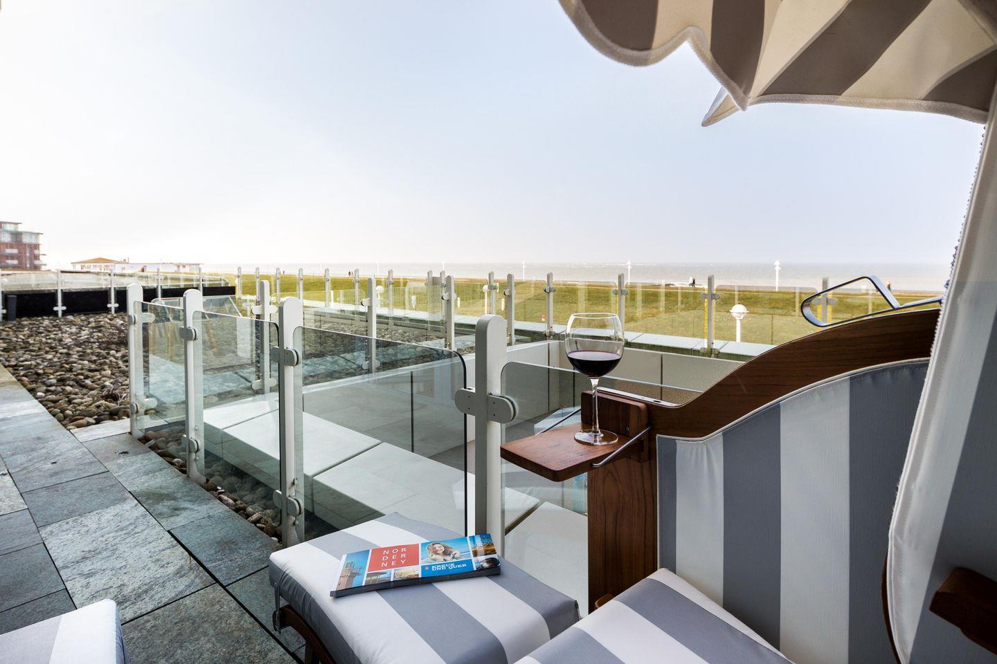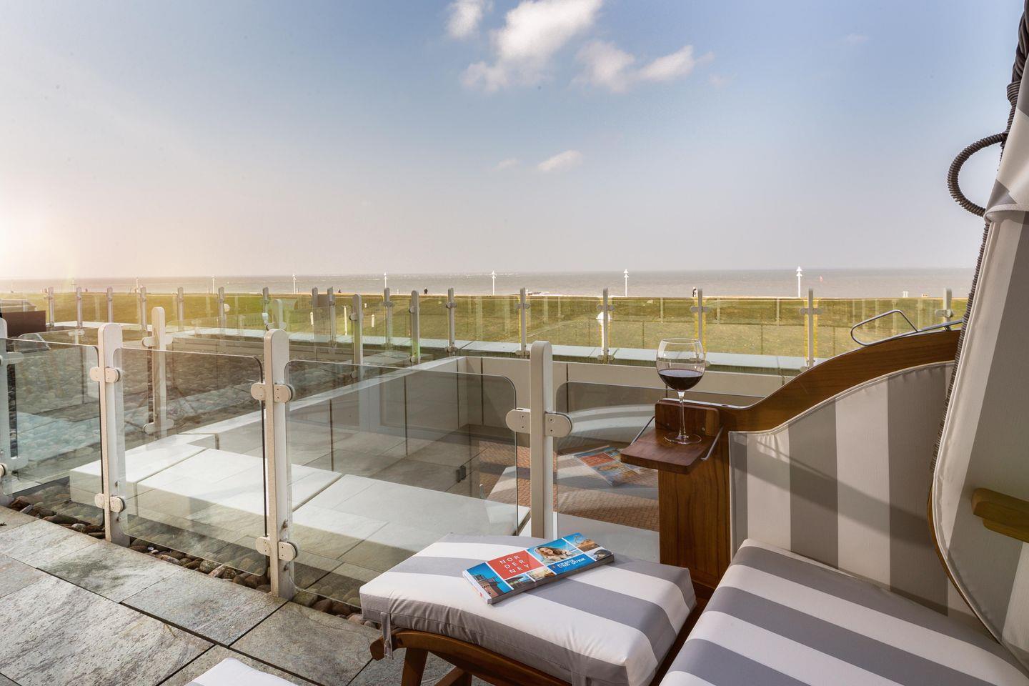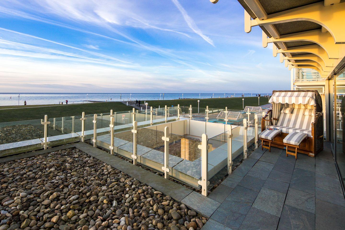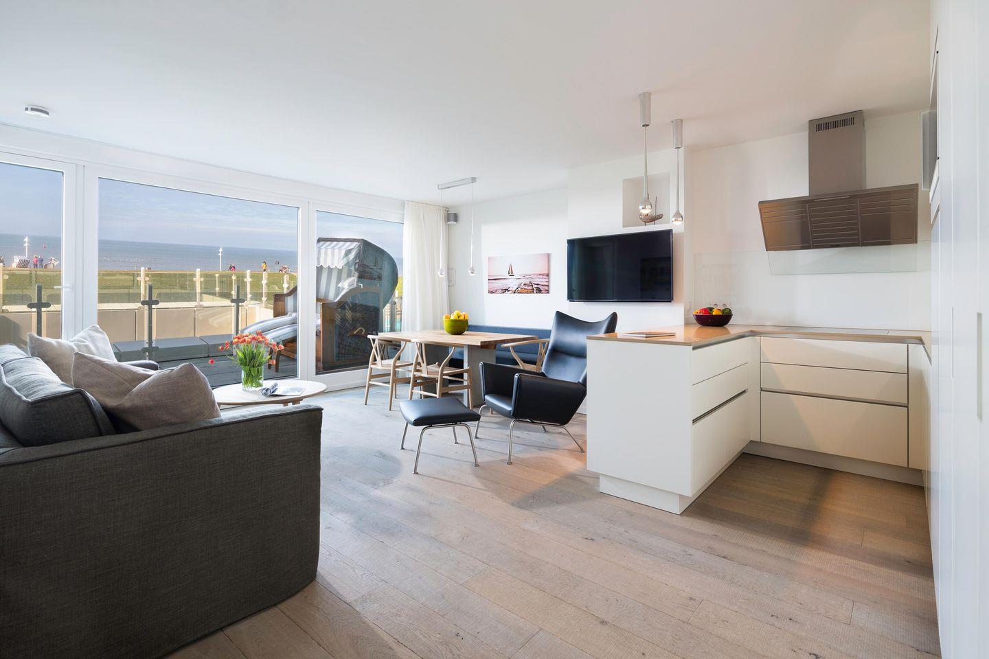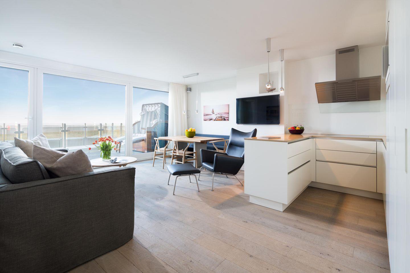 Die Wohnung verfügt über 2 Schlafzimmer mit Boxspringbetten. Ein Doppelbett bietet ihnen eine komfortable Länge von 2,10m. Aus dem anderen 2m langen Doppelbett kann man direkt aufs Meer blicken. Bei Bedarf ist auch ein ausklappbares Schlafsofa im Wohnzimmer nutzbar. Die Wohnung verfügt über insgesamt 3 TV-Geräte, WLAN, Fußbodenheizung und - als besonderes Highlight - einen eigenen Saunabereich. Das moderne Badezimmer wurde mit einer geräumigen Regendusche mit Glasabtrennung ausgestattet. Ein zweites WC befindet sich in einem separaten Raum direkt nebenan. Die offene Küche entspricht nicht nur technisch, sondern auch optisch höchsten Ansprüchen (Mikrowelle mit Grill und Crisp Funktion) und ist in den Wohn-Essbereich integriert. Die Wohnung verfügt über zwei Dachterrassen, eine mit direktem Meerblick und einem Strandkorb ausgestattet, die andere nach Süden ausgerichtet.