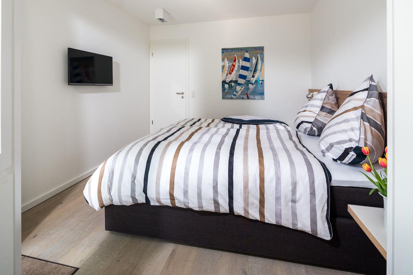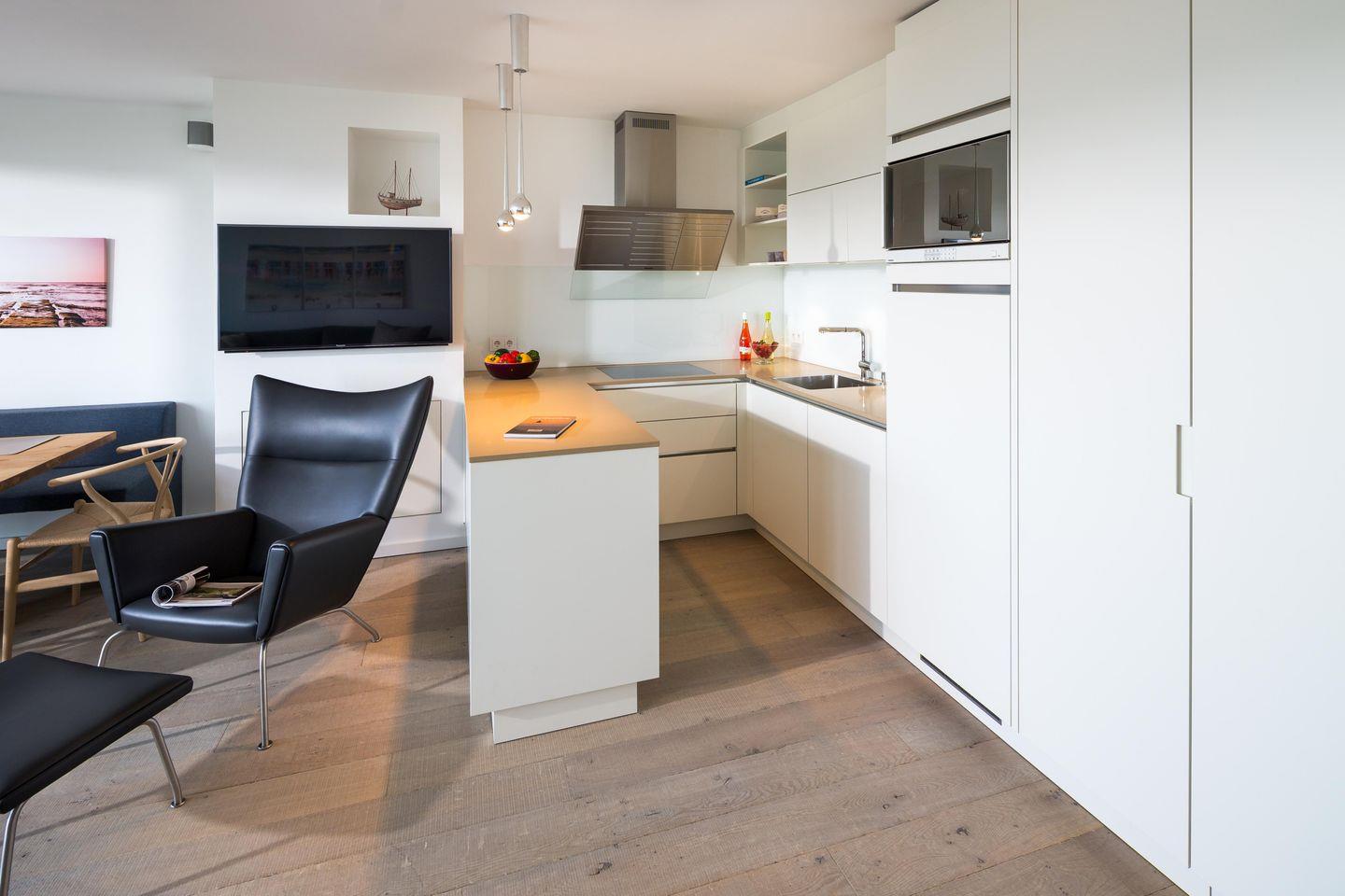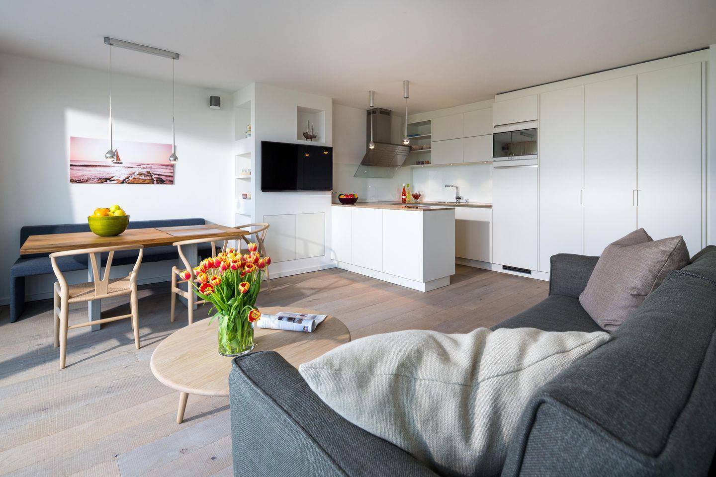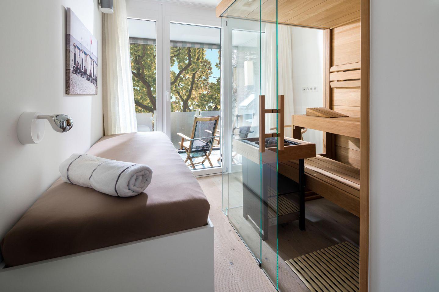 Die Wohnung verfügt über 2 Schlafzimmer mit Boxspringbetten. Ein Doppelbett bietet ihnen eine komfortable Länge von 2,10m. Aus dem anderen 2m langen Doppelbett kann man direkt aufs Meer blicken. Bei Bedarf ist auch ein ausklappbares Schlafsofa im Wohnzimmer nutzbar. Die Wohnung verfügt über insgesamt 3 TV-Geräte, WLAN, Fußbodenheizung und - als besonderes Highlight - einen eigenen Saunabereich. Das moderne Badezimmer wurde mit einer geräumigen Regendusche mit Glasabtrennung ausgestattet. Ein zweites WC befindet sich in einem separaten Raum direkt nebenan. Die offene Küche entspricht nicht nur technisch, sondern auch optisch höchsten Ansprüchen (Mikrowelle mit Grill und Crisp Funktion) und ist in den Wohn-Essbereich integriert. Die Wohnung verfügt über zwei Dachterrassen, eine mit direktem Meerblick und einem Strandkorb ausgestattet, die andere nach Süden ausgerichtet.