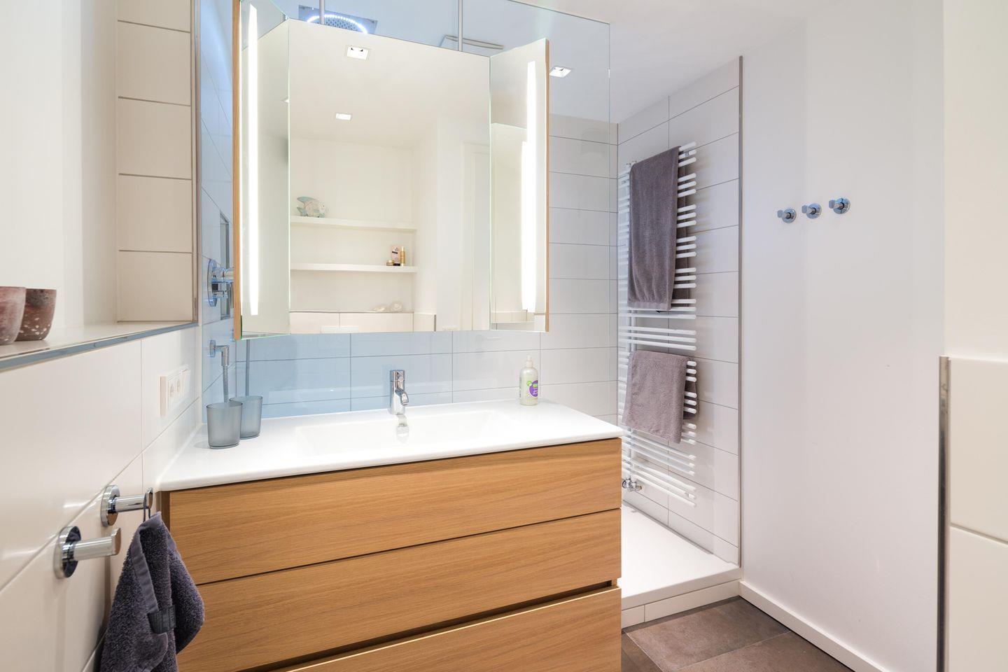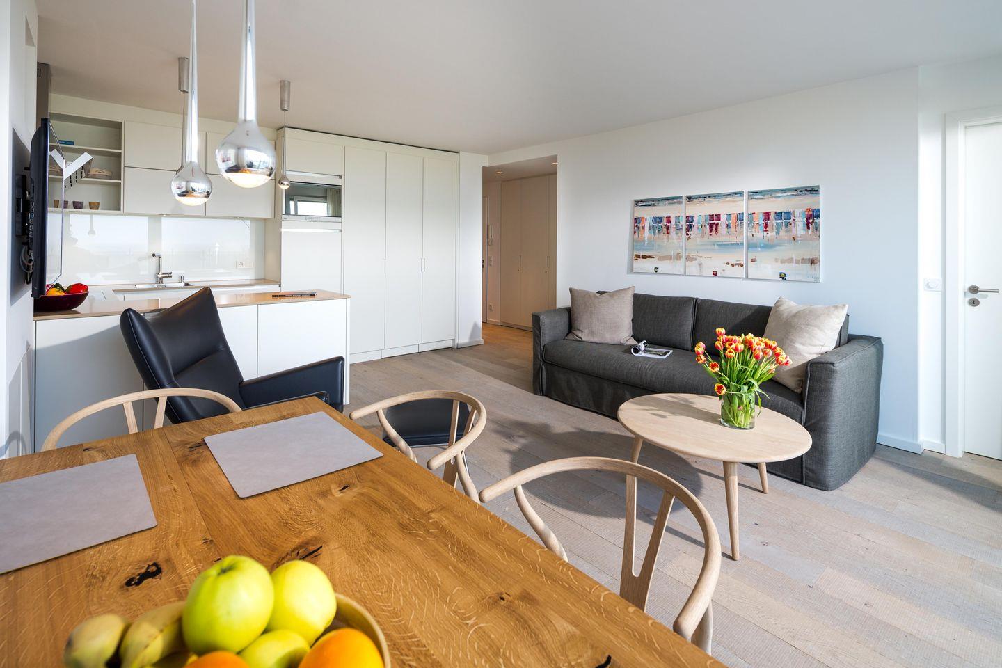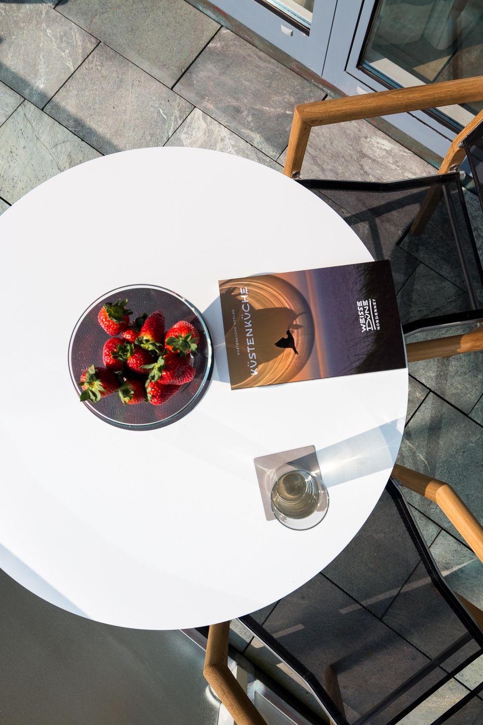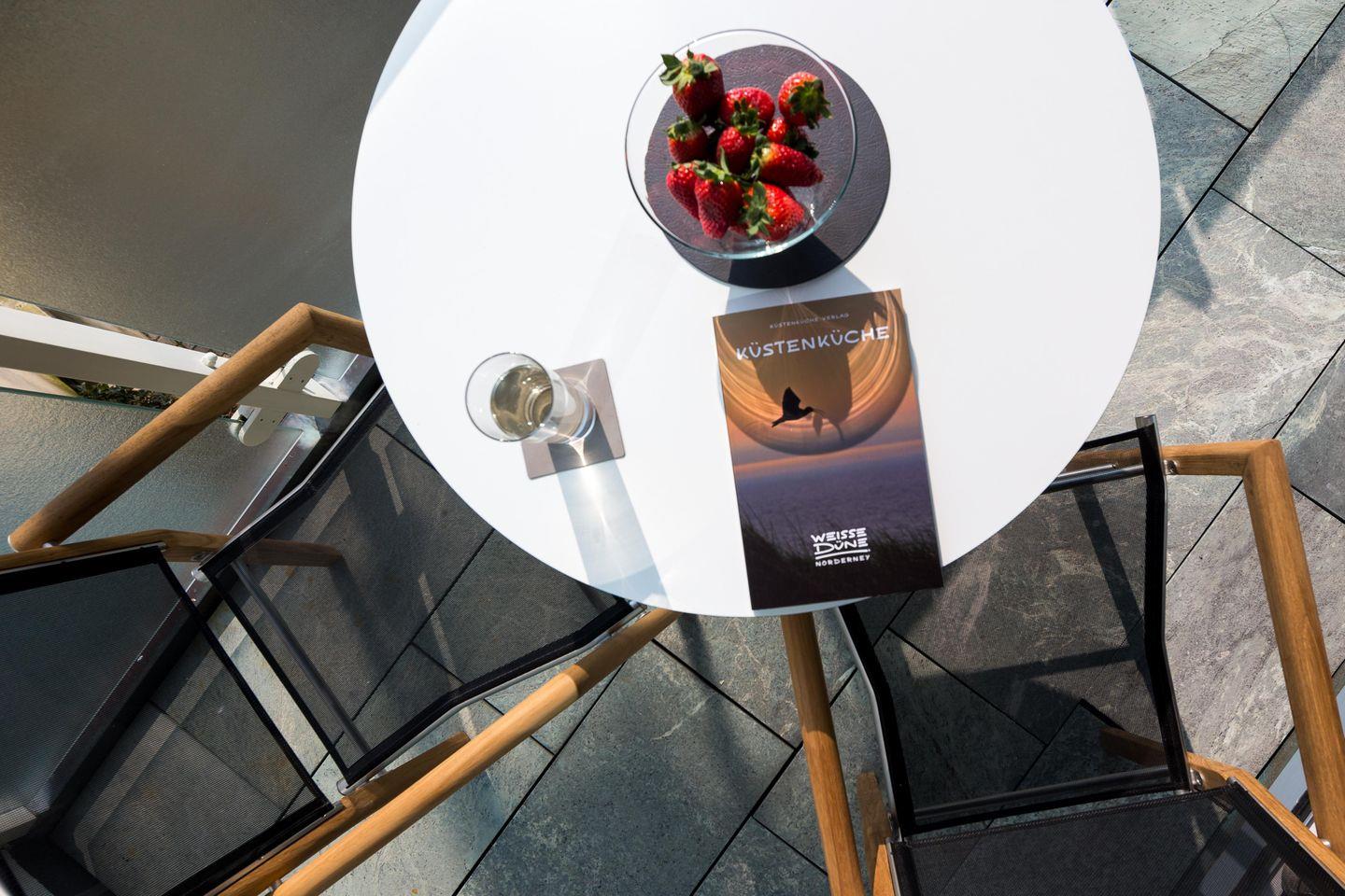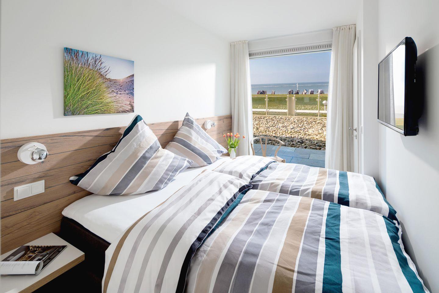 Die Wohnung verfügt über 2 Schlafzimmer mit Boxspringbetten. Ein Doppelbett bietet ihnen eine komfortable Länge von 2,10m. Aus dem anderen 2m langen Doppelbett kann man direkt aufs Meer blicken. Bei Bedarf ist auch ein ausklappbares Schlafsofa im Wohnzimmer nutzbar. Die Wohnung verfügt über insgesamt 3 TV-Geräte, WLAN, Fußbodenheizung und - als besonderes Highlight - einen eigenen Saunabereich. Das moderne Badezimmer wurde mit einer geräumigen Regendusche mit Glasabtrennung ausgestattet. Ein zweites WC befindet sich in einem separaten Raum direkt nebenan. Die offene Küche entspricht nicht nur technisch, sondern auch optisch höchsten Ansprüchen (Mikrowelle mit Grill und Crisp Funktion) und ist in den Wohn-Essbereich integriert. Die Wohnung verfügt über zwei Dachterrassen, eine mit direktem Meerblick und einem Strandkorb ausgestattet, die andere nach Süden ausgerichtet.
