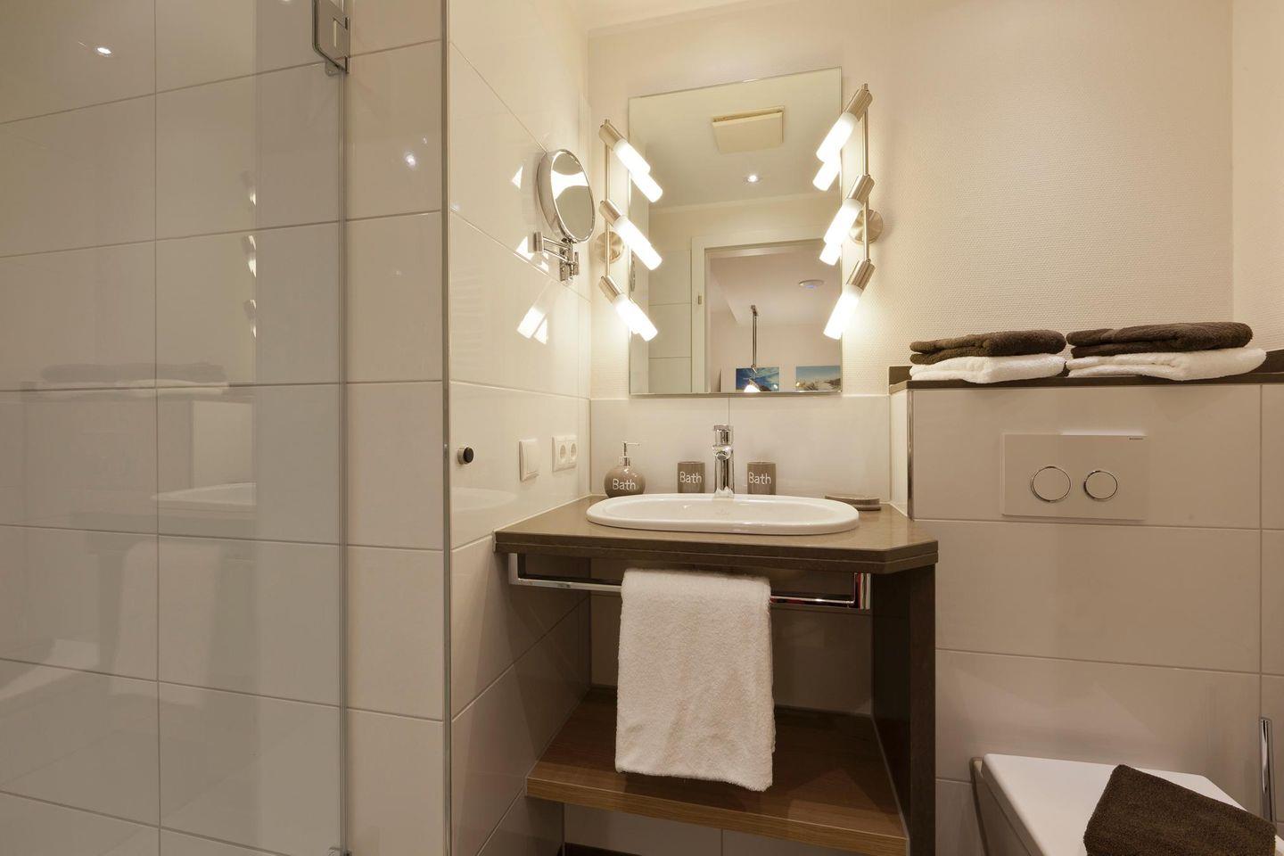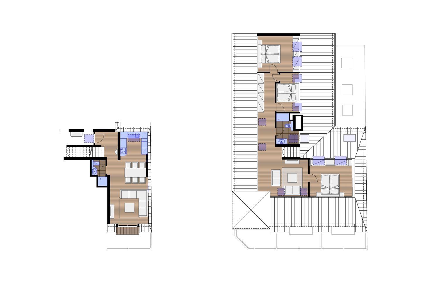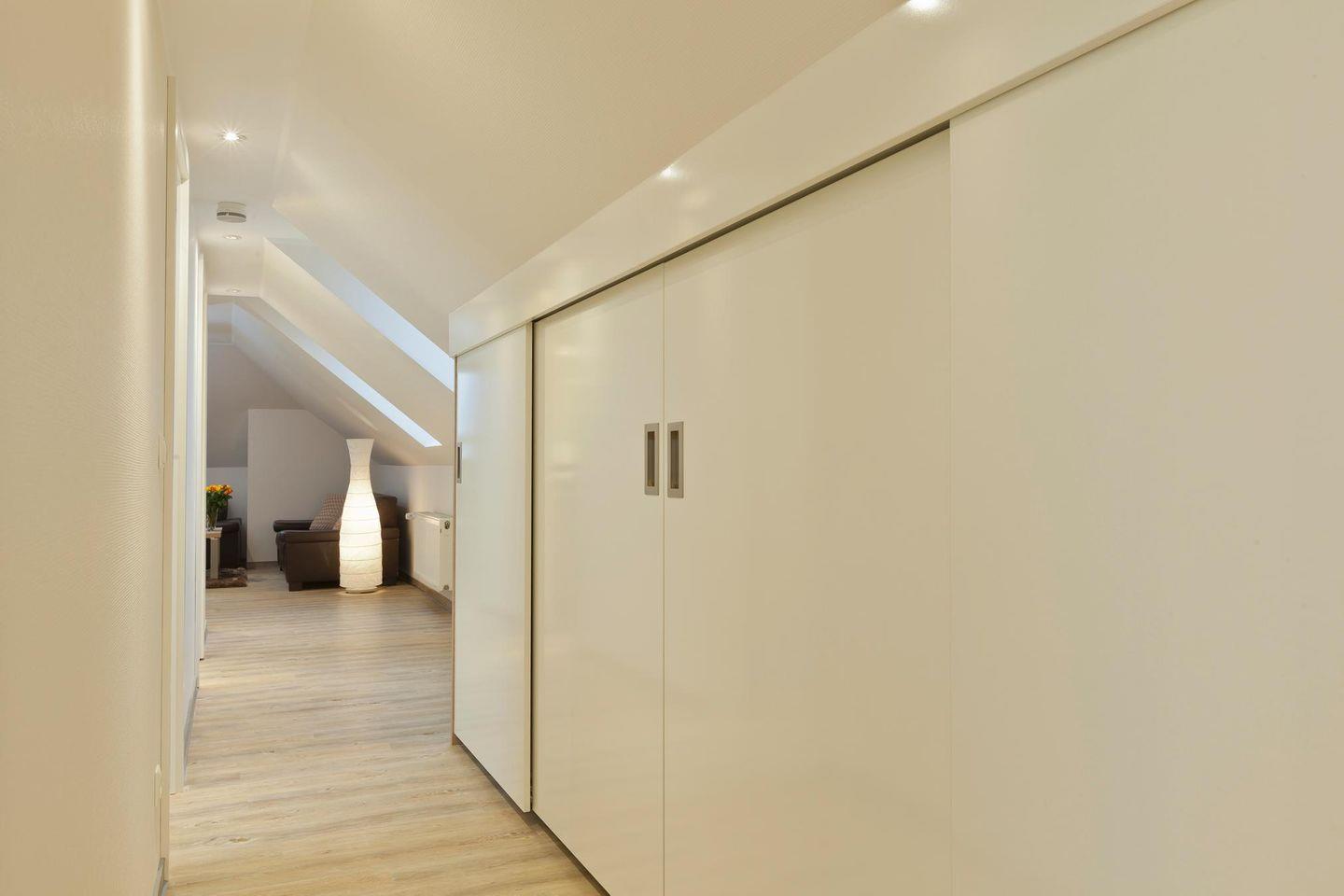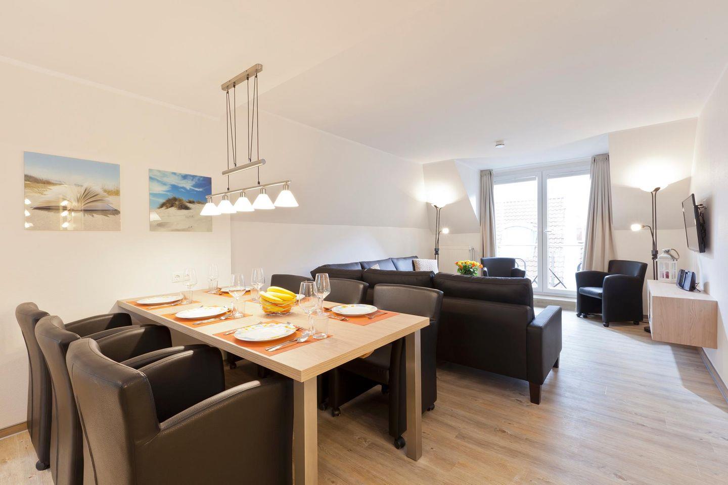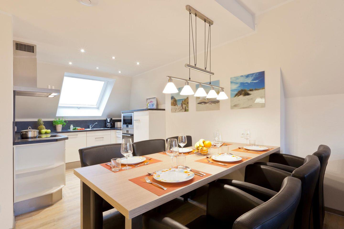 Die Wohnung Nr. 6 erstreckt sich über zwei Etagen und bietet mit drei Schlafzimmern und zwei Badezimmern ausreichend Platz und Privatsphäre für bis zu sechs Personen. Jedes Schlafzimmer ist mit einem Doppelbett ausgestattet. Das Wohnzimmer liegt in der zweiten Etage. Die angrenzende Küchenecke ist voll ausgestattet und bietet auch einen Essbereich. Die beiden modernen Badezimmer befinden sich jeweils auf der zweiten und dritten Etage und sind mit einer Dusche und einem WC ausgestattet. Darüber hinaus bietet die Wohnung einen Loungebereich in der dritten Etage. Die Wohnung verfügt über einen Balkon. Waschmaschine und Wäschetrockner befinden sich im Haus und stehen (für die gemeinschaftliche Nutzung gegen Münzeinwurf) zur Verfügung, was besonders für längere Aufenthalte von Vorteil ist. Hunde sind in dieser Ferienwohnung nicht erlaubt.