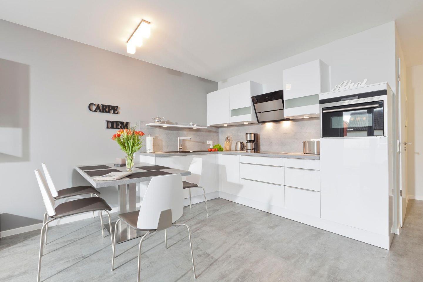 Auf 72 qm Wohnfläche sind zwei Schlafzimmer, ein Wohnzimmer mit integriertem Küchen- und Essbereich sowie zwei Bäder vorhanden. Jedes Schlafzimmer ist mit einem Doppelbett ausgestattet, wobei eines davon mit einer Länge von 2,20 m auch für größere Menschen geeignet ist. Die Couch im Wohnzimmer verfügt über eine Schlaffunktion, die einen zusätzlichen Schlafplatz bietet. Alle Schlafzimmer sind mit einem Fernseher ausgestattet, während das Wohnzimmer noch zusätzlich einen DVD-Player und einen Safe bietet. Die Wohnung verfügt über zwei Terrassen, von denen eine mit einer Markise ausgestattet ist. Für Fahrräder stehen überdachte Abstellmöglichkeiten am Haus zur Verfügung. Waschmaschine und Wäschetrockner befinden sich im Haus und stehen (für die gemeinschaftliche Nutzung gegen Gebühr) zur Verfügung, was besonders für längere Aufenthalte von Vorteil ist. Hunde sind in dieser Ferienwohnung nicht erlaubt.