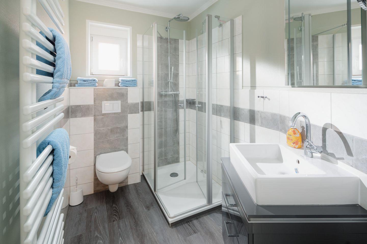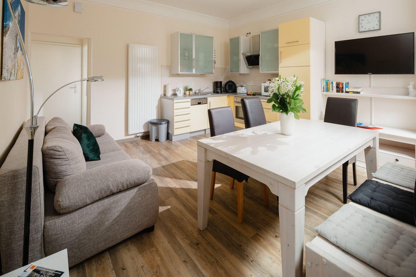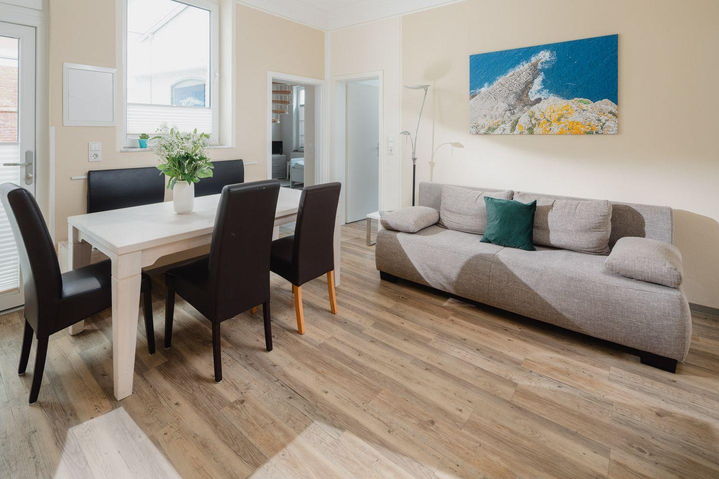 Die Wohnung "Villa Stefanie 1" erstreckt sich über das Erdgeschoss (2 Stufen vor der Haustür) und eine kleine Sitzecke im 1.OG Obergeschoss und bietet ca. 85 Quadratmeter Platz. Sie verfügt über drei Schlafzimmer und zwei Bäder. Im ersten Schlafzimmer befindet sich ein Doppelbett, während das zweite Schlafzimmer mit zwei Einzelbetten ausgestattet ist. Das dritte Schlafzimmer ist mit einem Einzelbett ausgestattet. Die Küche ist vollständig eingerichtet und in den Wohnbereich integriert. In dieser Küche gibt es unter anderem einen 4-Plattenherd, einen Backofen, einen Kühlschrank, eine Geschirrspülmaschine, einen Gefrierschrank, eine Mikrowelle, einen Toaster, eine Kaffeemaschine sowie Töpfe, Pfannen und Geschirr. Im Wohnzimmer und allen Schlafzimmern steht ein Fernseher zur Verfügung. Die Wohnung bietet zudem eine Terrasse. Hier darf auch der vierbeinige Freund mitkommen, denn die Ferienwohnung heißt auch Hunde herzlich willkommen. Erlaubt ist maximal 1 Hund (Höhe maximal kniehoch). Die Hundewiese befindet sich in der Nähe des Weststrandes (kein Leinenzwang).