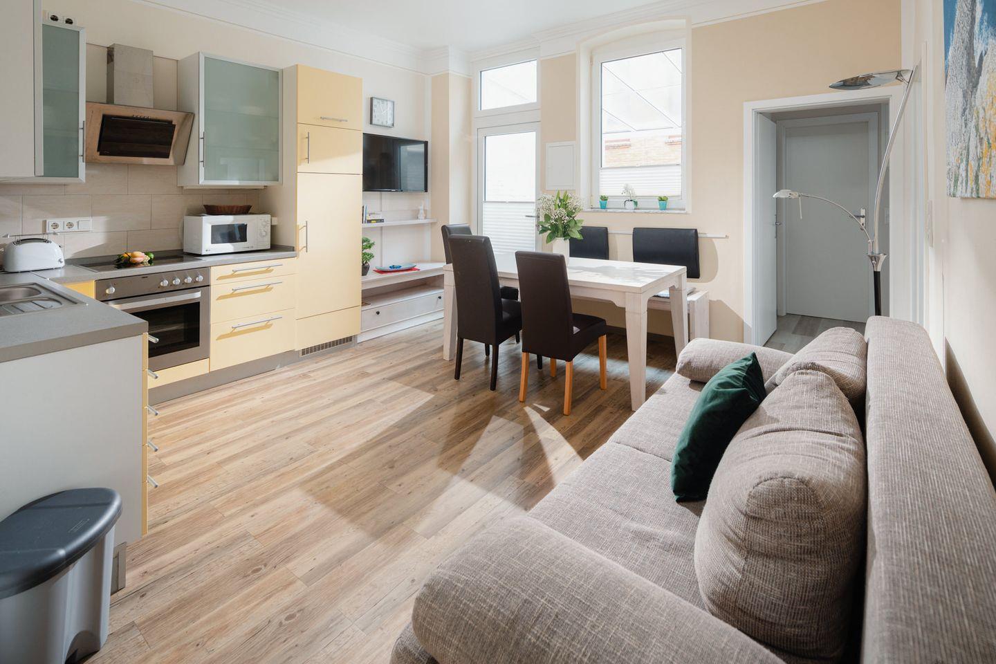 Die Ferienwohnung "Villa Stefanie 1" befindet sich in der "Villa Stefanie". Das Haus ist ein denkmalgeschütztes, komplett saniertes Gebäude, das sich in einer ruhigen Seitenstraße, der Wilhelmstraße, befindet. Die Wohnung bietet Platz für bis zu fünf Personen. In unmittelbarer Nachbarschaft befindet sich das Meerwasserhallenbad mit Sauna, Solarium und neuem Thalasso-Wellnessbereich.