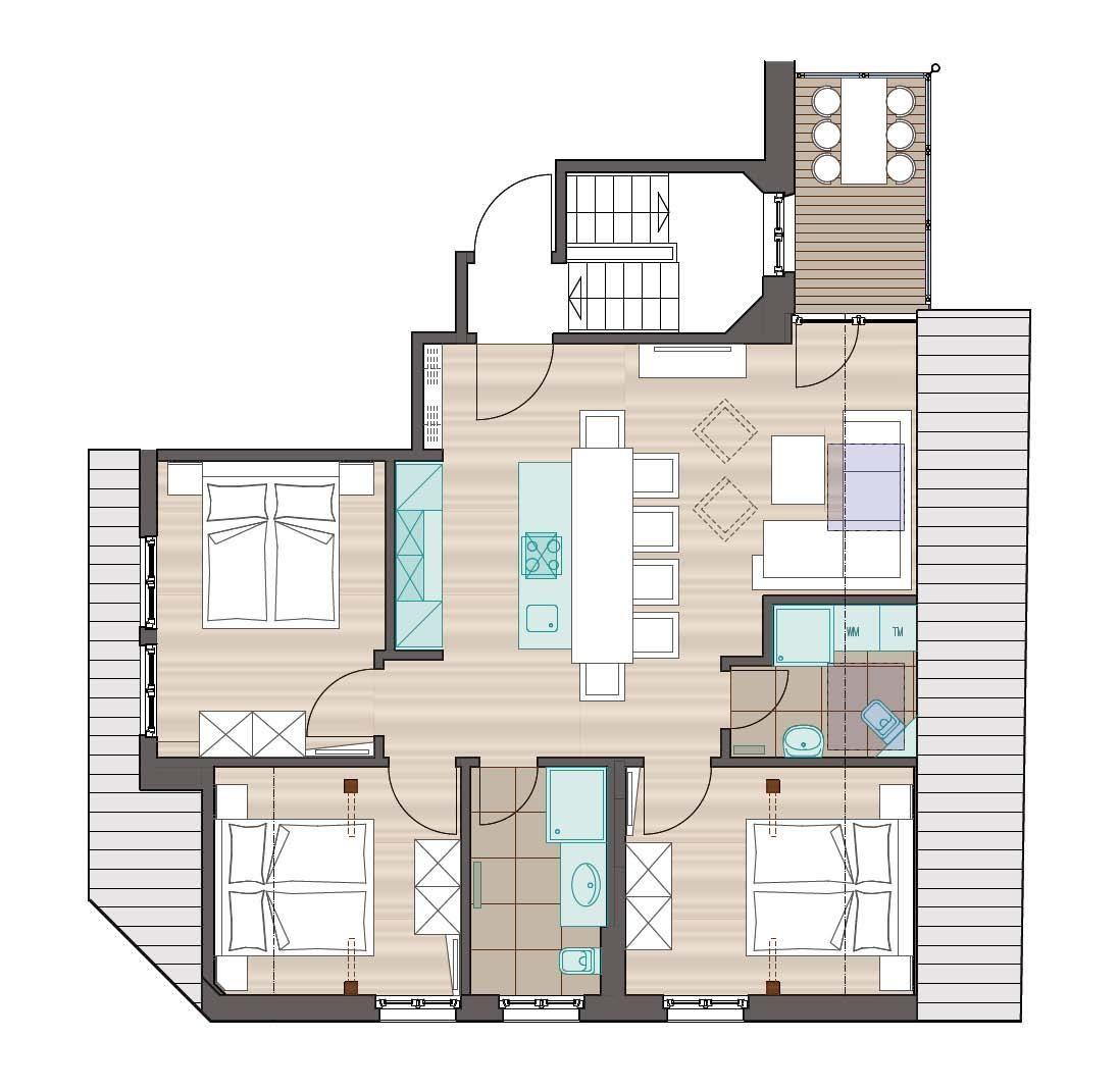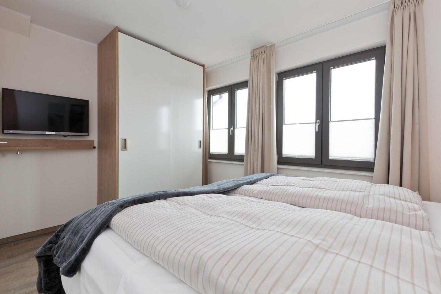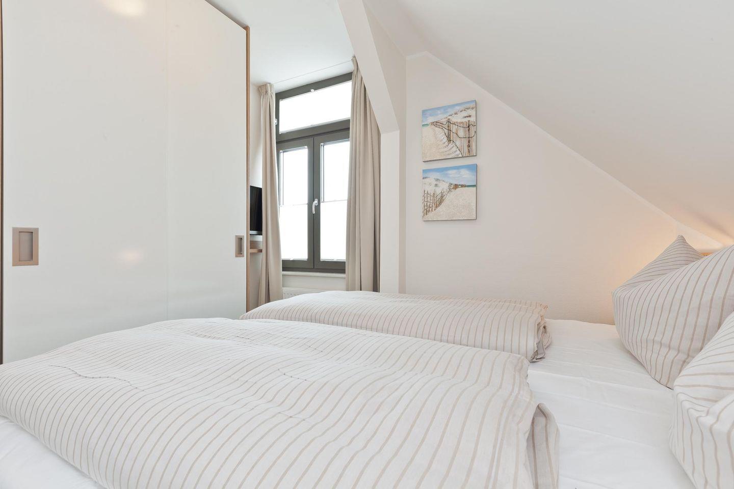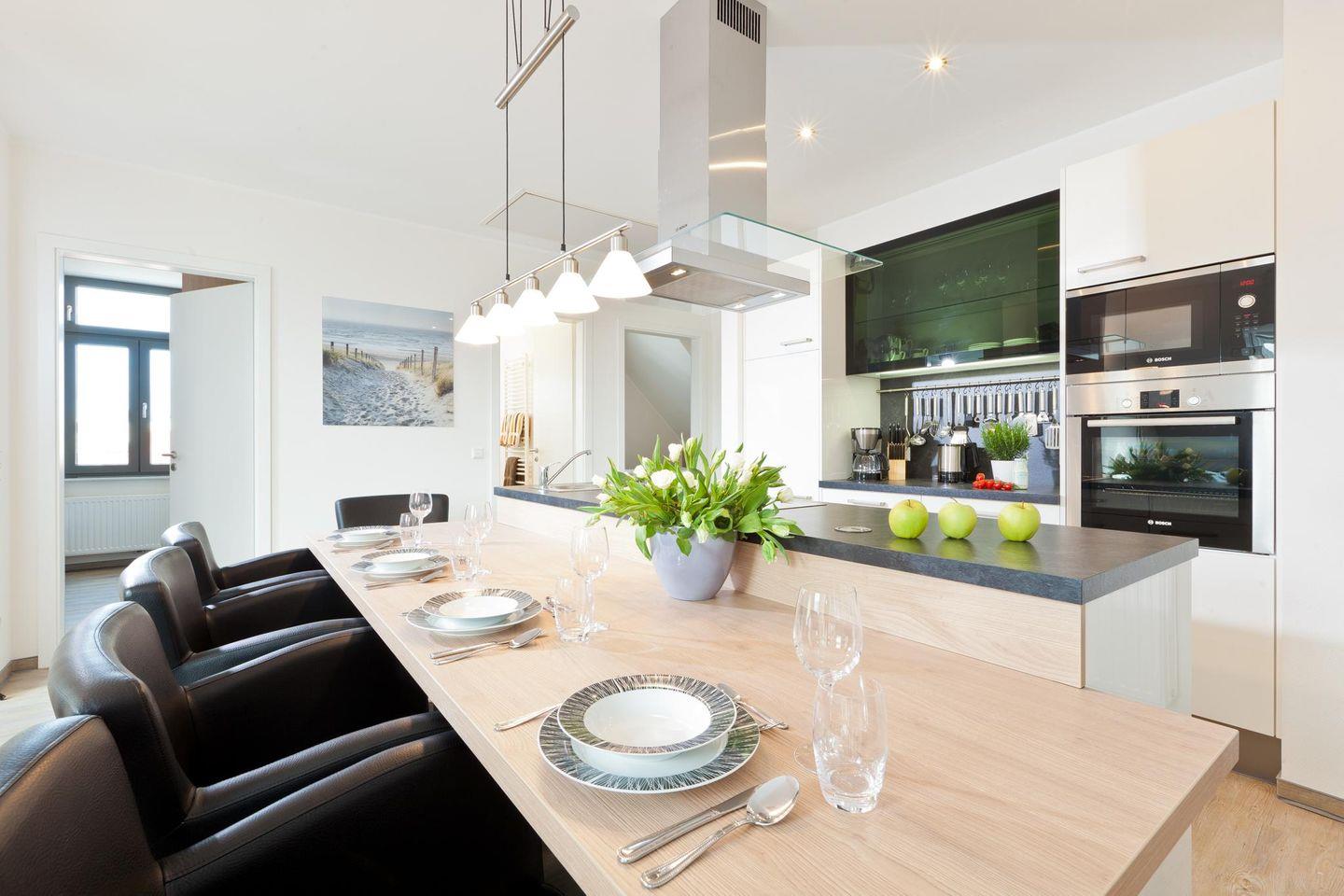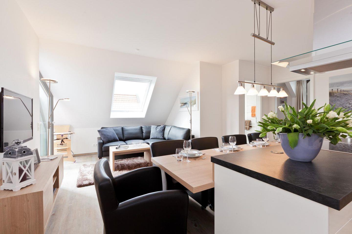 Bei der Einrichtung der Wohnung wurde auf einen modernen und hochwertigen Stil Wert gelegt. Die Wohnung bietet mit drei Schlafzimmern (jeweils ausgestattet mit einem Doppelbett) und zwei Bädern (eins ausgestattet mit einer Waschmaschine und einem Wäschetrockner) ausreichend Platz für Familien oder eine Gruppe von Freunden. Der Wohnbereich wurde offen gestaltet (inklusive offener Küche und einem Essbereich). Ein Highlight der Wohnung ist der westlich ausgerichtete Balkon. Hunde sind in dieser Ferienwohnung nicht erlaubt.
