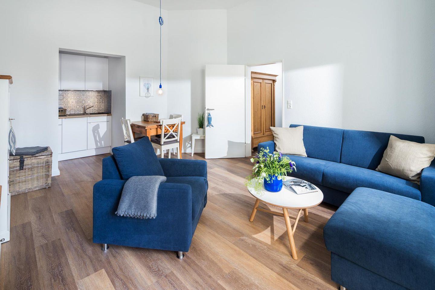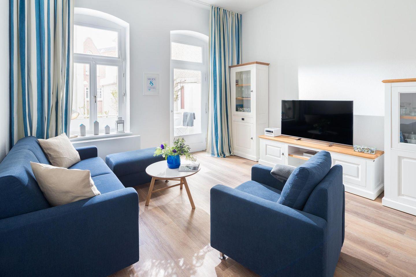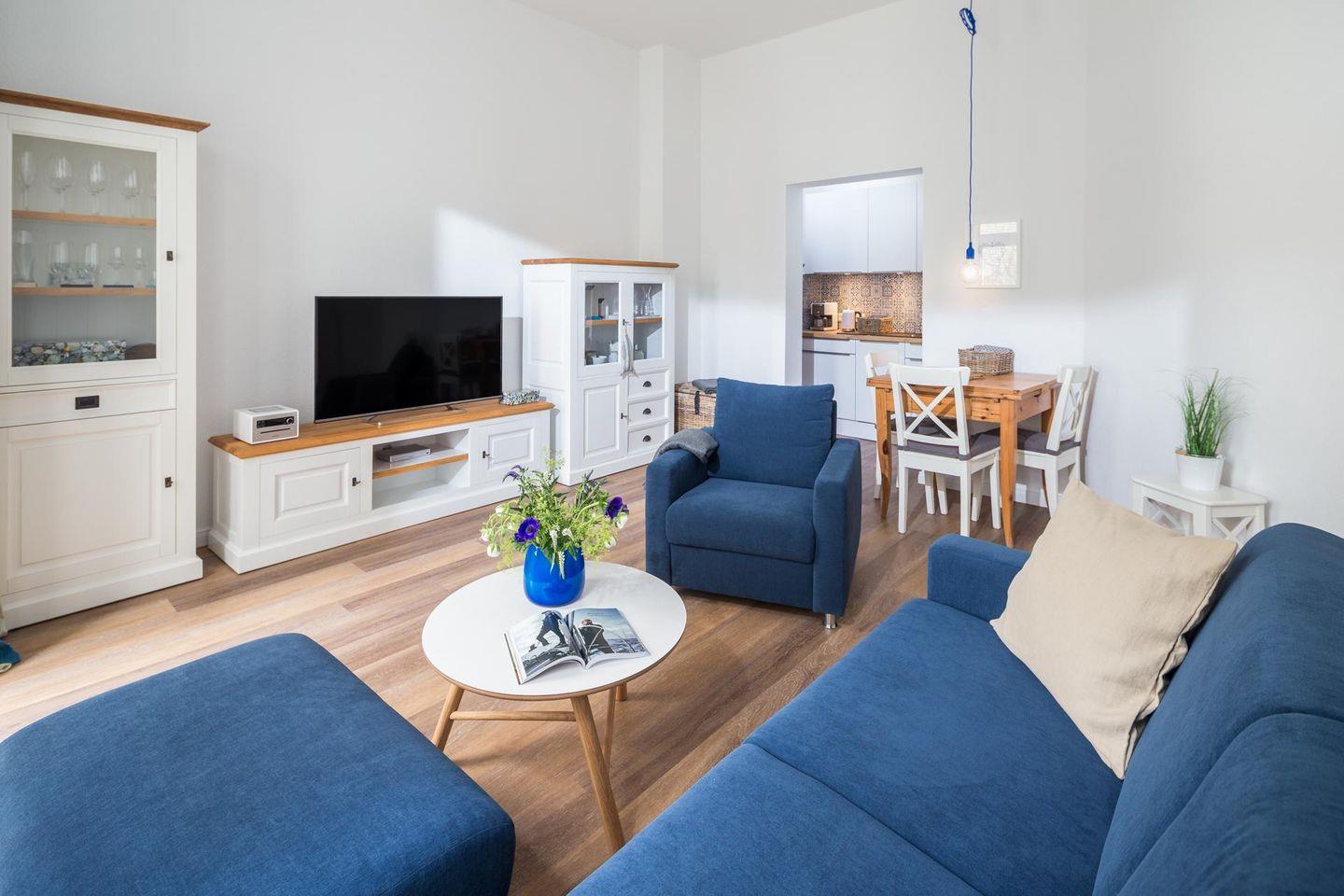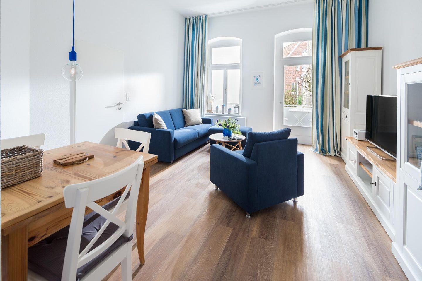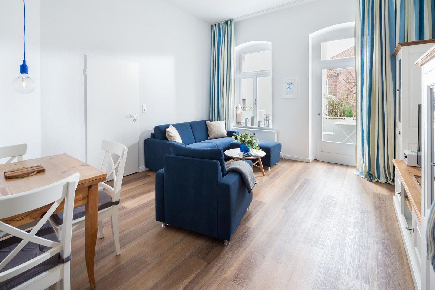 Die Raumaufteilung der Wohnung beinhaltet einen Dielenbereich, ein getrenntes Schlafzimmer, ein modernes Duschbad und einen Wohn-Küchenbereich, der Zugang zum Westbalkon bietet. Dieser liegt in Richtung der Bogenstraße. Im Schlafzimmer befindet sich ein Doppelbett (1,60m x 2,00m) und im Wohnzimmer wurde eine Schlafcouch aufgestellt, die als zusätzliche Schlafmöglichkeit genutzt werden kann. Die Wohnung wurde aufwendig renoviert und mit hochwertigen Möbeln ausgestattet. Für Kinder sind ein Hochstuhl und ein Reisebett vorhanden, wobei das Reisebett nicht im Schlafzimmer aufgestellt werden kann. Hunde sind in dieser Ferienwohnung nicht erlaubt.