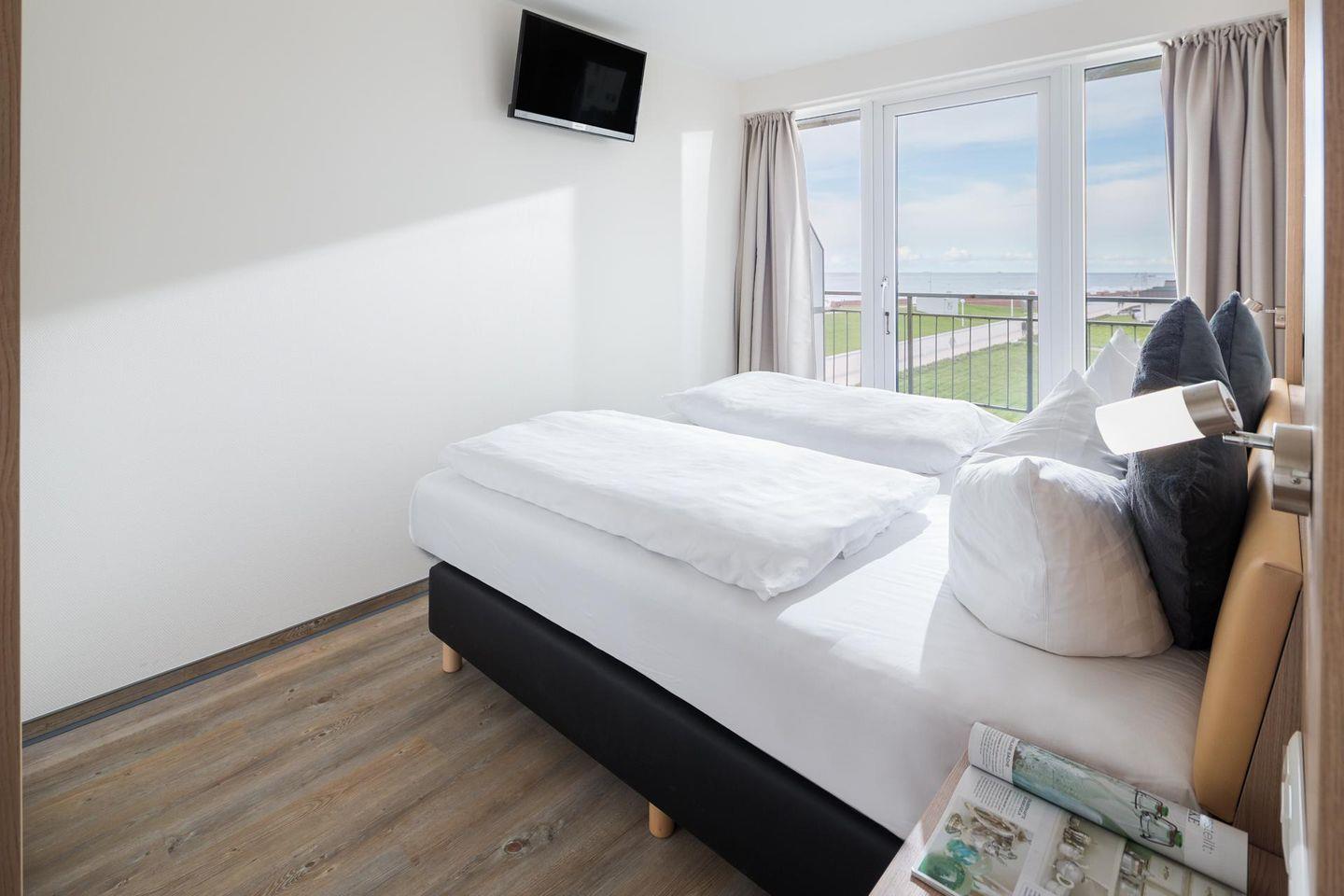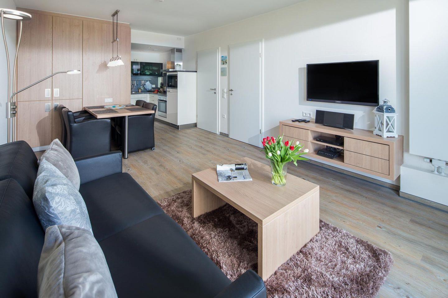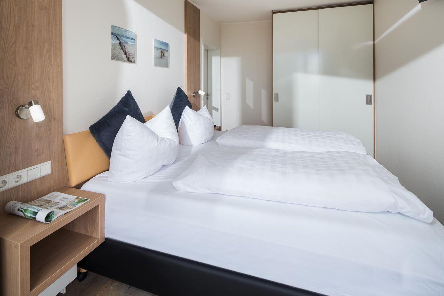Das separate Schlafzimmer der 2-Zimmer-Wohnung verfügt über ein Doppelbett, im Wohnzimmer gibt es eine Schlafcouch, auf der zwei weitere Personen schlafen können. Eine kleine Küchenzeile ist sehr gut ausgestattet und das Badezimmer verfügt über eine Dusche. Die Ausstattung des Bades ist für Rollstuhlfahrer optimiert (siehe Bilder). Der ca. 9 qm große Balkon mit seitlichem Blick auf das Meer liegt nach Osten. Zur Wohnung gehört einer der wenigen Parkplätze* des Kaiserhofs. ACHTUNG! Vom 01.10.24 bis ca. 15.05.25 ist der Parkplatz der Wohnung nicht nutzbar.