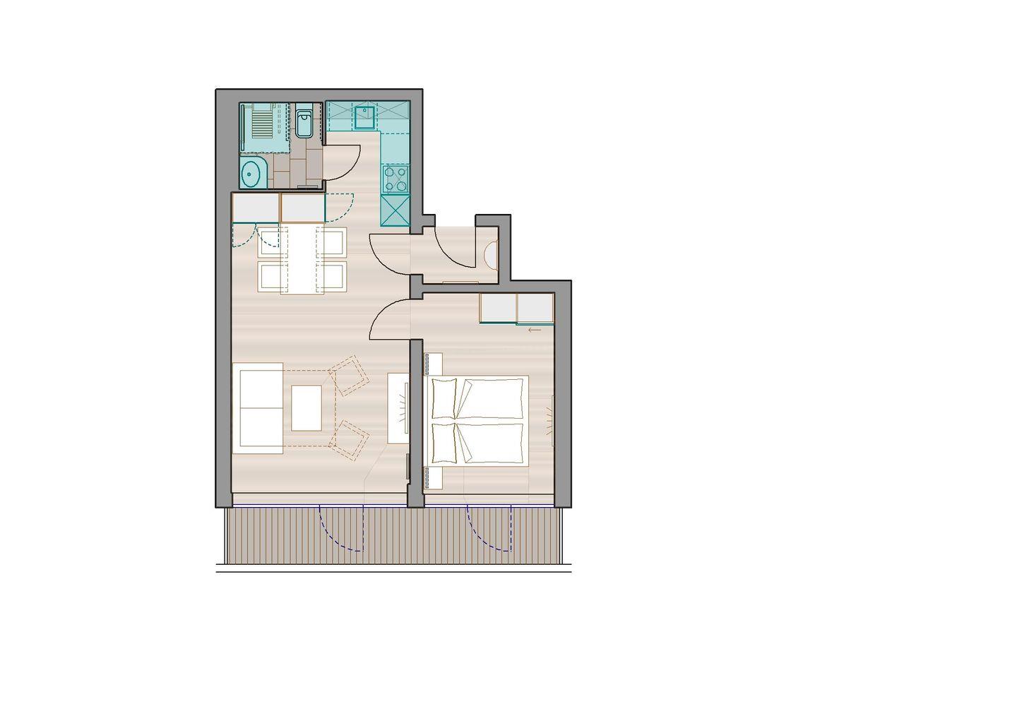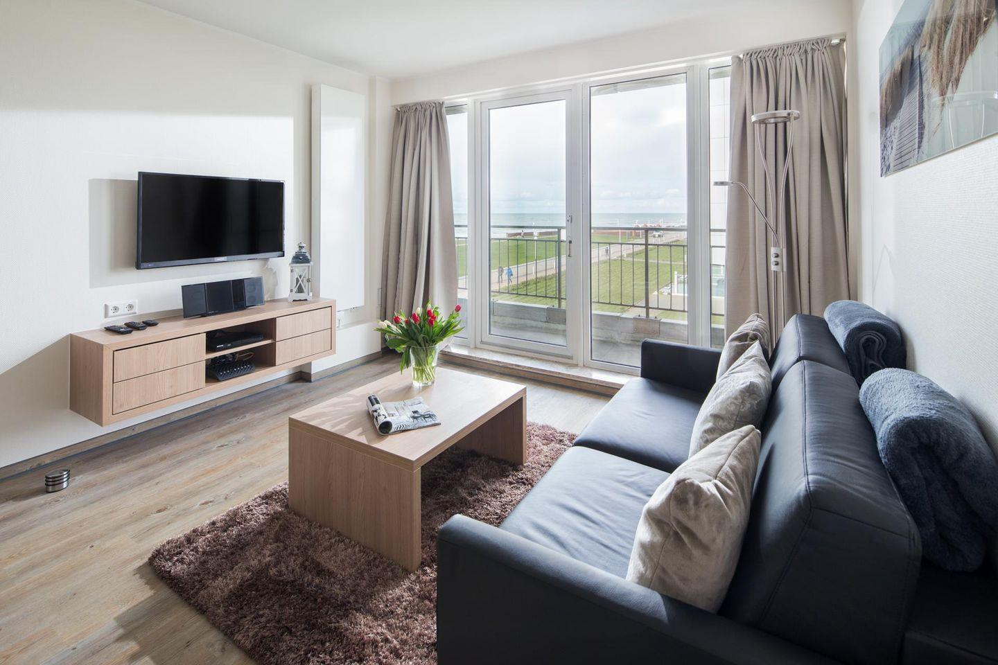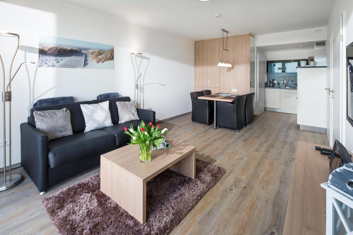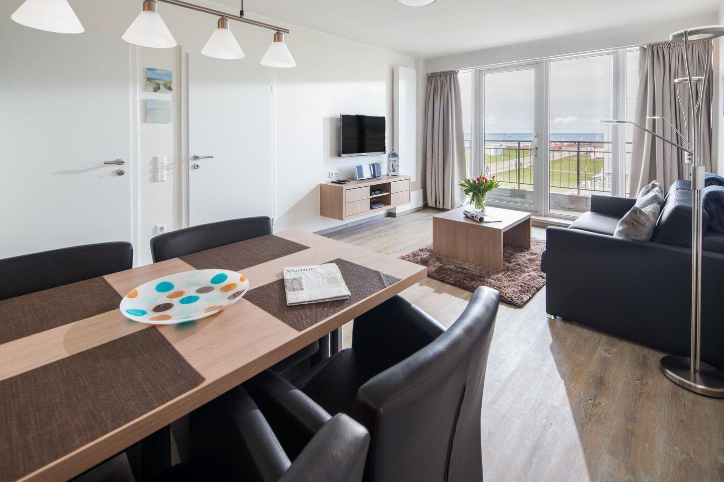 Das separate Schlafzimmer der 2-Zimmer-Wohnung verfügt über ein Doppelbett, im Wohnzimmer gibt es eine Schlafcouch, auf der zwei weitere Personen schlafen können. Eine kleine Küchenzeile ist sehr gut ausgestattet und das Badezimmer verfügt über eine Dusche. Die Ausstattung des Bades ist für Rollstuhlfahrer optimiert (siehe Bilder). Der ca. 9 qm große Balkon mit seitlichem Blick auf das Meer liegt nach Osten. Zur Wohnung gehört einer der wenigen Parkplätze* des Kaiserhofs. ACHTUNG! Vom 01.10.24 bis ca. 15.05.25 ist der Parkplatz der Wohnung nicht nutzbar.
