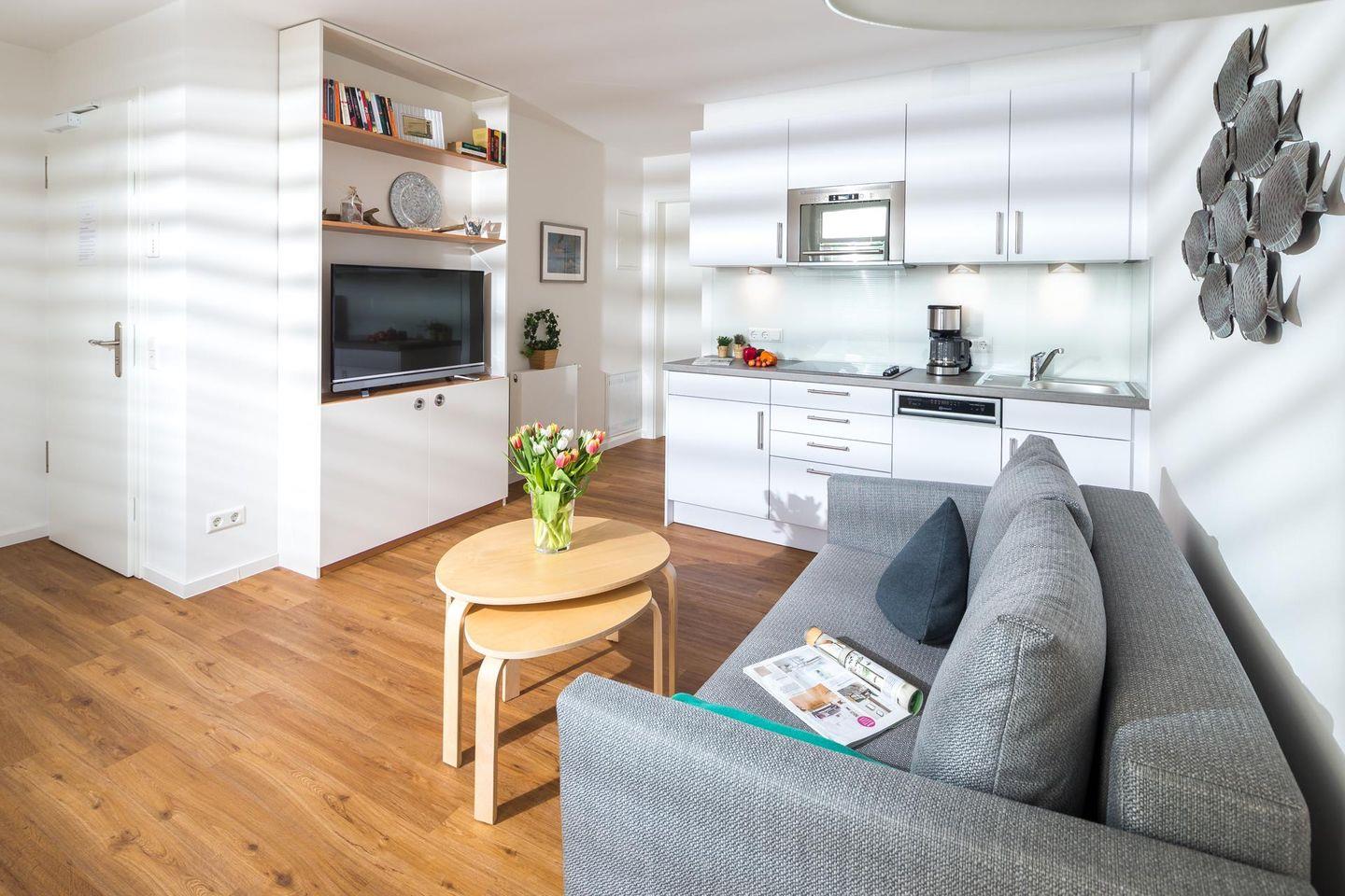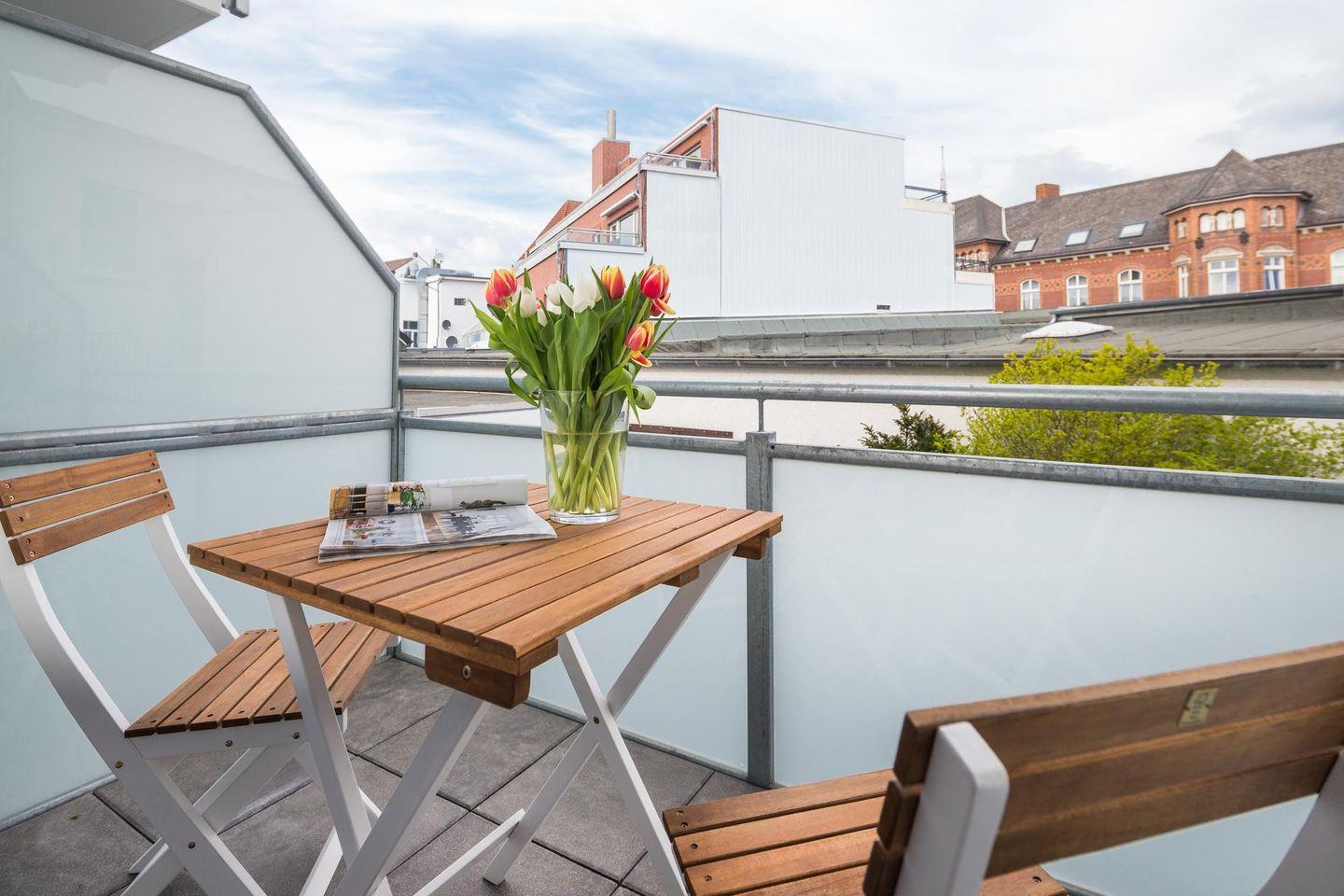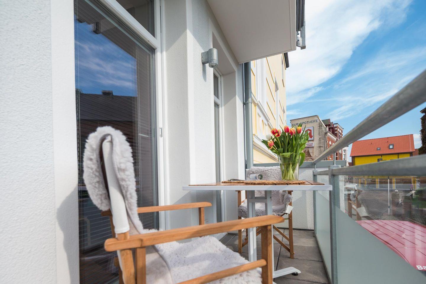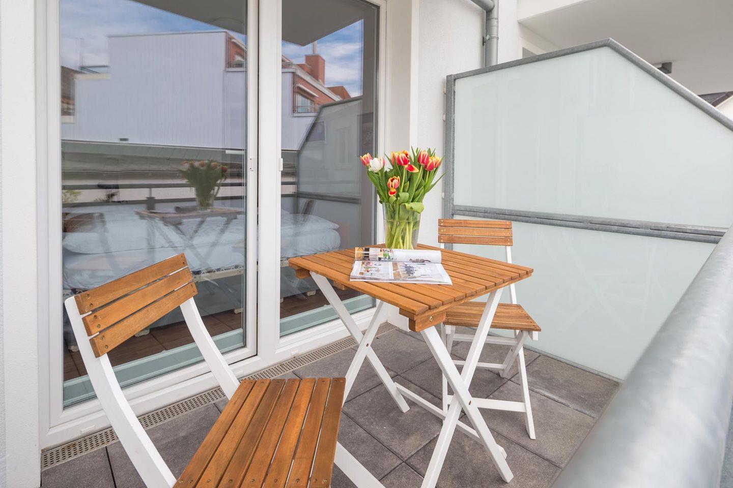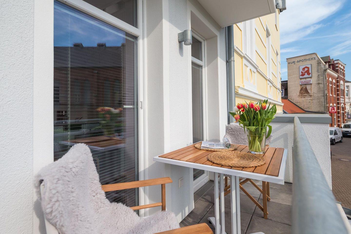 "Gleich neben der schönen Inselkirche liegt die Wohnung "John Silver" - klein, hell, modern und mit 2 Balkonen für jede Tageszeit"