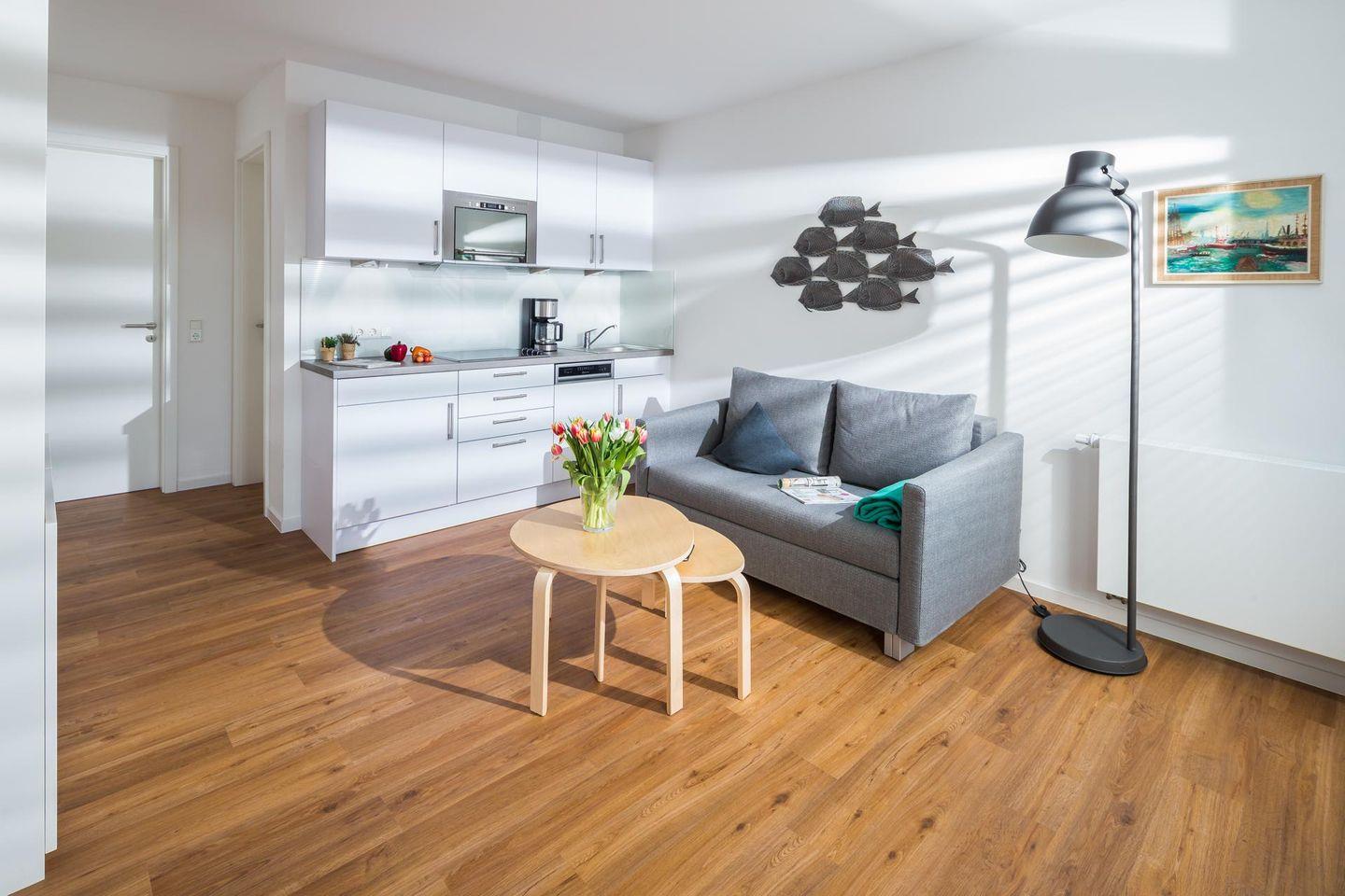 Bei der Inneneinrichtung der Wohnung wurde Wert auf helle und natürliche Farben gelegt. Zwei elektrisch ausfahrbare Schrankbetten bieten den gleichen Schlafkomfort wie herkömmliche Betten und lassen sich tagsüber platzsparend verstauen. Für eine dritte Person bietet das ausziehbare Sofa im Wohnzimmer eine Schlafmöglichkeit mit einer Liegefläche von 1,30 x 2,13 m. Ein Highlight der Wohnung "John Silver" sind die beiden Balkone. Es gibt einen Süd-West-Balkon und einen Nord-Ost-Balkon (mit Blick auf den Kirchhof). Hunde sind in dieser Unterkunft nicht erlaubt.