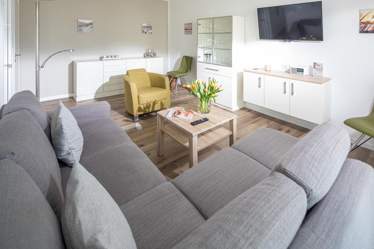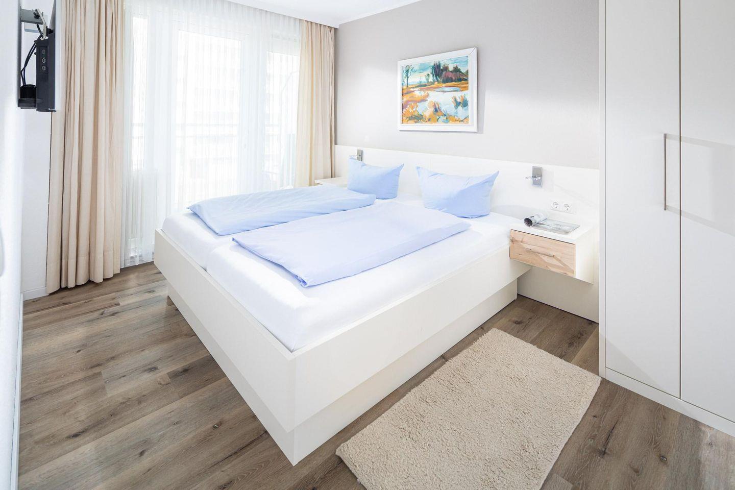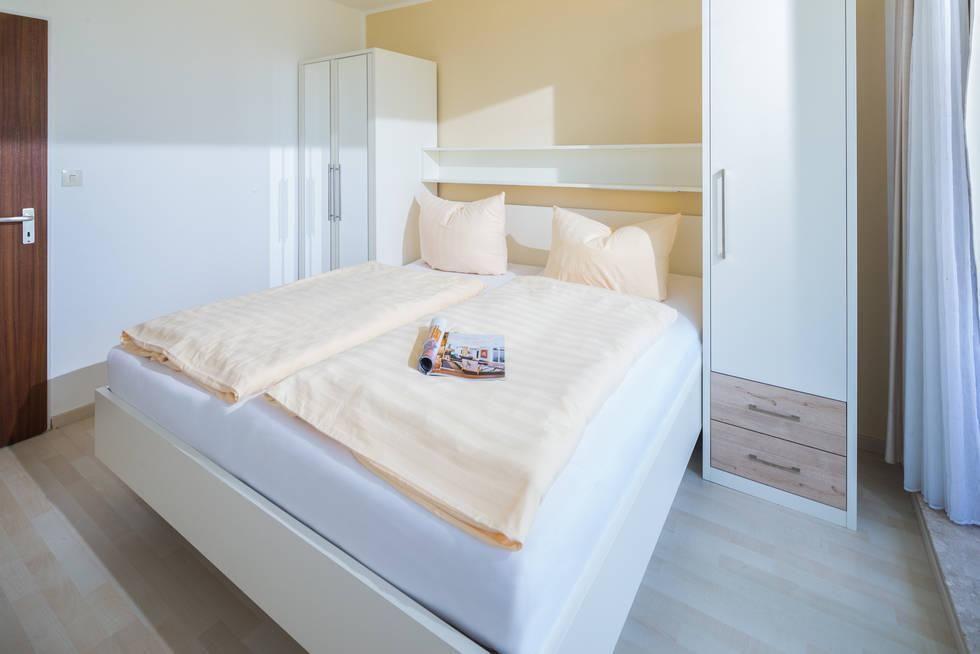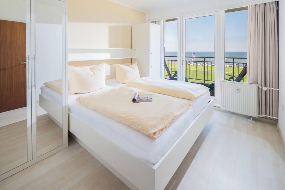 Die Wohnung verfügt über 2 Schlafzimmer, die jeweils mit einem Doppelbett ausgestattet sind. Zudem verfügt die Wohnung über einen Wohn- und Küchenbereich, das Bad ist mit Dusche, WC und Handwaschbecken ausgestattet. Ein Highlight der Wohnung sind die zwei Balkone. Die Ecklage der Wohnung bietet einen erstklassigen frontalen und auch seitlichen (Osten) Blick auf das Meer.