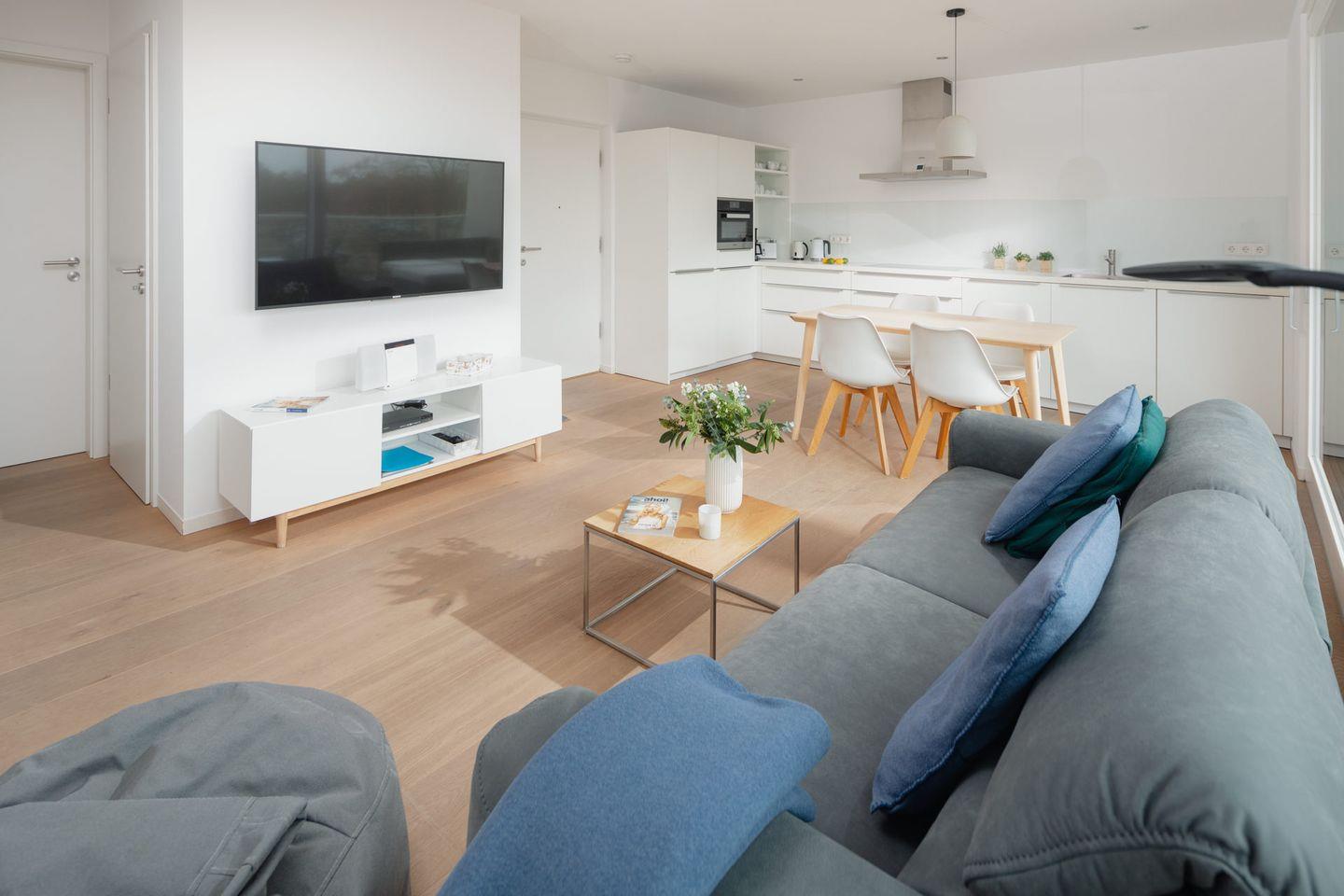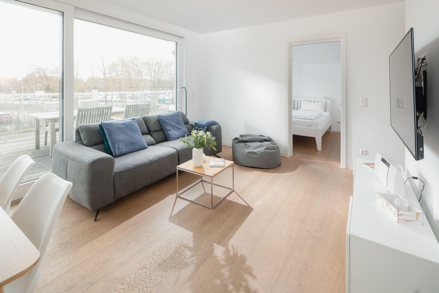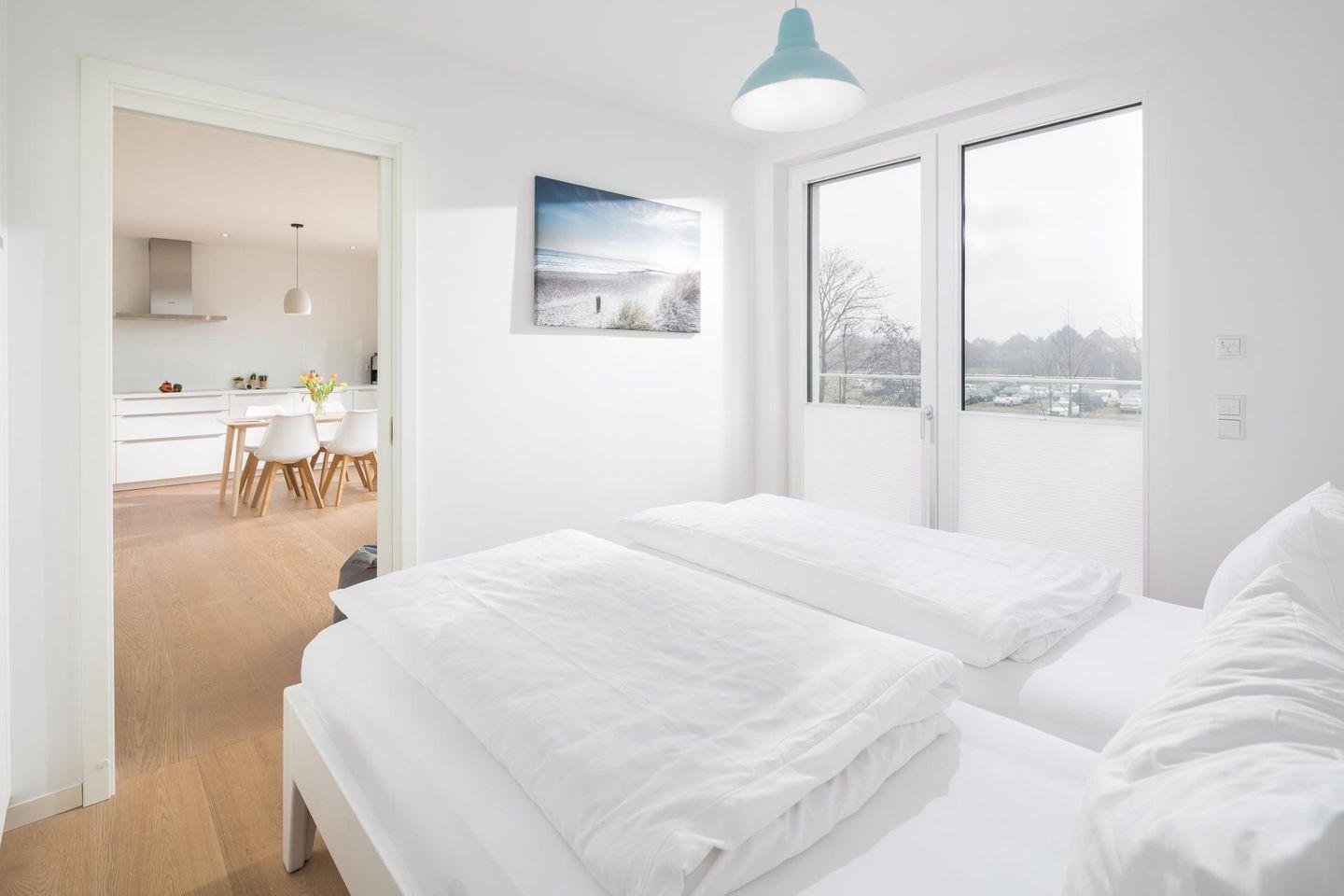 Die moderne Wohnküche mit einem großen Fenster und einer Schiebetür zum 24 qm großen Balkon lässt viel Licht herein. Die Wohnung verfügt über zwei Schlafzimmer. Ein Schlafzimmer ist mit einem Doppelbett eingerichtet. Das zweite Schlafzimmer ist ideal für Kinder ausgestattet und verfügt über ein Hochbett und weitere Details. Im Badezimmer ist eine große Regendusche (80 x 120 cm) eingebaut und auch hier sorgt ein Fenster für natürliches Licht. Der Balkon kann auch von einem der Schlafzimmer aus betreten werden. Für Unterhaltung sorgt ein top moderner 55 Zoll Sony Fernseher mit BlueRay / DVD Player und internetbasiertem Zugang zu Amazon Film, YouTube etc. Die Nutzung von NETFLIX und DAZN ist inklusive! Die moderne Küche ist mit hochwertigen Geräten wie einem großen Miele Kühlschrank mit Tiefkühlfach, einem Miele Ofen mit integrierter Mikrowelle und einem großen Siemens Induktionsherd ausgestattet. Zusätzlich stehen Ihnen eine Nespresso-Maschine, eine Saftpresse, ein Waffeleisen, ein Mixer, ein Sandwich-Toaster und vieles mehr zur Verfügung. Waschmaschine und Wäschetrockner befinden sich im Haus und stehen (für die gemeinschaftliche Nutzung gegen Münzeinwurf) zur Verfügung, was besonders für längere Aufenthalte von Vorteil ist. Hunde sind in dieser Wohnung nicht erlaubt.