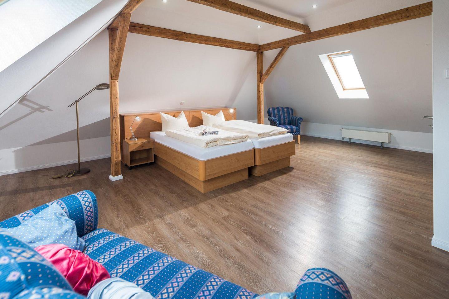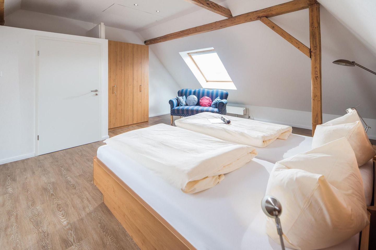 Die geräumige Wohnung 2 erstreckt sich über zwei Etagen – den ersten Stock und das Dachgeschoss des Hauses. Über einen Eingang in der Luciusstraße gelangt man in die Wohnung. Dort stehen den Gästen zwei Schlafzimmer mit Doppelbetten zur Verfügung. Es gibt eine separate Küche mit Essbereich sowie ein Badezimmer mit Dusche und WC. Ein kleines Highlight ist die nach Osten ausgerichtete Terrasse. Im Haus gibt es die Möglichkeit, eine Waschmaschine und einen Wäschetrockner zu nutzen. Diese stehen den Gästen gegen eine Gebühr zur Verfügung, was besonders für längere Aufenthalte praktisch sein kann. Zusätzlich zum Wäscheservice bietet das Haus auch die Option, Fahrräder auszuleihen. Der Fahrradverleih bei "Molly" steht dafür zur Verfügung. Hunde sind in dieser Ferienwohnung nicht erlaubt.