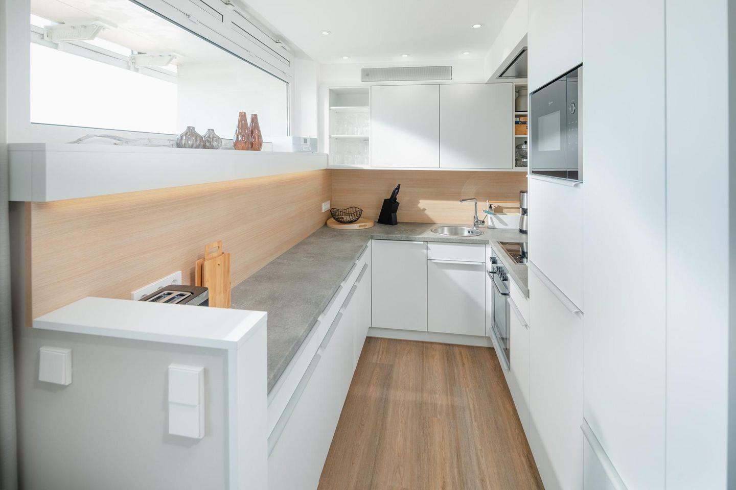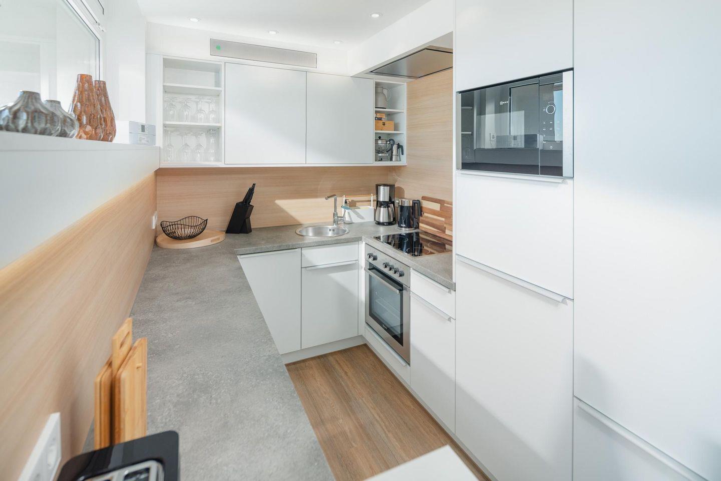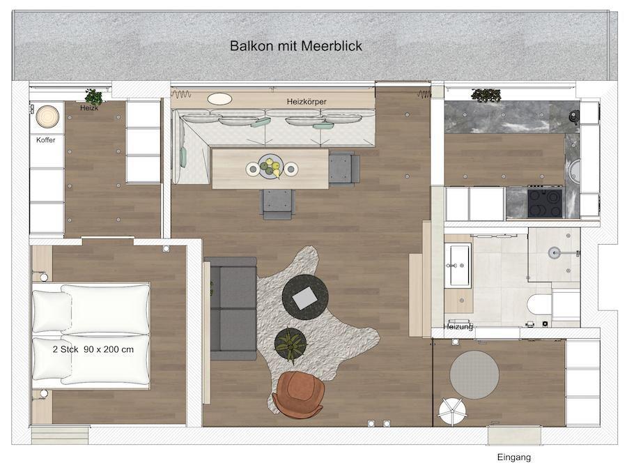 Bei der Gestaltung der Wohnung wurde Wert auf helle und natürliche Farben gelegt. Die Wohnung verfügt über ein separates Schlafzimmer mit einem Doppelbett. Das moderne Badezimmer ist mit einer Dusche und einem Handtuchtrockner ausgestattet. An den Wohn- und Essbereich grenzt eine offene Küche. Die Küche ist voll ausgestattet. Vom Balkon aus hat man einen seitlichen Blick auf das Meer. Die Wohnung wird seit dem 01.01.2023 ohne Parkplatz angeboten. Waschmaschine und Wäschetrockner befinden sich im Haus und stehen (für die gemeinschaftliche Nutzung gegen Münzeinwurf) zur Verfügung, was besonders für längere Aufenthalte von Vorteil ist. Hunde sind in dieser Wohnung nicht erlaubt.