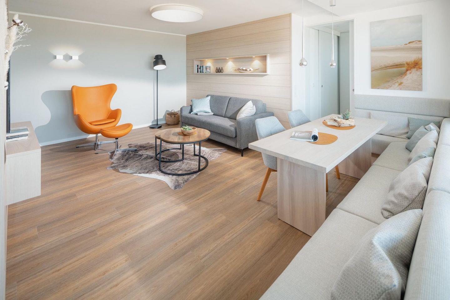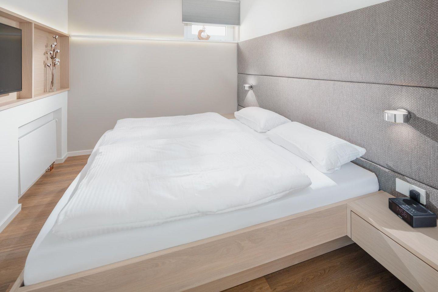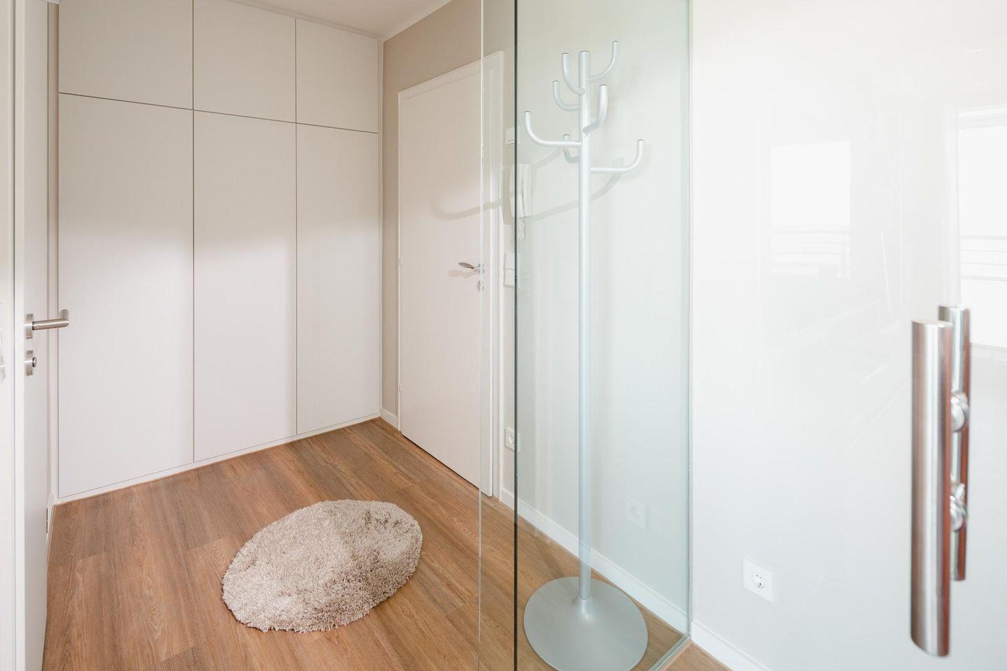 Bei der Gestaltung der Wohnung wurde Wert auf helle und natürliche Farben gelegt. Die Wohnung verfügt über ein separates Schlafzimmer mit einem Doppelbett. Das moderne Badezimmer ist mit einer Dusche und einem Handtuchtrockner ausgestattet. An den Wohn- und Essbereich grenzt eine offene Küche. Die Küche ist voll ausgestattet. Vom Balkon aus hat man einen seitlichen Blick auf das Meer. Die Wohnung wird seit dem 01.01.2023 ohne Parkplatz angeboten. Waschmaschine und Wäschetrockner befinden sich im Haus und stehen (für die gemeinschaftliche Nutzung gegen Münzeinwurf) zur Verfügung, was besonders für längere Aufenthalte von Vorteil ist. Hunde sind in dieser Wohnung nicht erlaubt.