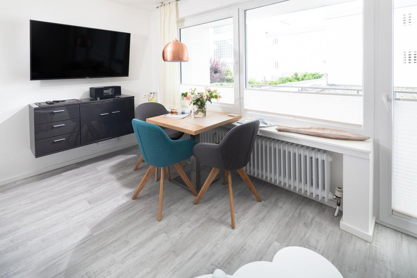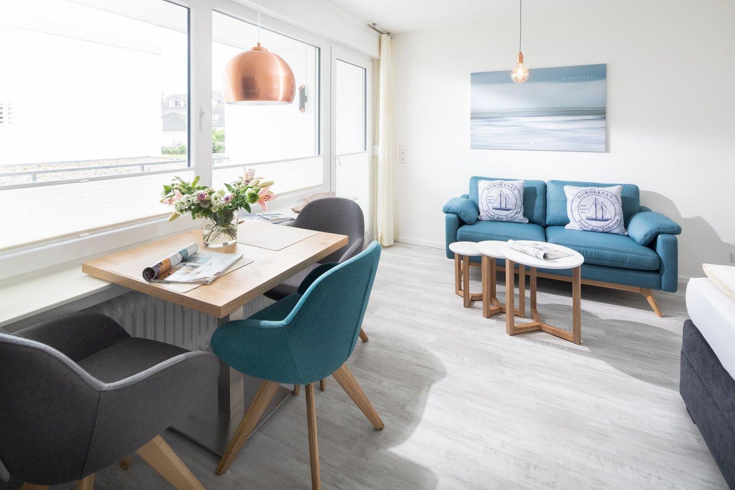 Beim Design der Wohnung wurde auf hochwertige Möbel Wert gelegt. Zudem hat die Wohnung einen ca. 10 qm grossen Südbalkon. Das Grillen ist auf dem Balkon nicht gestattet. Das Einzimmerapartment ist mit einem Doppel-Boxspringbett ausgestattet.