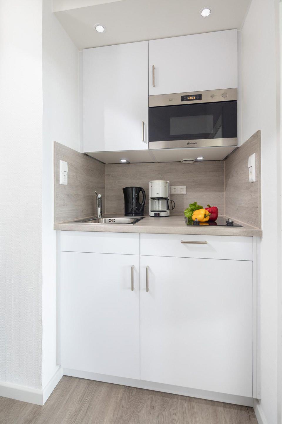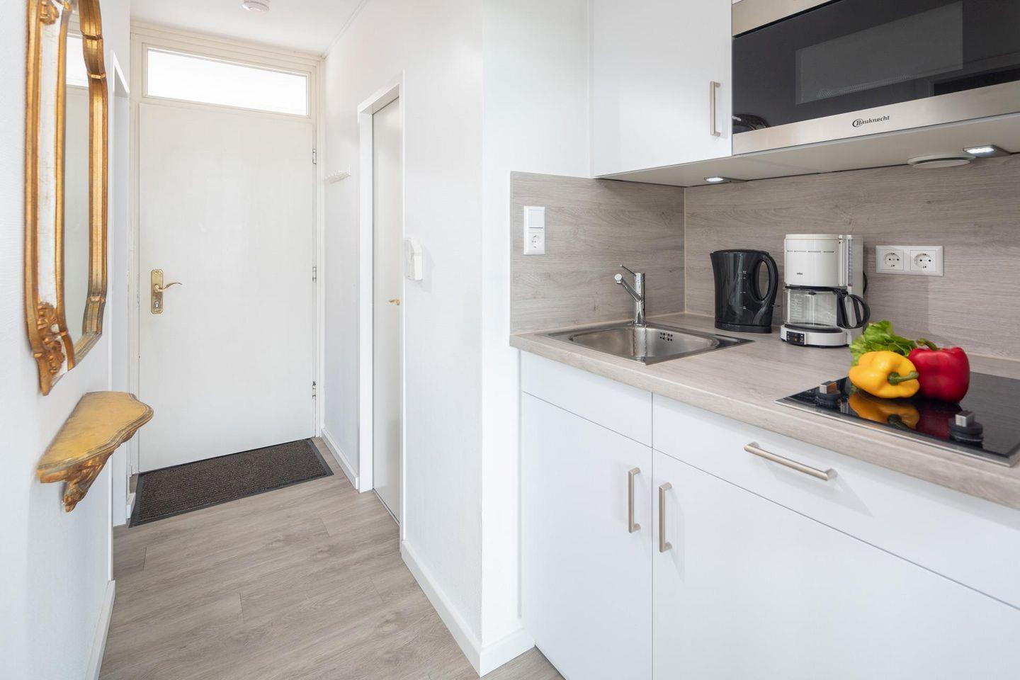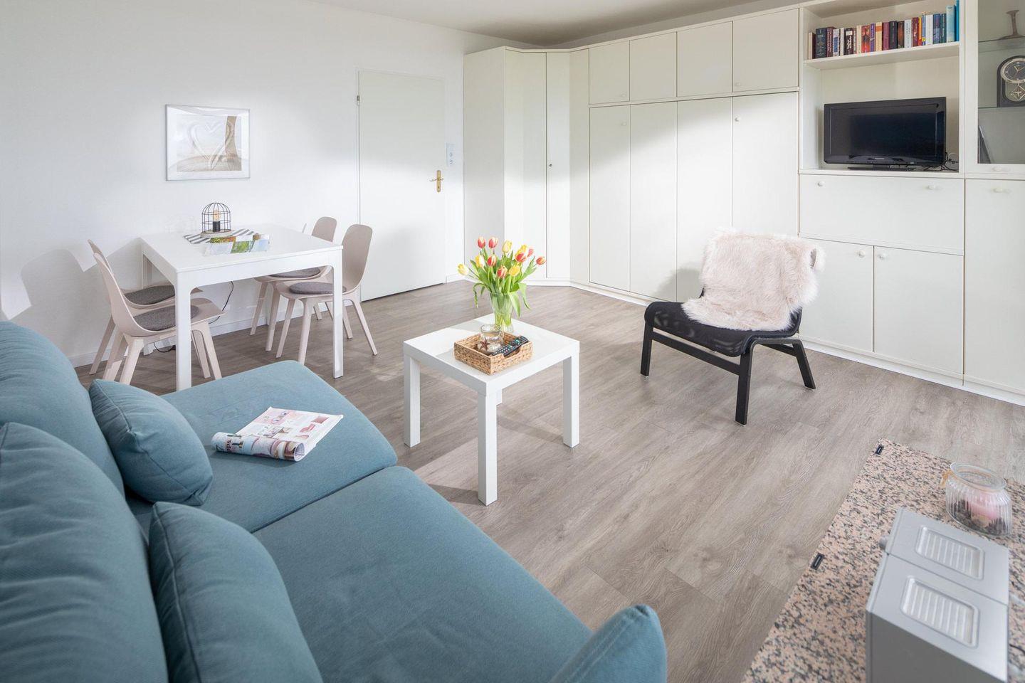 Die Unterkunft verfügt über zwei Schlafmöglichkeiten. Im kleinen Schlafzimmer befindet sich ein Doppelbett (1,50m x 2,00m). Für Familien mit einem Kind oder Personen, die getrennt schlafen möchten, steht im Wohnzimmer ein Doppel-Schrankbett zur Verfügung. Dieses ist mit zwei Matratzen ausgestattet. Das Badezimmer der Wohnung ist mit einer Dusche, einem WC und einem Handwaschbecken ausgestattet. Die kleine Küche ist funktional eingerichtet und verfügt über einen Herd, einen Kühlschrank, einen Wasserkocher und eine Kaffeemaschine. Die Wohnung hat zudem einen Balkon, dieser ist mit Möbeln ausgestattet.