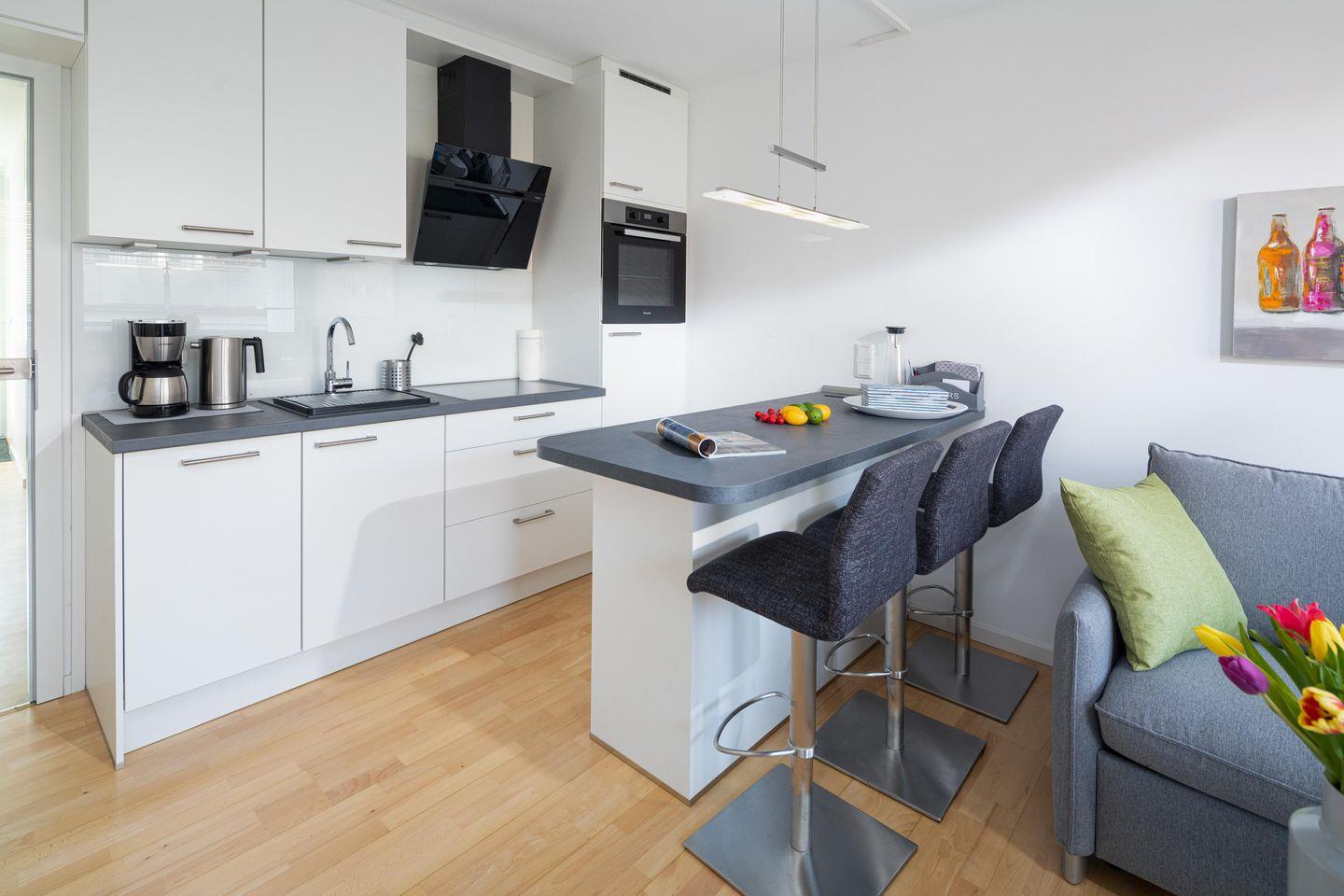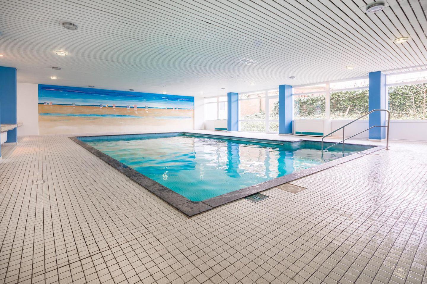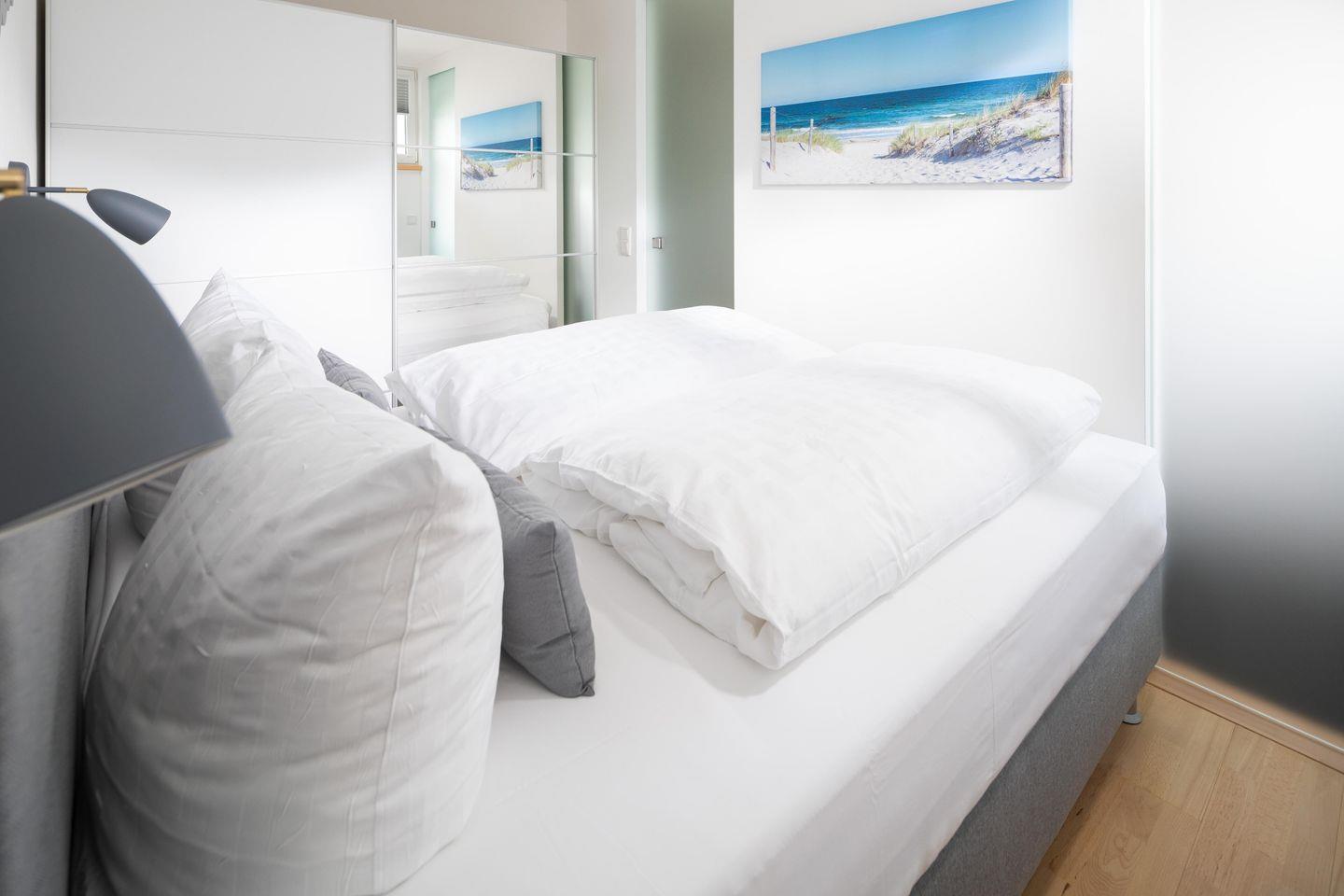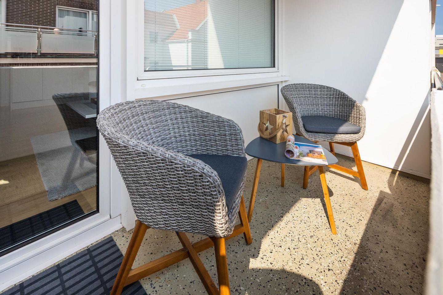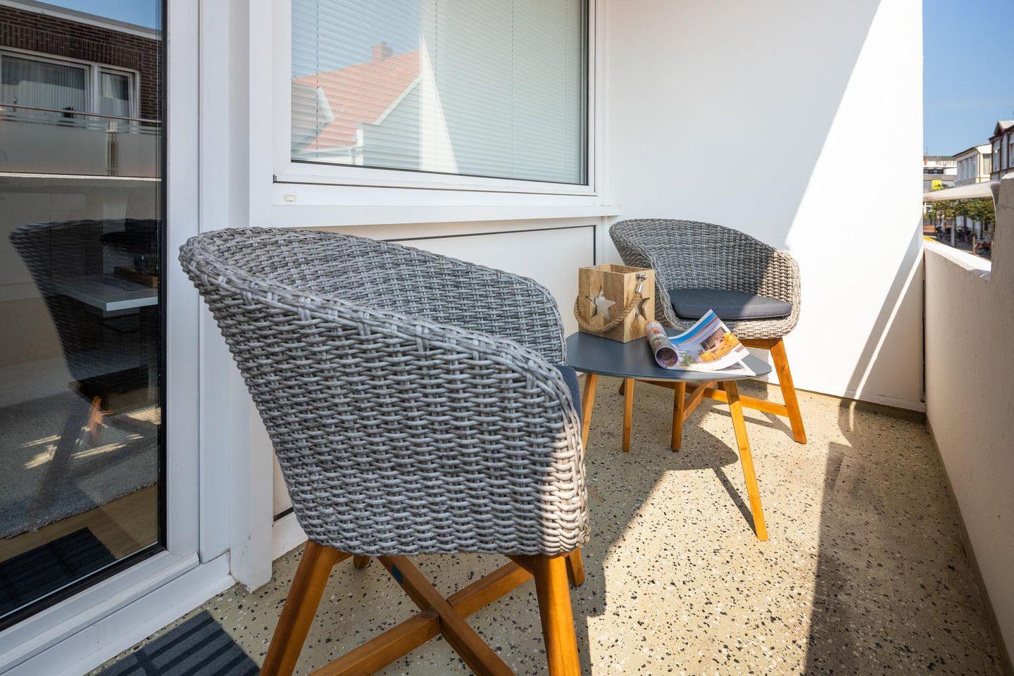 Bei der Einrichtung der Wohnung wurde Wert auf helle und natürliche Farben gelegt. Das Schlafzimmer ist mit einem Doppelbett ausgestattet und es wurde mit einem zusätzlichen Fernseher eingerichtet. Der Wohn- und Essbereich ist vollumfänglich ausgestattet. Die Wohnung verfügt über einen nach Osten ausgerichteten Balkon. Ein Highlight des Hauses "Iderhoff" ist der beheizte Swimming-Pool, der den Gästen zur Verfügung steht. Es wird jedoch darauf hingewiesen, dass die Nutzung des Schwimmbades den bekannten Hygienevorschriften unterliegt, und es können kurzfristige Änderungen auftreten. Eine Waschmaschine und ein Wäschetrockner stehen den Gästen im Haus zur gemeinschaftlichen Nutzung gegen Münzeinwurf zur Verfügung. Haustiere sind hier nicht erlaubt.