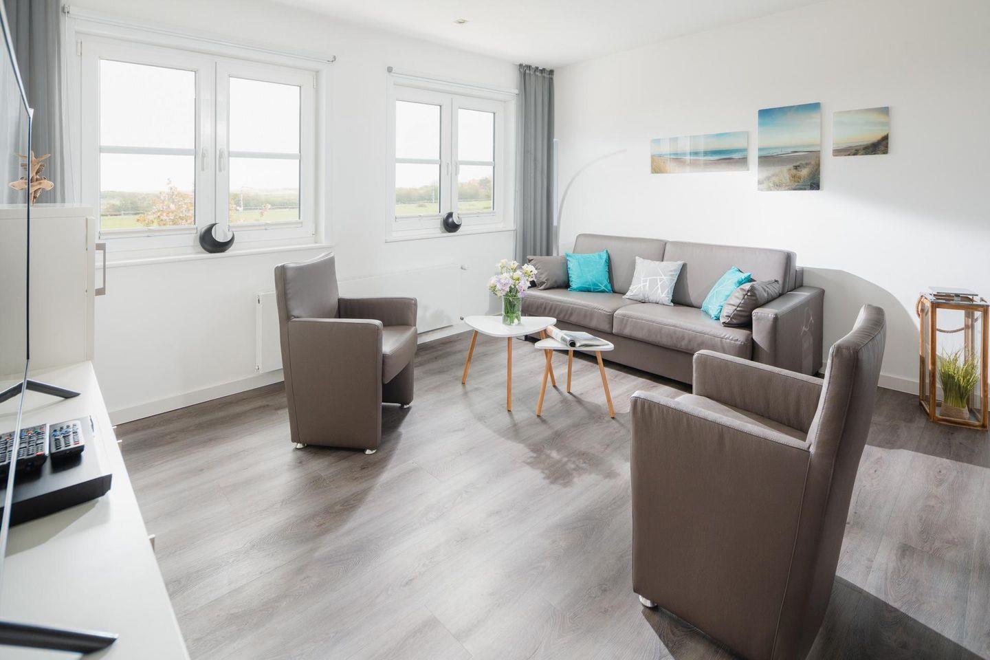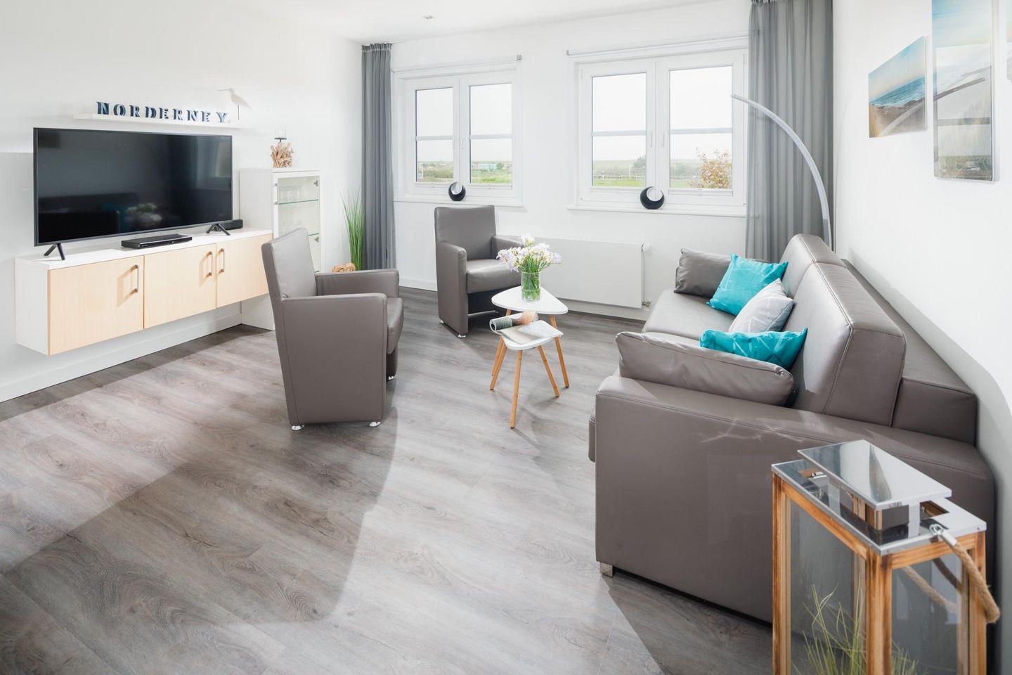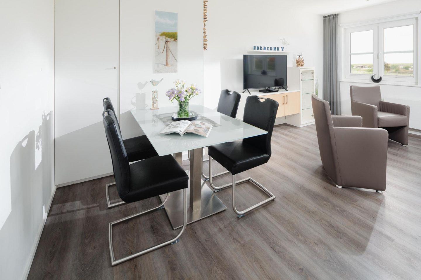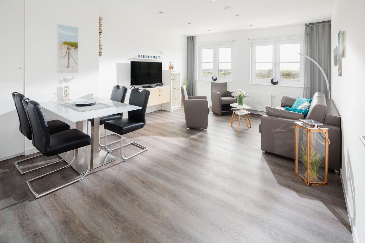 Die Ferienwohnung "Up Süderdün Dorie" befindet sich in der Straße "up Süderdün", die sich zwischen dem Fährhafen und der Innenstadt befindet. Die Wohnung "Dorie" liegt im Obergeschoss und bietet einen Blick über die Pferdewiesen und den Deich hinweg auf das nahe Meer. Der Weststrand ist ebenfalls nicht weit entfernt. Die Wohnung bietet Platz für bis zu vier Personen.