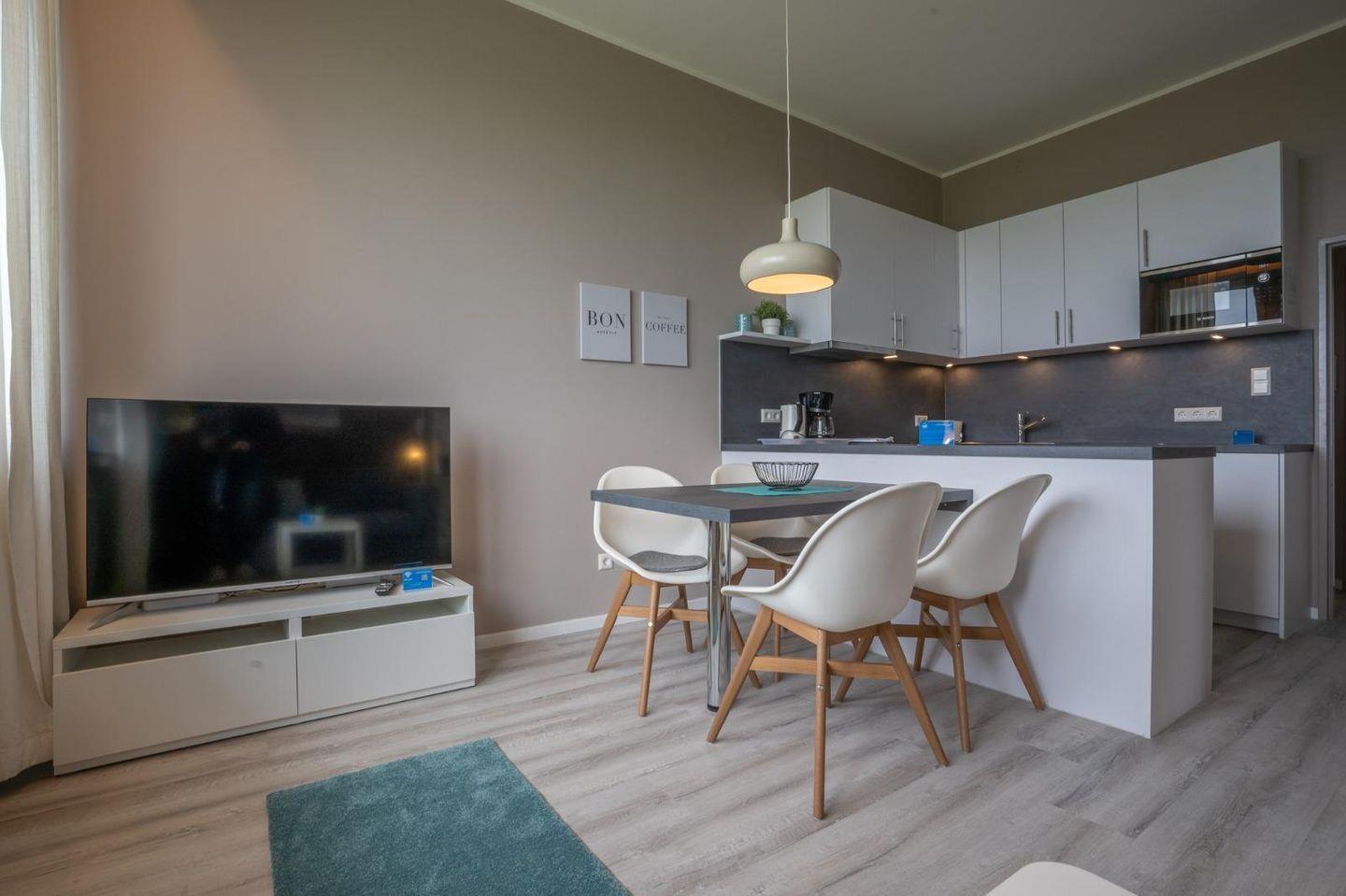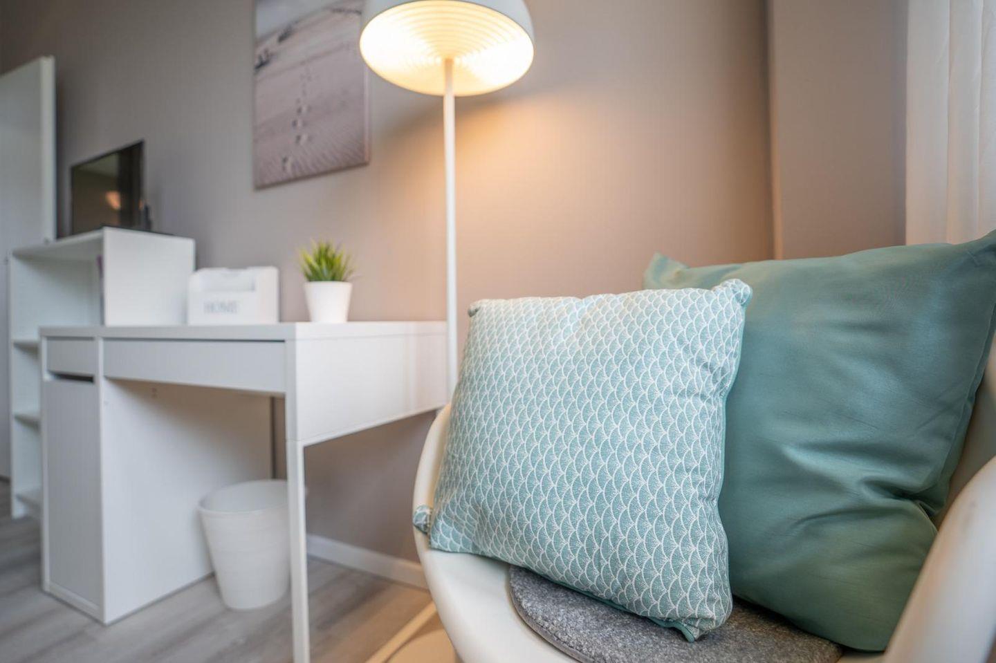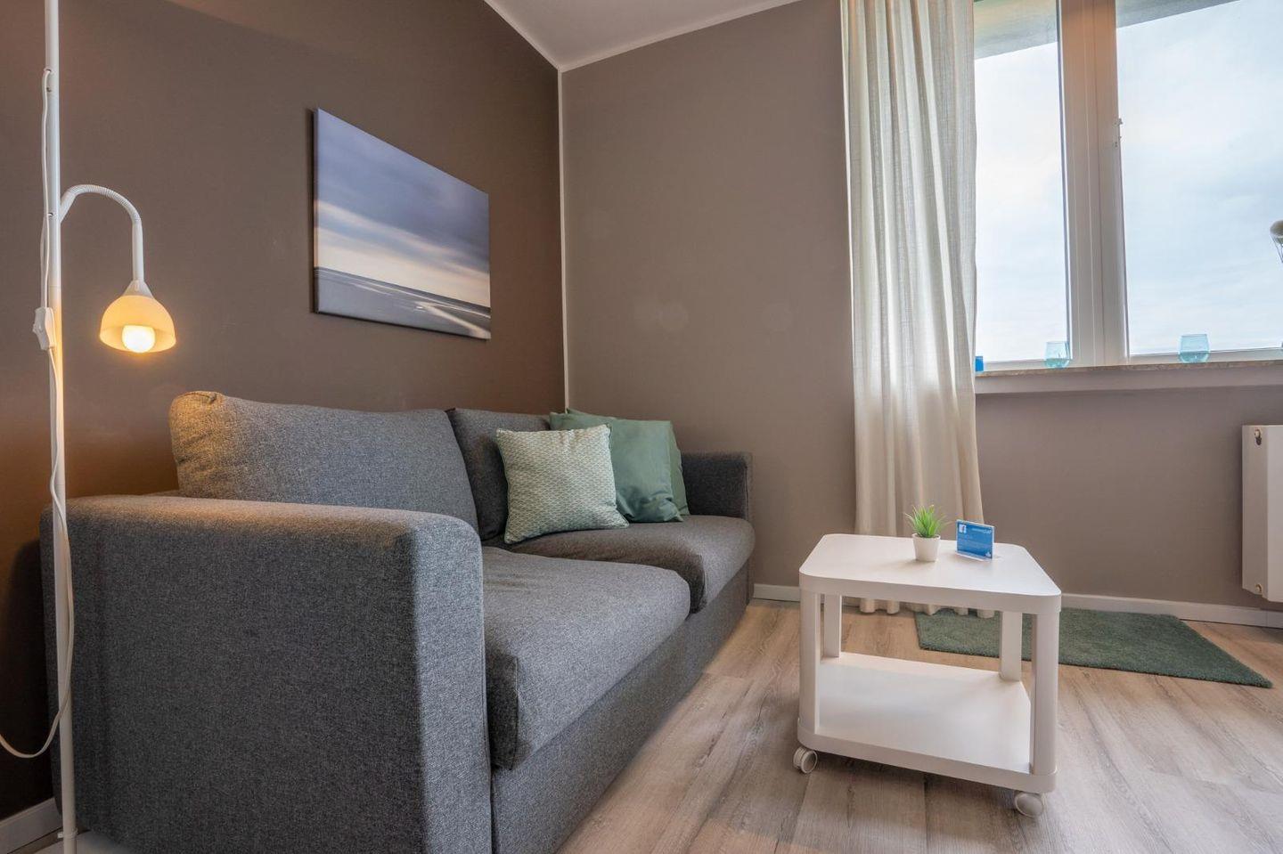 Die Wohnung wurde hell und mit Naturfarben eingerichtet. Das Schlafzimmer wurde mit einem Doppelbett (Breite 1,80m) ausgestattet. Im Wohnzimmer befindet sich eine Schlafcouch (ausgezogen 1,40m Breite). Dadurch bietet die Wohnung Schlafmöglichkeiten für insgesamt bis zu 4 Personen. Im Apartmenthaus "Kaiserhof" stehen den Bewohnern eine Waschmaschine und ein Wäschetrockner (beide mit Münzeinwurf) zur Verfügung. Zusätzlich steht eine Sauna bereit, die ebenfalls gegen Münzeinwurf nutzbar ist. Es ist zu beachten, dass das Schwimmbad aufgrund eines technischen Defektes geschlossen ist. Fahrräder können vor dem Haus (Nordseite) oder im Fahrradraum abgestellt werden. Hunde sind in dieser Wohnung nicht erlaubt.