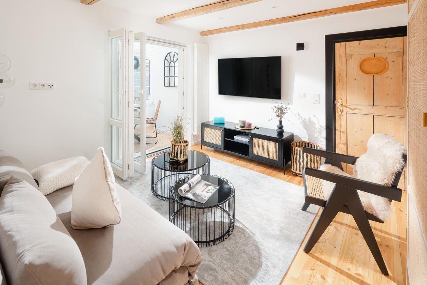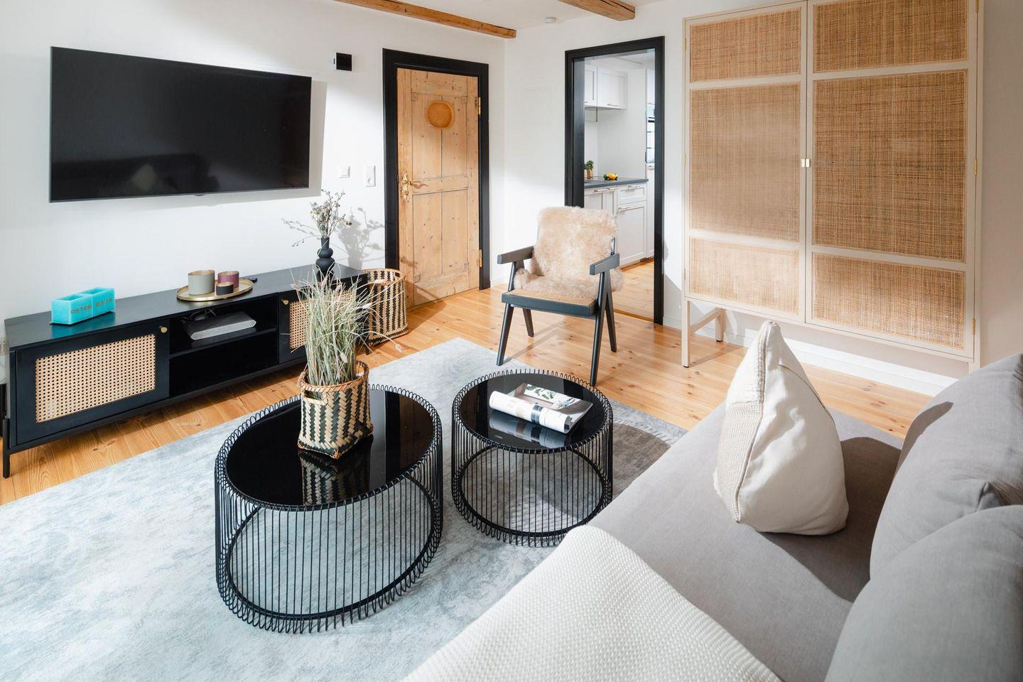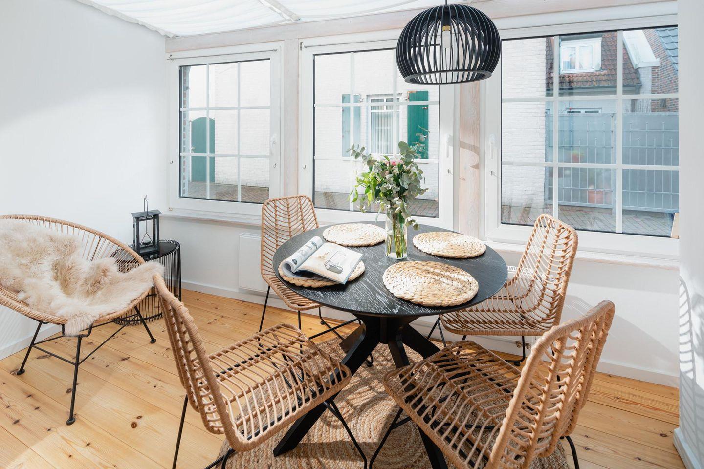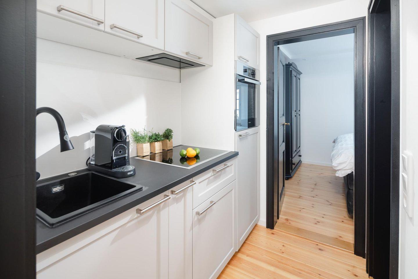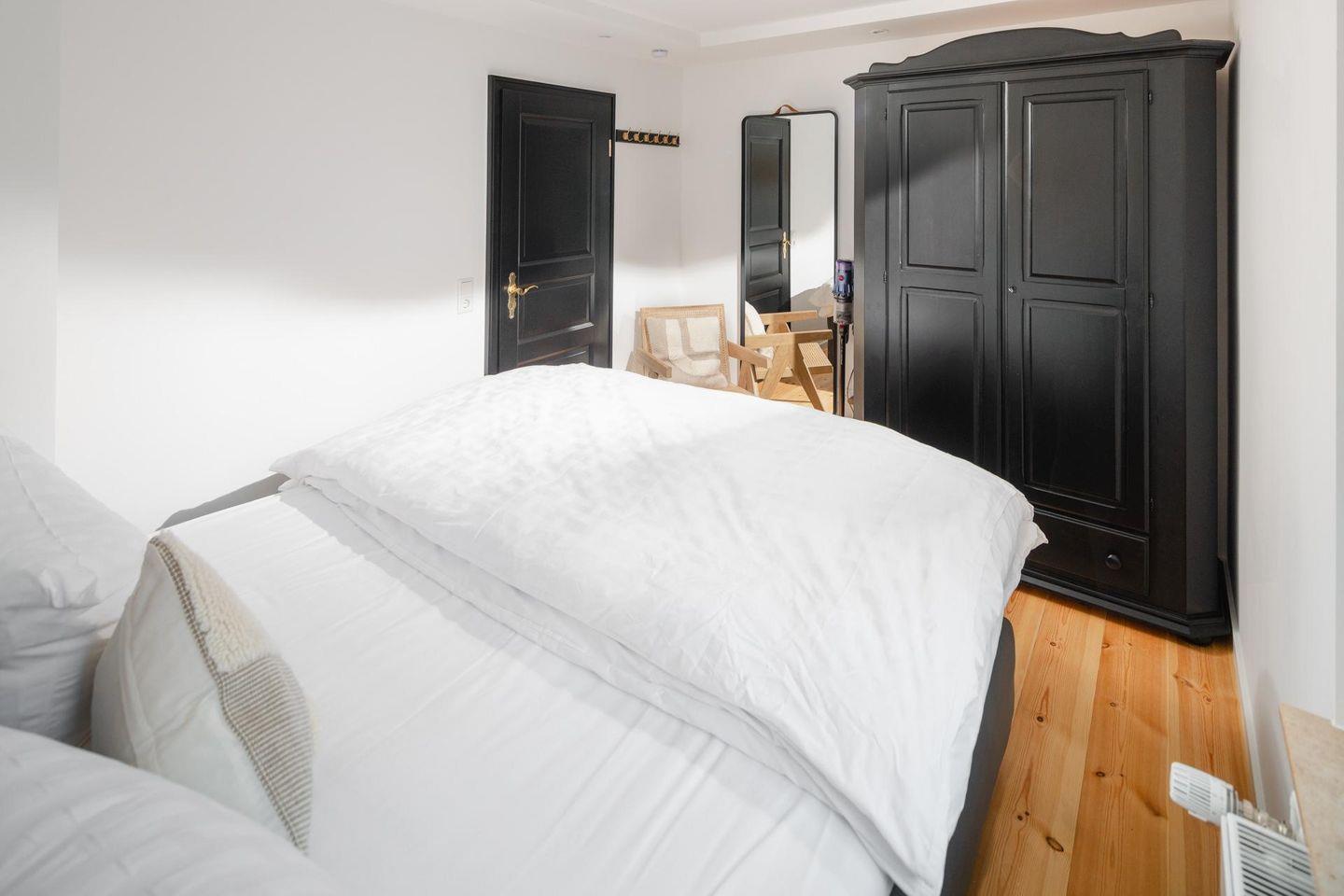 Der Wohnbereich beherbergt eine moderne Küchenzeile mit einer Nespresso-Kapselmaschine. Das separate Schlafzimmer, das abseits der Straße liegt, ist mit einem Doppelbett ausgestattet. Für getrennt schlafende Gäste lässt sich das Ligne-Roset-Sofa im Wohnbereich (als weitere Schlafmöglichkeit) nutzen. Ein Highlight der Wohnung ist die Veranda. Hier darf auch der vierbeinige Freund mitkommen, denn die Ferienwohnung heißt auch Hunde herzlich willkommen. Erlaubt ist maximal 1 Hund (Höhe maximal kniehoch). Die Hundewiese befindet sich in der Nähe des Fährhafens (kein Leinenzwang).