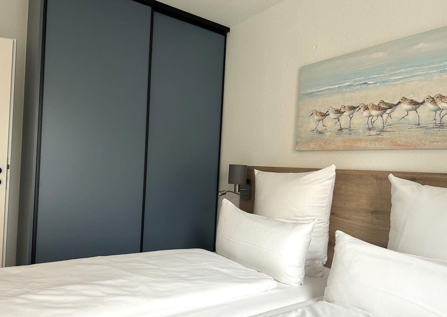 Das Appartement in der 1. Etage verfügt über ein separates Schlafzimmer mit Doppelbett, ein separates Schlafzimmer mit zwei Einzelbetten (TV),Wohn-Schlafraum (Schlafsofa) mit Küchenzeile, Balkon, Diele, Dusche/WC und Kabel-TV.