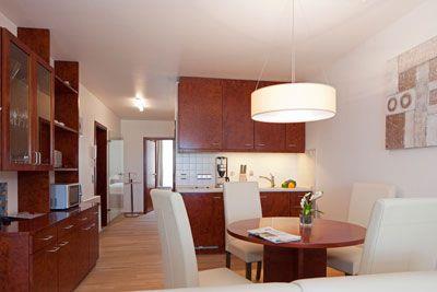Das Appartement im Erdgeschoss verfügt über ein separates Schlafzimmer mit einem Doppelbett, Dusche/WC, Wohn-Schlafraum (Schlafsofa) mit Küchenzeile und
