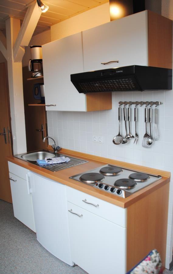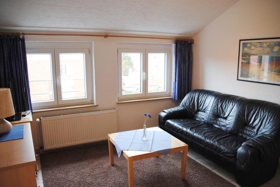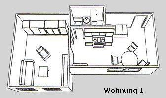 Das Appartement in der 2. Etage verfügt über einen Wohn-Schlafraum mit Doppelschrankbett (einzeln klappbar), separate Wohnküche mit Essecke und Schrankbett, Dusche/WC und Kabel-TV (kein Telefon).