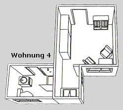 Das Single-Appartement in der 1. Etage verfügt über einen Wohn-Schlafraum (Schrankbett 140*200) mit Pantry-Küche und Kabel-TV (kein Telefon). Dusche/WC befinden sich außerhalb des Appartements auf halber Treppe, ist jedoch zur alleinigen Nutzung. NICHTRAUCHERWOHNUNG!!!