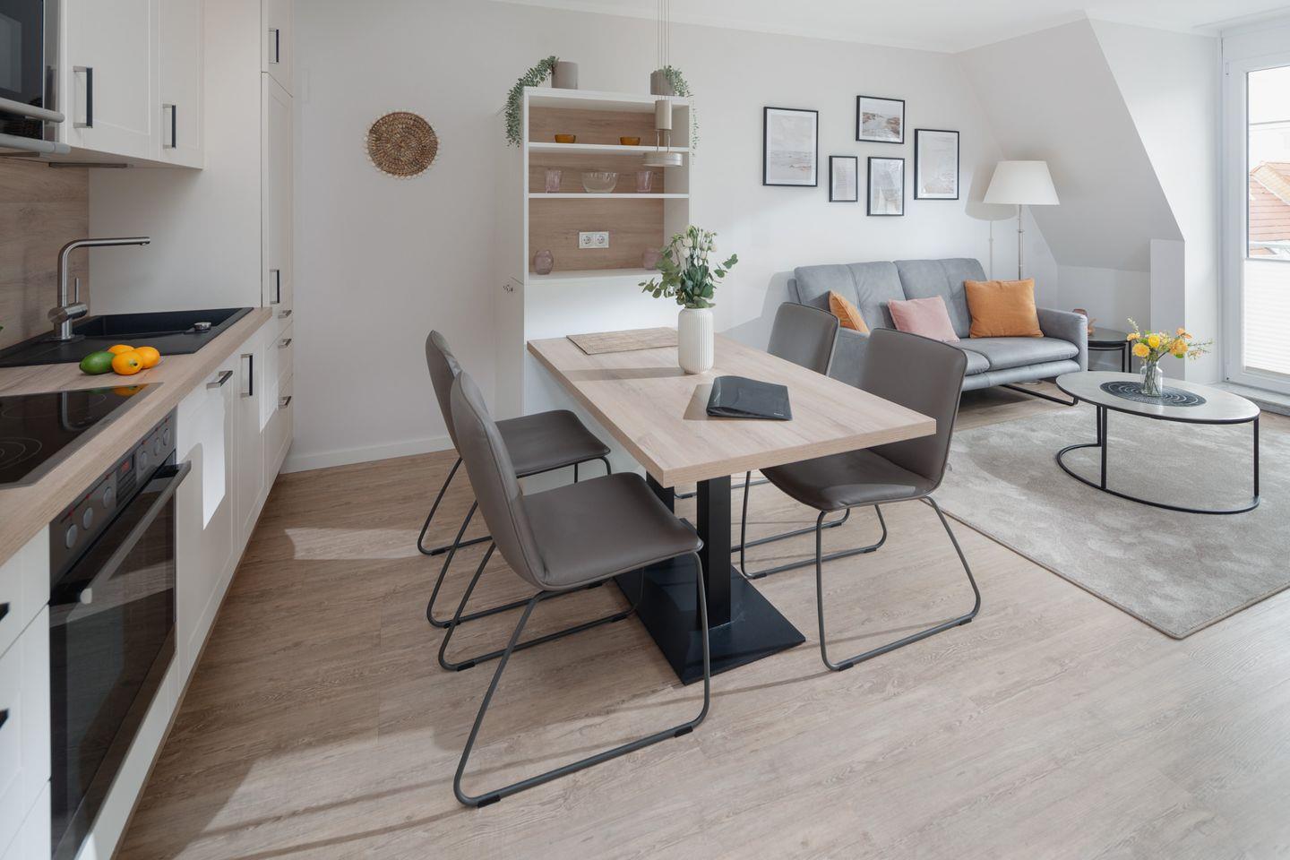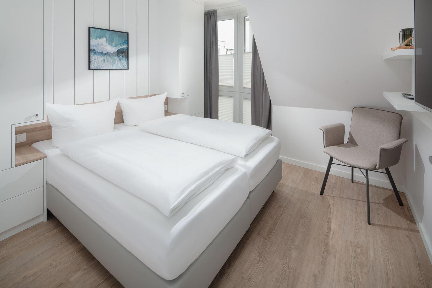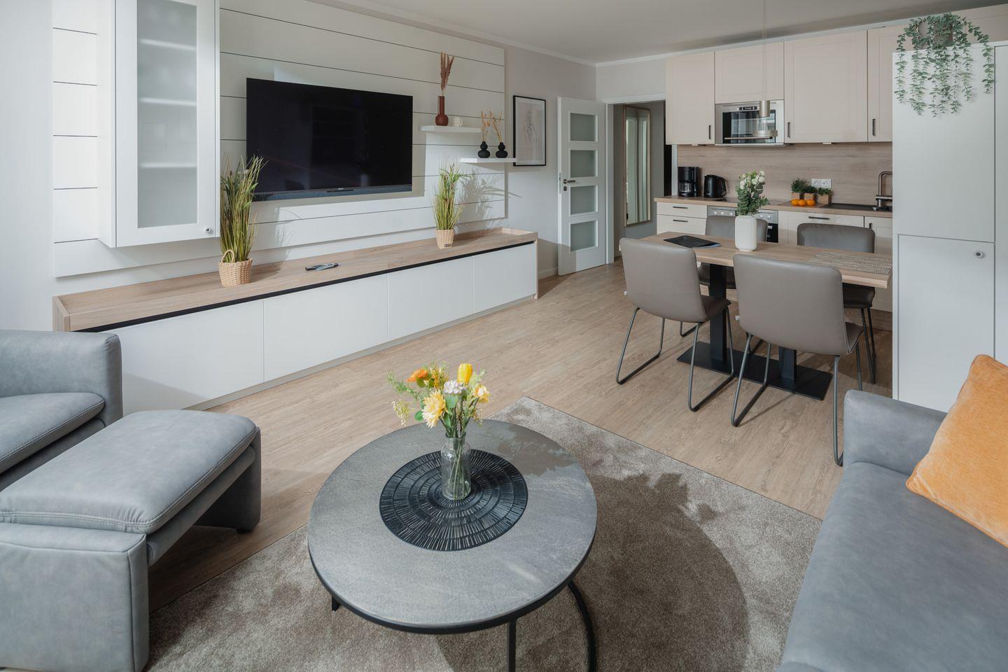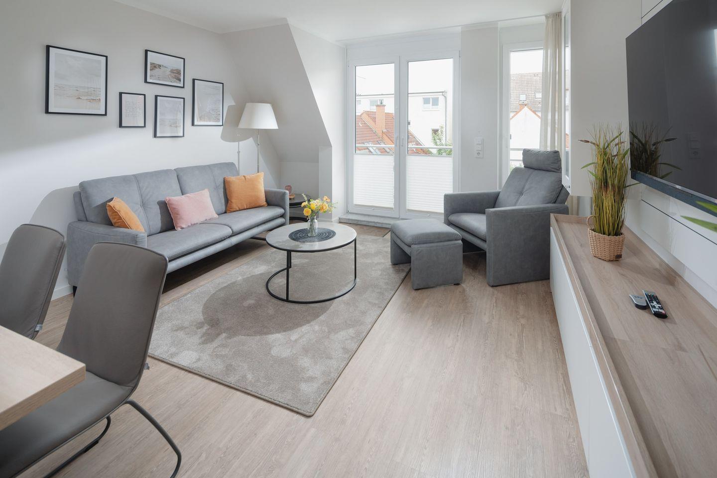 Das neu renovierte (2023) 3-Raum-Appartement im 2. Obergeschoss verfügt über zwei komfortable Schlafzimmer mit je einem Doppelbett, hellen Wohnbereich aus hochwertigen Möbeln (Smart-TV), Küchenzeile mit Essecke sowie Badezimmer mit Dusche/WC. Der Balkon lädt zum entspannen & sonnenbaden ein.