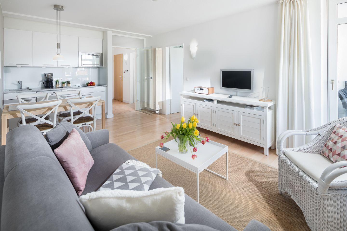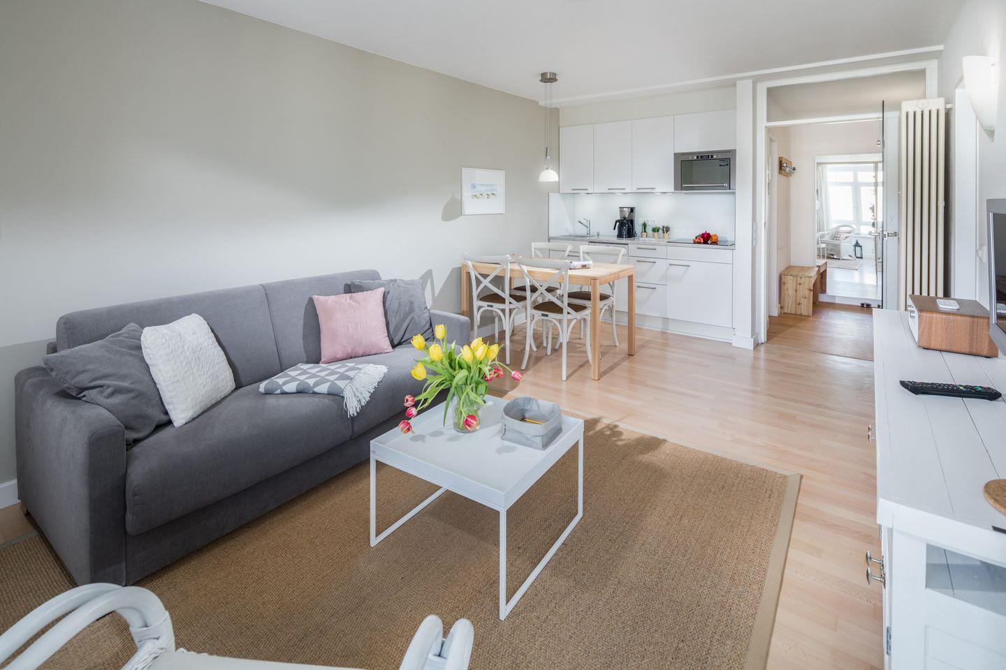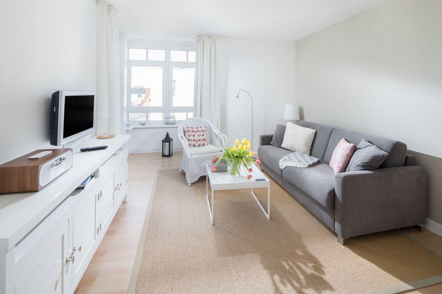 Das im Frühjahr 2017 renovierte Appartement verfügt über ein separates Schlafzimmer mit Doppelbett, Wohn-Schlafraum (Schlafsofa, Kabel-TV) mit