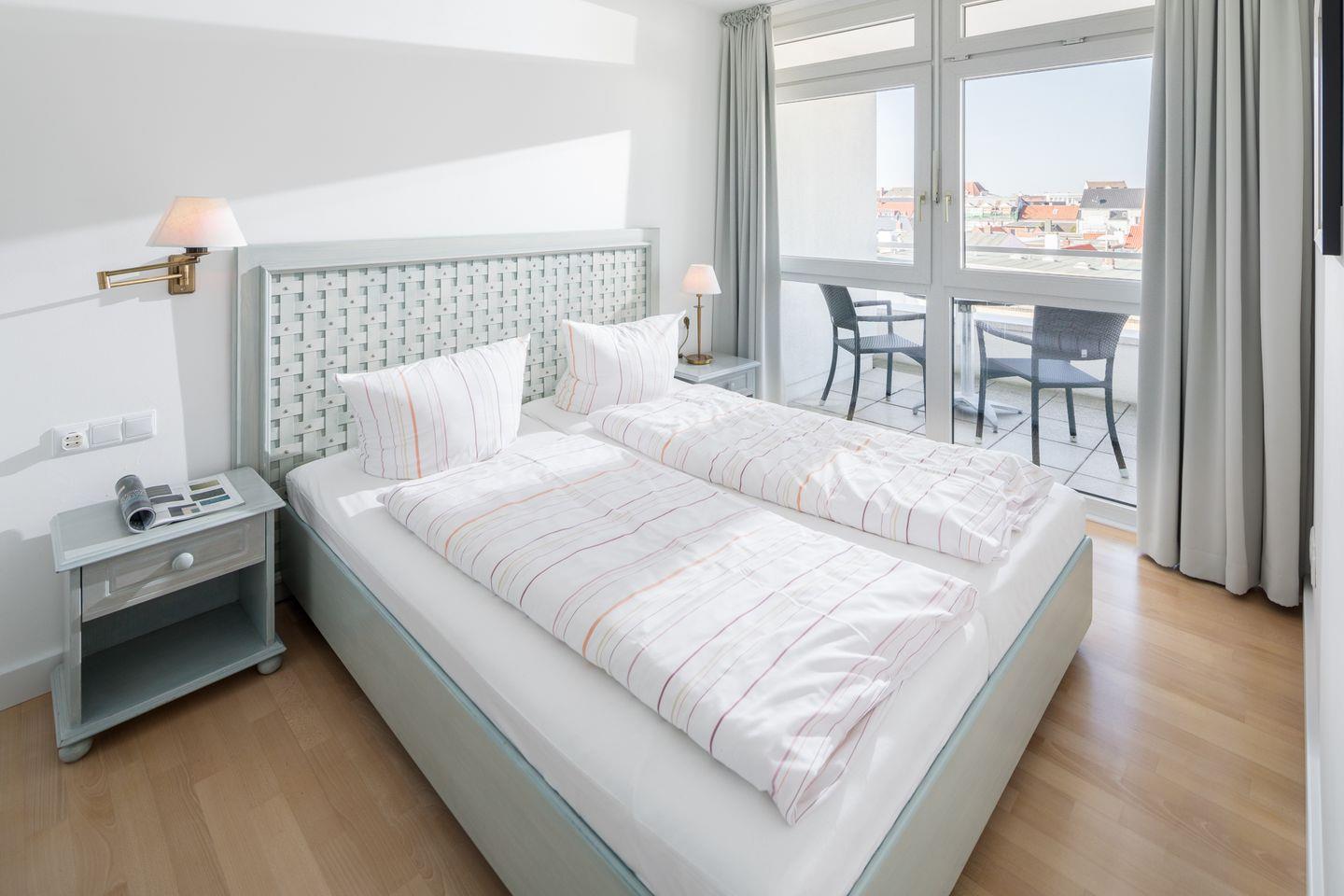 Schlafzimmer mit Doppelbett, Wohn-Schlafraum (Schlafsofa, Kabel-TV) mit