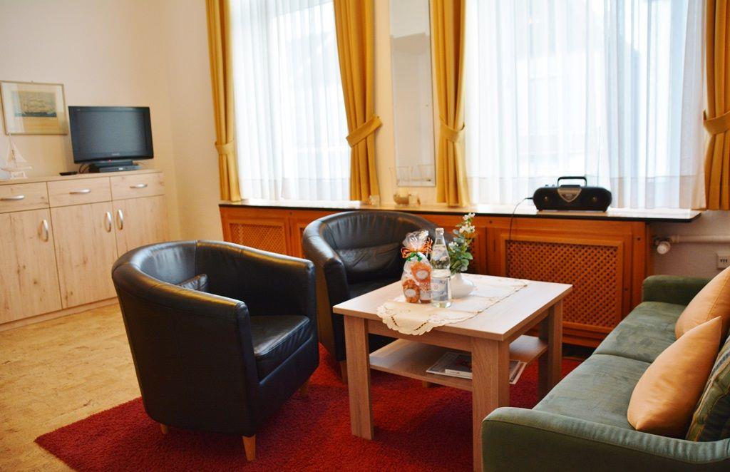 Die Wohnung im 1. OG verfügt über ein separates Schlafzimmer mit Doppelbett, separate Küchenzeile (4-Platten-Herd), Dusche/WC, Diele und Wohn-Schlafraum (Schlafsofa) mit Kabel-TV und Essecke. NICHTRAUCHERWOHNUNG!