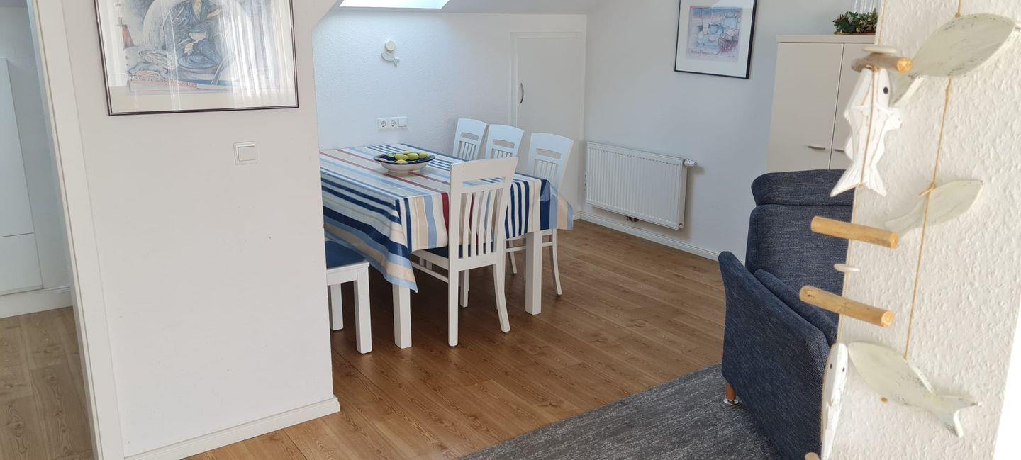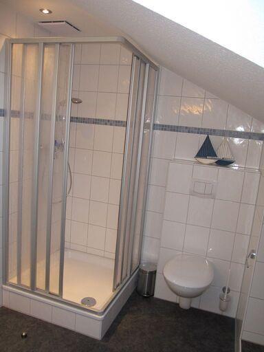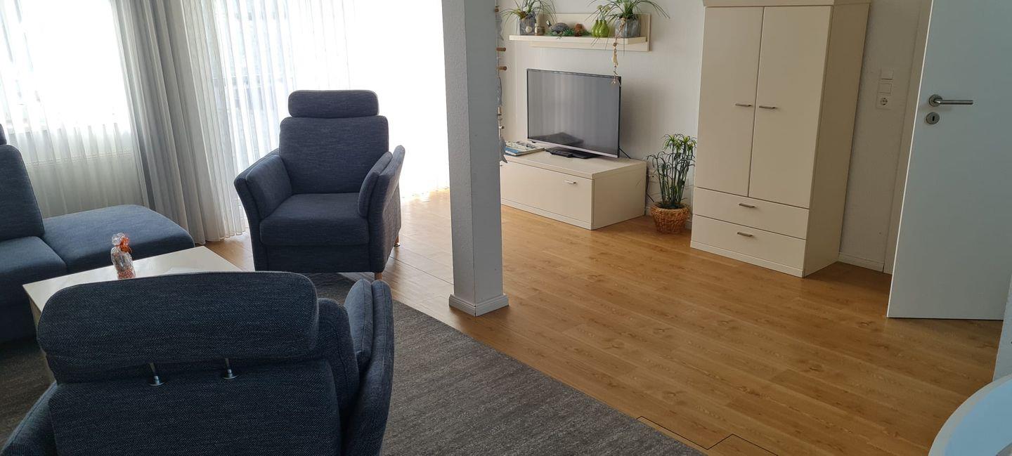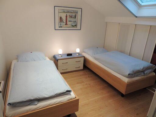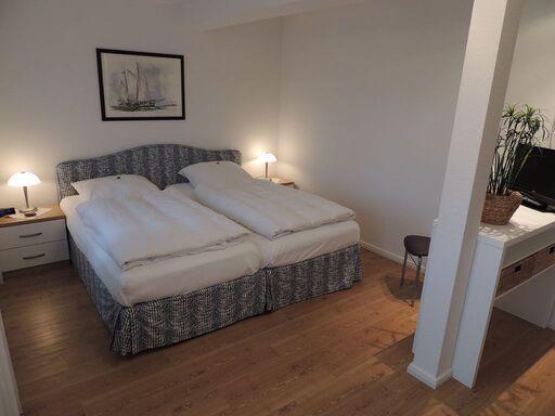 Das Appartement im 2. OG verfügt über ein separates Schlafzimmer mit Doppelbett, ein separates Schlafzimmer mit zwei Einzelbetten (ein Gästebett kann auf Wunsch bereitgestellt werden), Küchenzeile (4-Platten-Herd, Backofen, Mikrowelle, Spülmaschine), Diele, Badezimmer mit Dusche/WC und zwei Waschbecken, Wohnraum mit Kabel-TV und Essecke. NICHTRAUCHERWOHNUNG!