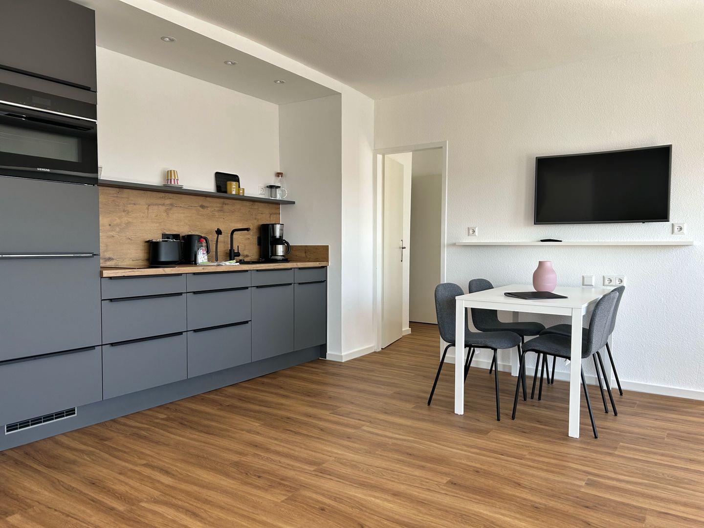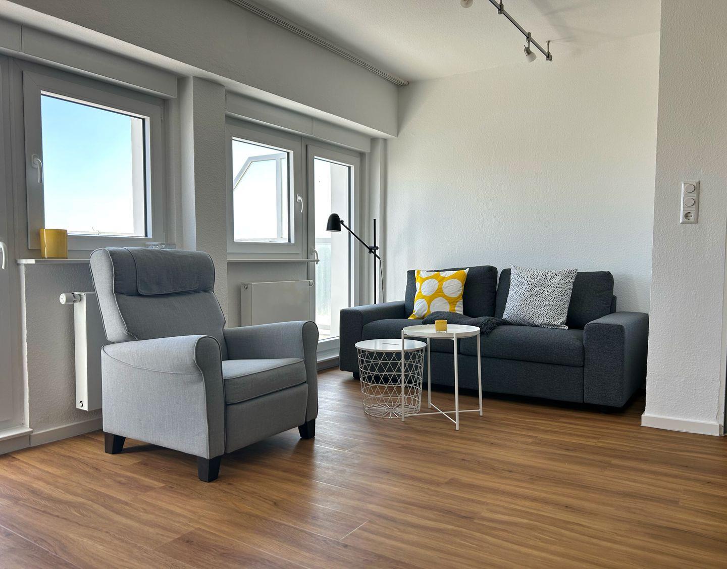 Das renovierte 2-Raum-Appartement in der 4. Etage verfügt über ein separates Schlafzimmer mit Doppelbett (nur 1,90 m lang), Wohn-Schlafraum, TV und (Schlafsofa) mit Küchenzeile (2-Platten-Herd, Backofen), Diele, Balkon, Badezimmer mit Dusche/WC. NICHTRAUCHERWOHNUNG!