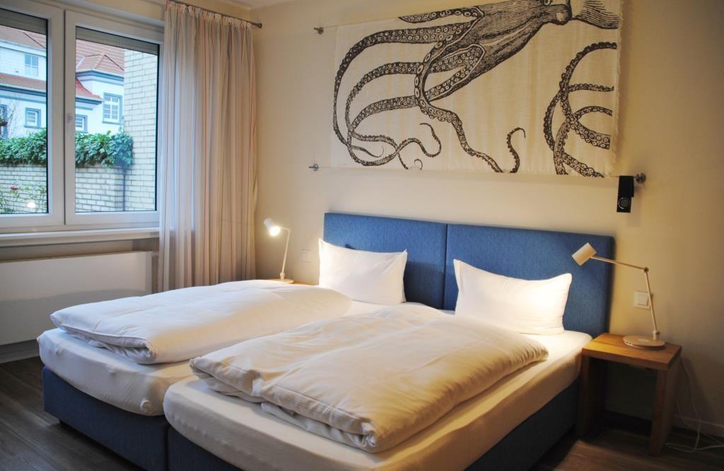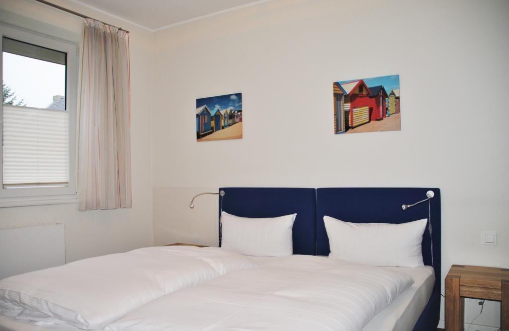Erholsame Nächte bieten die beiden Schlafzimmer mit je einem Boxspringdoppelbett, welche komplett verdunkelbar sind. An eines der Schlafzimmer grenzt ein eigenes Bad mit Eckbadewanne, Dusche, Fön und WC. Ein weiteres Badezimmer mit ebenerdiger Dusche, Fön und WC ist ebenso vorhanden und von der Diele aus zu betreten. Die Duschen sind ebenerdig.