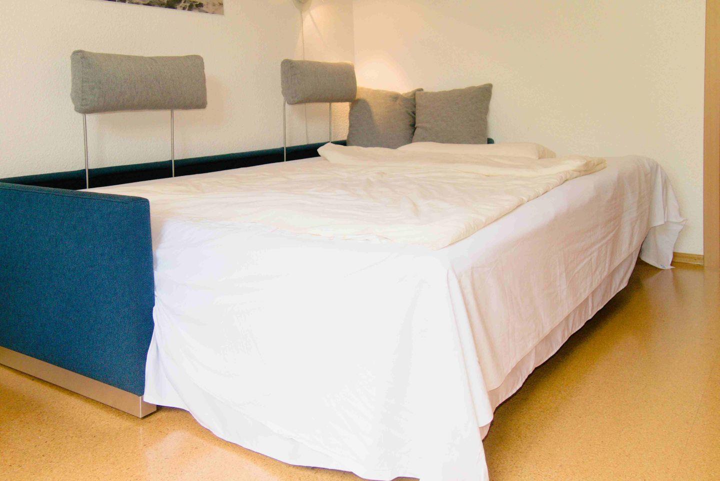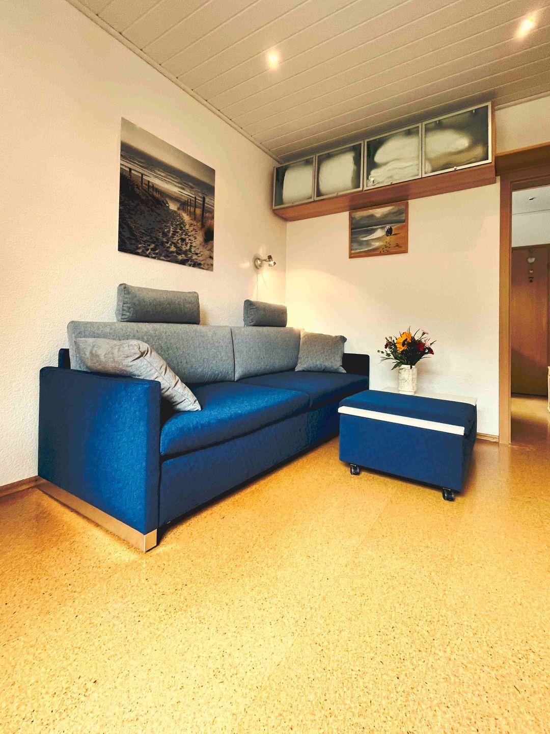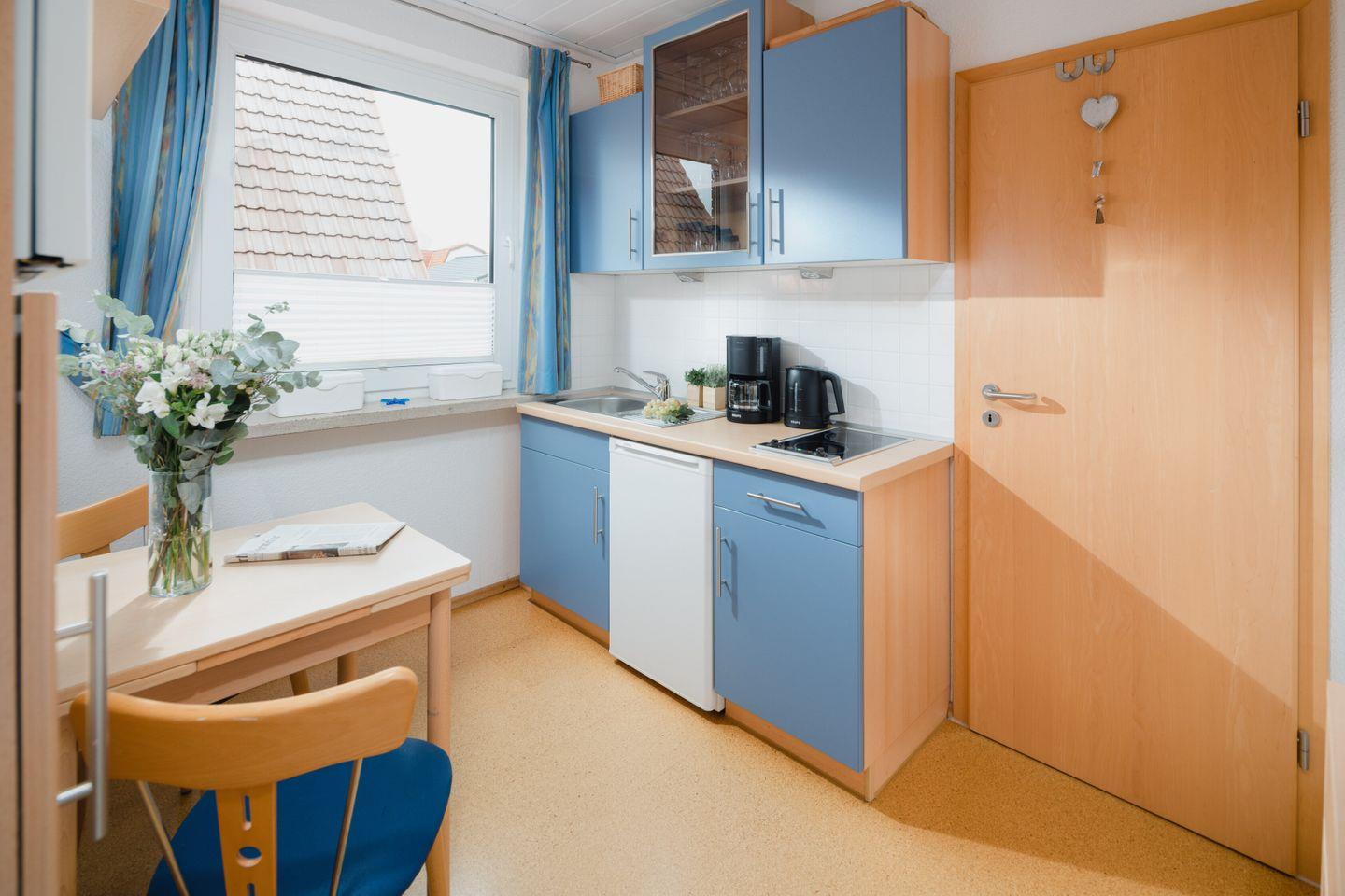 Die kuschelige, zentral gelegene 1-Raum-Ferienwohnung (22qm²) verfügt über einen Wohn-/Schlafraum (TV) mit Schlafsofa (140x195cm), Küche (2-Platten-Ceranfeld, Mikrowelle) mit Essbereich sowie separates Badezimmer mit Dusche & WC. Über den Hausflur erreichen Sie den wohnungseigenen Süd-Balkon.