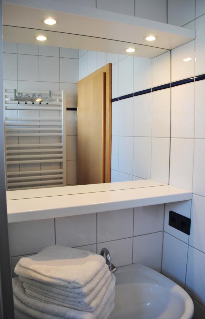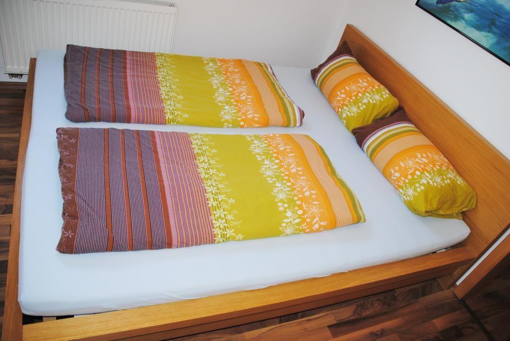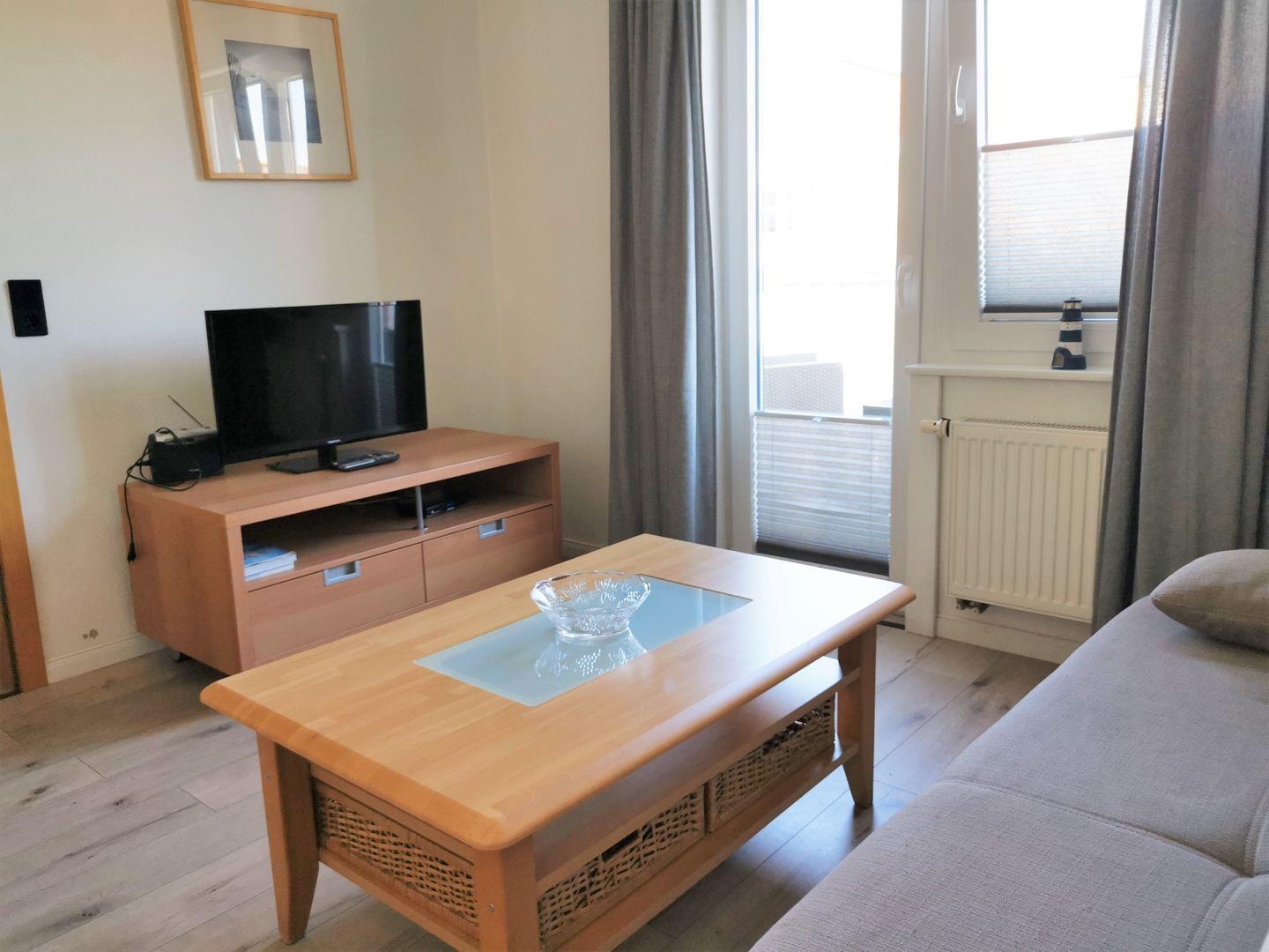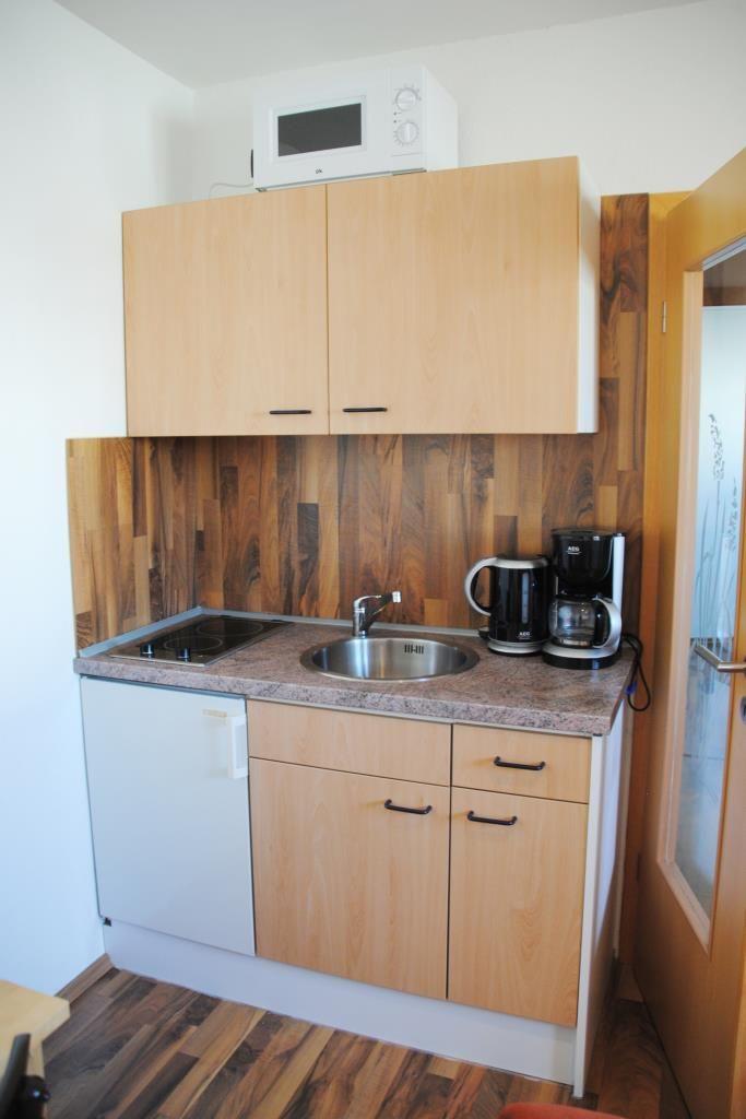Die 2-Raum-Wohnung liegt im ersten Obergeschoss und besteht aus einem separaten Schlafzimmer mit Futonbett (Kinderbett passt nicht in das Schlafzimmer), einem Wohnzimmer mit integrierter Küchenzeile (2-Platten-Ceranfeld, Mikrowelle, "Mini"-Gefrierfach), einem Duschbad mit WC und Fenster sowie einer Diele. Seit 2022 verfügt die Wohnung über einen Balkon! WLAN vorhanden.
