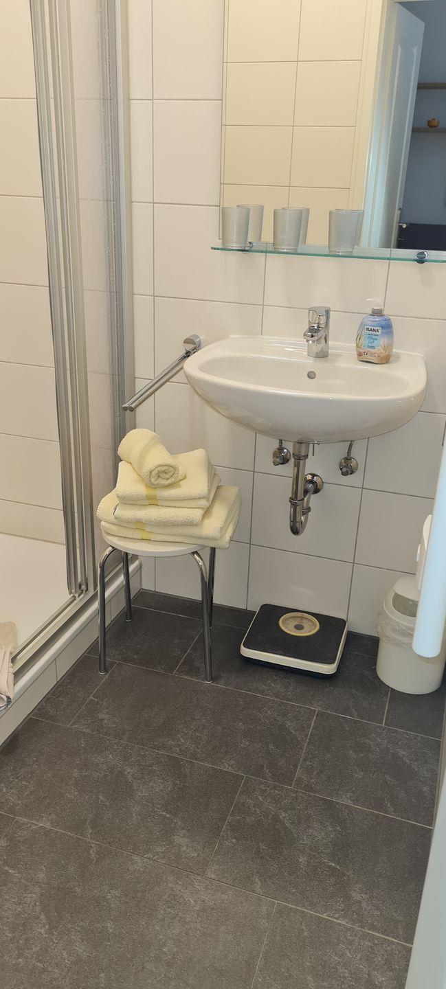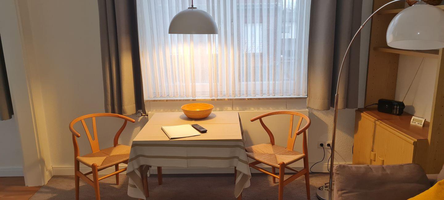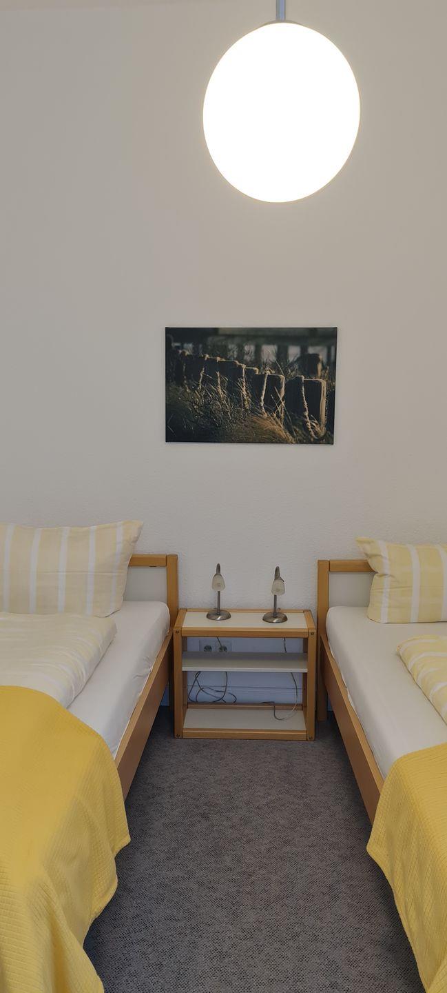 Das 2-Raum-Appartement in der 1. Etage verfügt über ein Wohnraum mit Schlafsofa (TV) und Essecke, einer Küchenzeile (4-Platten-Ceranfeld). Ein Schlafzimmer mit zwei Einzelbetten und Dusche/WC sind vorhanden. Ein Parkplatz kann bei Verfügbarkeit für 2,50 € pro Tag hinzugemietet werden. WLAN.