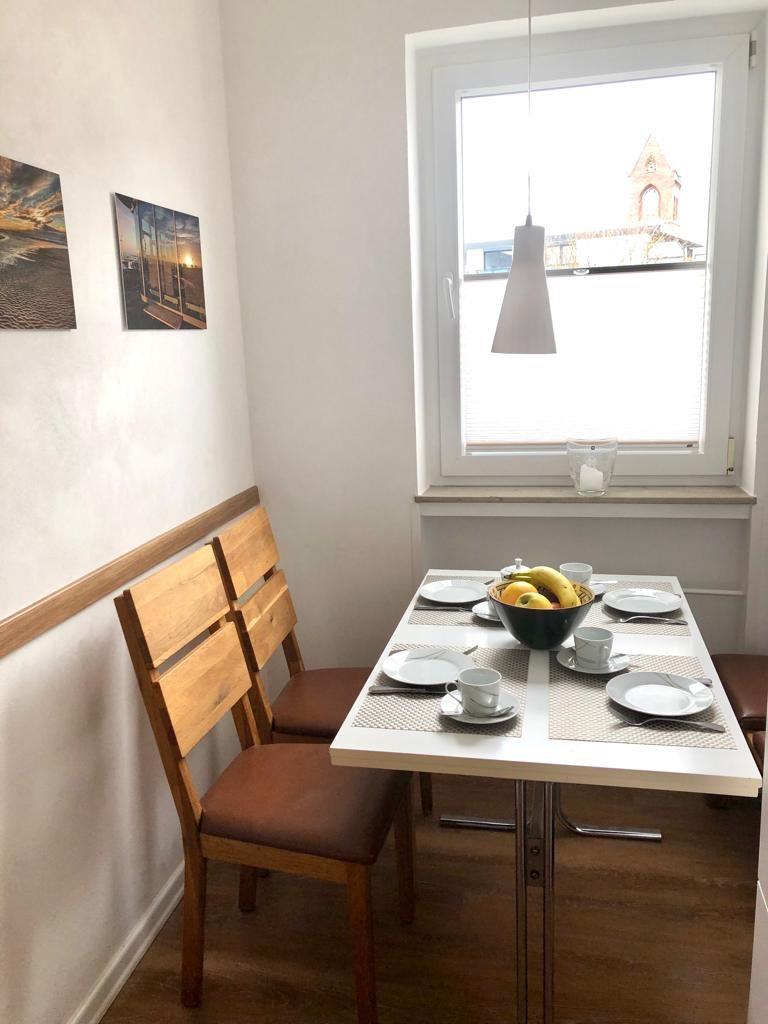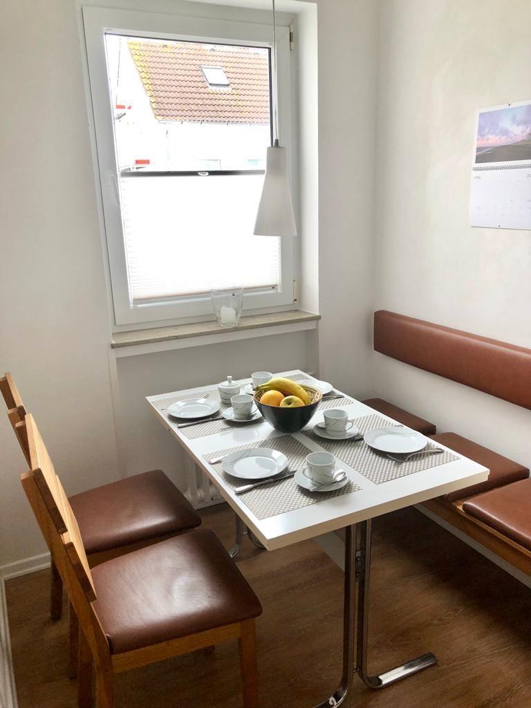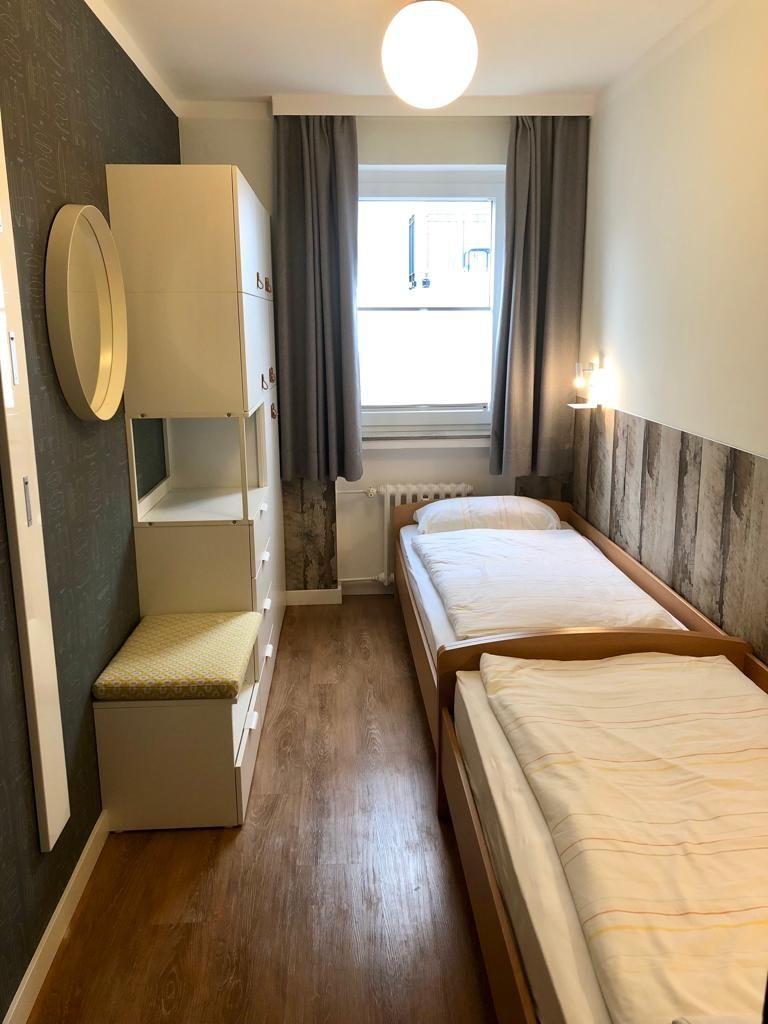 Die 3-Raum-Wohnung im 1. Obergeschoss besteht aus einem Wohnraum, einem Schlafzimmer mit Doppelbett einem Schlafzimmer mit zwei Einzelbetten, einer separaten Küche mit Essecke (Spülmaschine, Backofen, 4-Platten-Herd), einem
