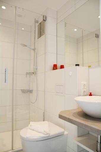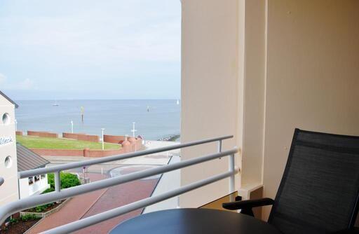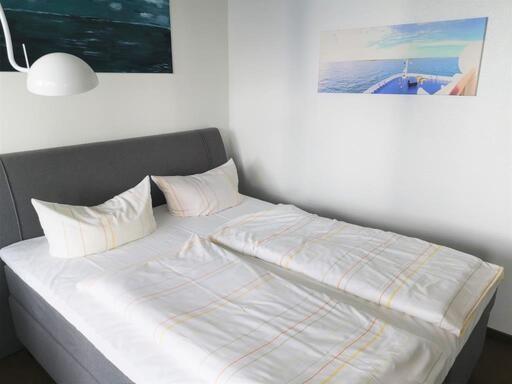 Das 1-Raum-Appartement liegt im 3. Obergeschoss (Aufzug) und bietet einen Wohn-/Schlafraum mit Boxspringbett, TV, integrierter Küchenzeile (2-Platten-Herd, Kühlschrank, 3-Sterne-Gefrierfach) und Zugang zum Süd-West-Balkon mit seitlicher Seesicht, eine kleine Diele sowie ein Duschbad mit WC. Nichtraucherwohnung.