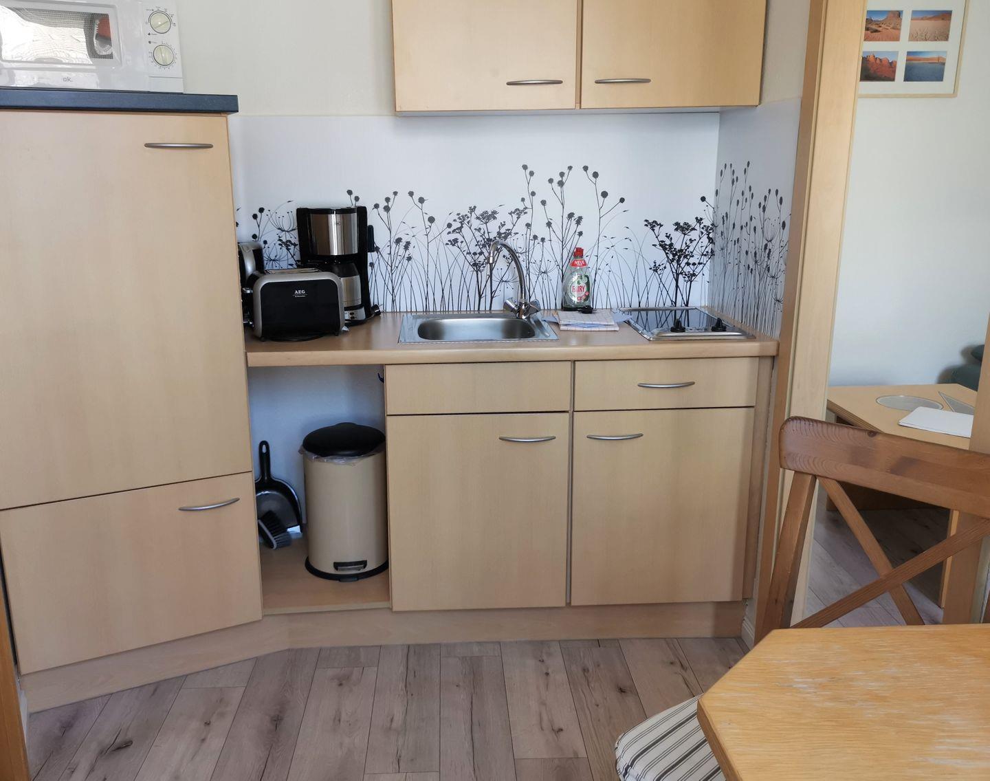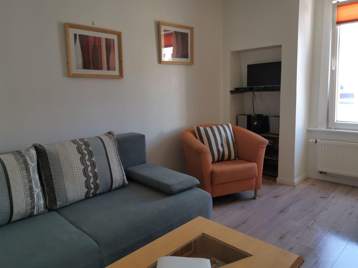 Die 1-Raum-Wohnung besteht aus einem Wohn-/Schlafraum mit Schlafsofa, einer kleinen Küche (2-Platten-Ceranfeld, Mikrowelle, kein Gefrierfach) mit Sitz- und Essgelegenheit sowie einem Duschbad mit WC. WLAN kostenfrei vorhanden.